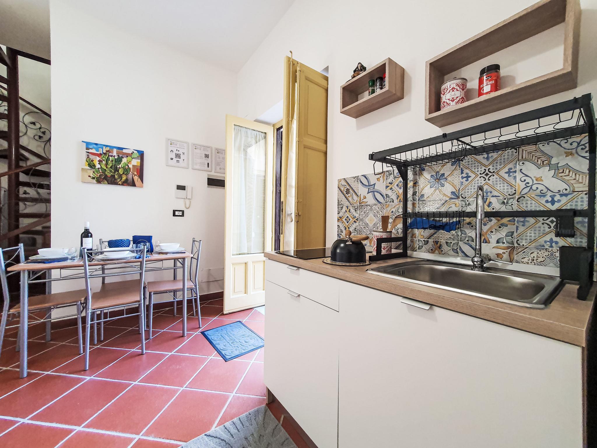 "Maya's Home Palermo", 3-room terraced house 50 m2 on 2 levels, on the ground floor. Renovated in 2024, comfortable and tasteful furnishings: living/dining room with 1 sofabed, TV, air conditioning and forced-air heating. Exit to the patio. Kitchenette (2 induction hot plates, toaster, kettle, microwave, electric coffee machine). Shower/bidet/WC. Upper floor: (spiral staircase), 1 double bedroom with TV, air conditioning and forced-air heating. 1 room with 1 wall-trunk bed and fan. Heating, forced-air heating, boiler (50 litres). Heating available only from 01.12. to 31.03, Heating not available in all rooms. Balcony furniture. Facilities: children's high chair, baby cot for up to 2 year olds, hair dryer. Internet (WiFi, free). Please note: apartment courtyard side. Maximum 1 pet/ dog allowed. Fire extinguisher. IT082053C2LEEEVOI6