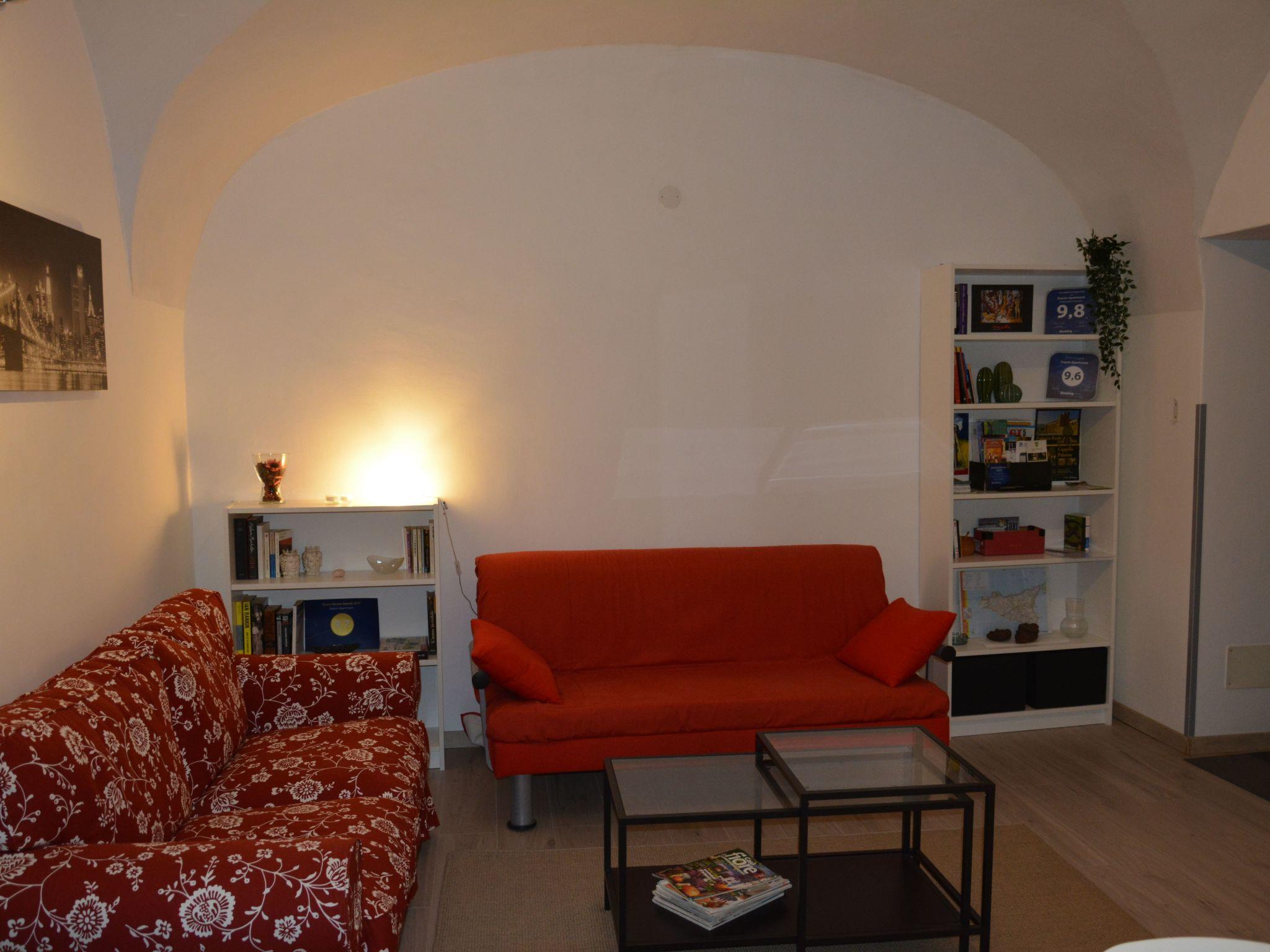 The style of the flat with its vaulted roof and the modern and functional furnishings form a pleasant stylistic contrast.