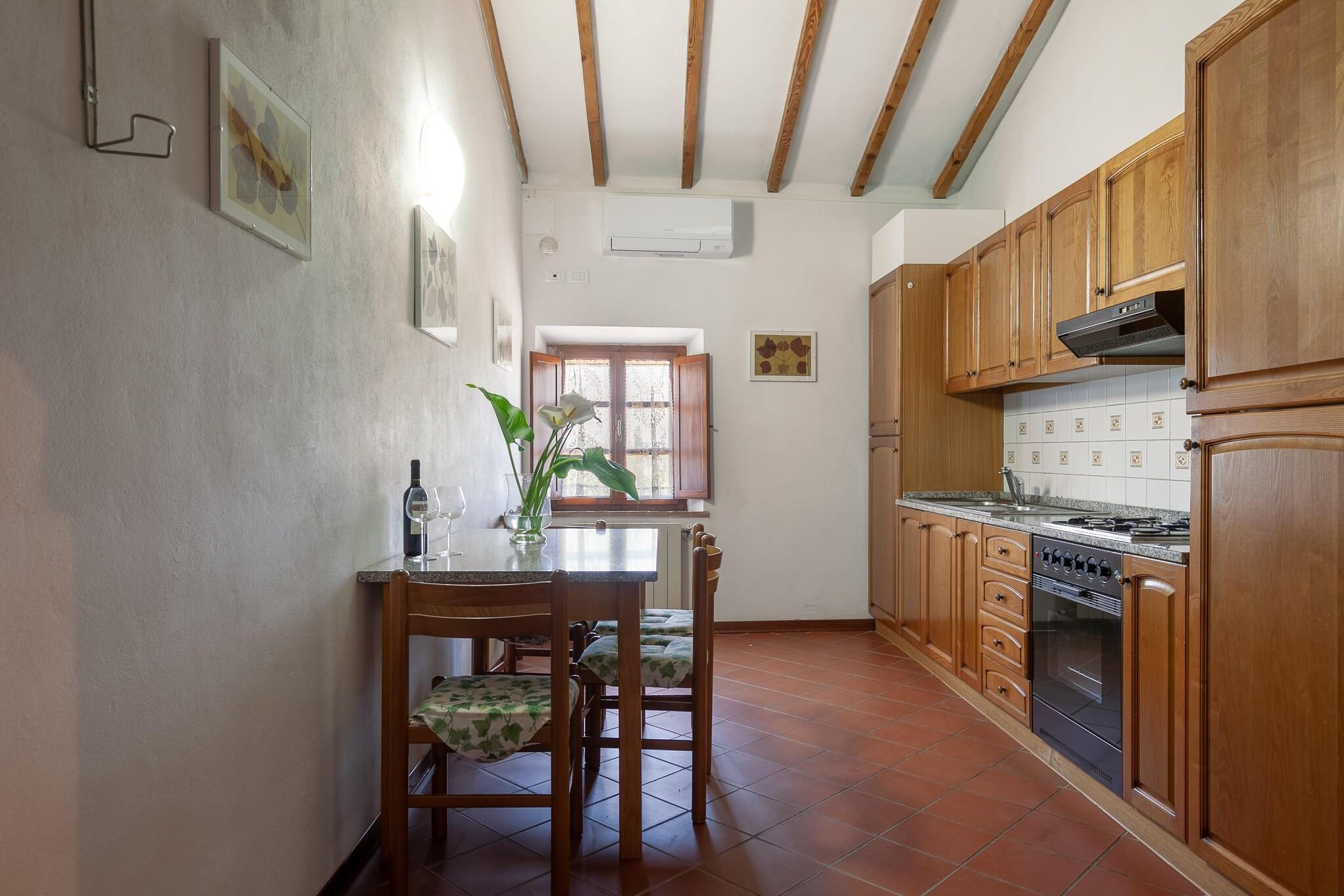 Denne indbydende lejlighed i Fabbrica ligger midt i bølgende grønne bakker og tilbyder den perfekte blanding af rustik karakter og komfort. Det åbne køkken og opholdsstue skaber et hyggeligt sted at slappe af, mens mezzaninen med ekstra senge tilføjer et strejf af charme. Udenfor er en velholdt have med grillhjørne ideel til afslappende eftermiddage, og den fælles swimmingpool er perfekt til en forfriskende dukkert under den toscanske sol. En børneseng er tilgængelig på forespørgsel, hvilket gør dette til et familievenligt tilflugtssted. Kun 9 km væk ligger den fortryllende landsby Peccioli – fyldt med kunsthåndværkerbutikker og middelalderlig karakter. Lejligheden er en ideel base for at udforske Toscanas ikoniske destinationer, herunder Pisas Skæve Tårn, Firenzes kunstneriske hjerte og San Gimignano's dramatiske skyline. Volterras etruskiske charme og Sienas gotiske skønhed er også inden for rækkevidde. For friluftsentusiaster snor sig naturskønne cykelstier gennem cypressbeklædte veje, og strandene ved den tyrrhenske kyst ligger kun en kort køretur væk. Toscanske traditioner kommer til live her – ikke kun i landskabet, men også på tallerkenen. Hver mandag kan gæsterne nyde en autentisk toscansk middag på stedet, og torsdage er reserveret til brændefyrede pizzaaftener. Lokale vingårde tilbyder smagsprøver på forespørgsel, så du kan prøve Chianti og andre regionale vine. I Peccioli kan du prøve "La Vecchia Carraia" for solide lokale retter eller "Pasticceria Ferretti" for uforglemmelige desserter. Enkel, smagfuld og forankret i... tradition – dette er Toscana, når det er allerbedst.