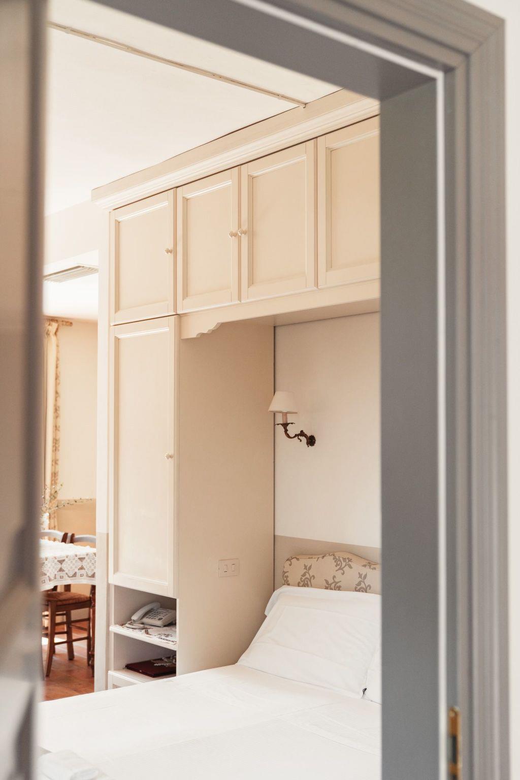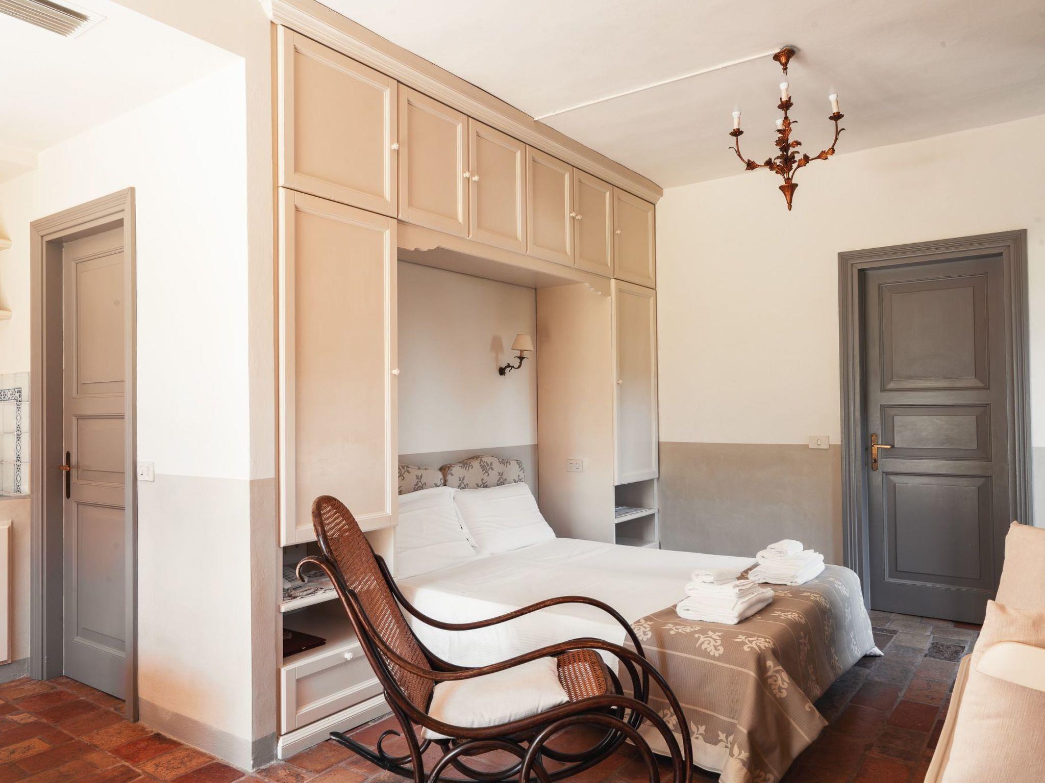 The two-room flat, located on the ground floor of the old barn, consists of two main rooms and is tastefully furnished, retaining some original details. The first room is used as a living area, with a country-style kitchen, a wooden and crystal dining table and a cosy sleeping corner with a double bed set under a built-in wardrobe. The second room is a real double bedroom, reached by passing through a door and up three steps, designed to provide additional privacy and comfort. There are also two bathrooms, practical and functional, making the flat ideal for two couples or a family. A window with original masonry grilles, once used to ventilate the grain, now provides an evocative play of light and shade. Delicate furnishings with matching fabrics and antique chandeliers create a harmonious atmosphere. Outside, a charming relaxation area under a centuries-old olive tree invites you to sip an aperitif or dine with family or friends, making every stay an unforgettable experience.