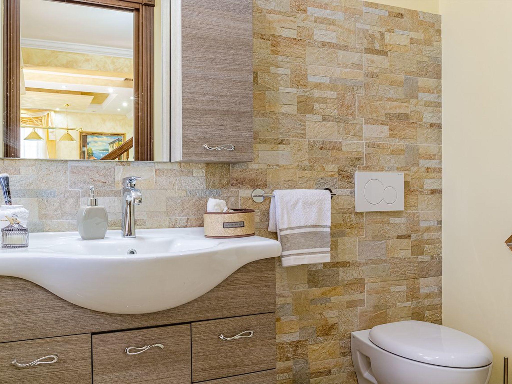 The property, equipped with every comfort and accessory, is spread over three levels: the ground floor houses a large living room with billiard table, a bathroom and a large kitchen with dining area. The first floor, which is attic, houses two communicating bedrooms with access to a large panoramic terrace; this floor also has a complete bathroom. On the basement floor there are two more bedrooms, one with a double bed, a small bedroom with a double bed, a large en-suite bedroom with a double bed and a single bed and a bedroom with two single beds.