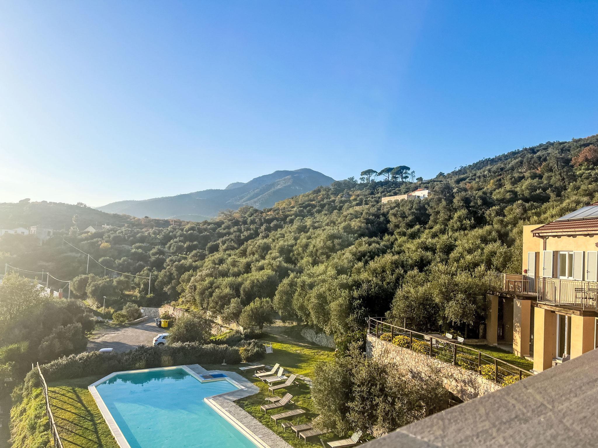 Beautiful residence "I Castellari", 2 storeys, surrounded by trees and fields. 9 apartments in the residence. 700 m from the centre of Pietra Ligure, 4 km from the centre of Finale Ligure, in a secluded, quiet, sunny position on top of a hill, 700 m from the sea. For shared use: park 2'000 m2, well-kept garden, swimming pool (15 x 7 m, seasonal availability: 01.Apr. - 01.Nov.) with internal staircase. Outdoor shower. In the complex: reception, bar, breakfast room, lounge, storage room for bicycles, sun terrace, washing machine (for shared use). Parking (for 15 cars). Grocery, restaurant, bakery, café, bicycle rental, bus stop 700 m, railway station "Pietra Ligure" 3 km. Nearby attractions: Finalborgo 8 km. Please note: the photograph shows a typical example.