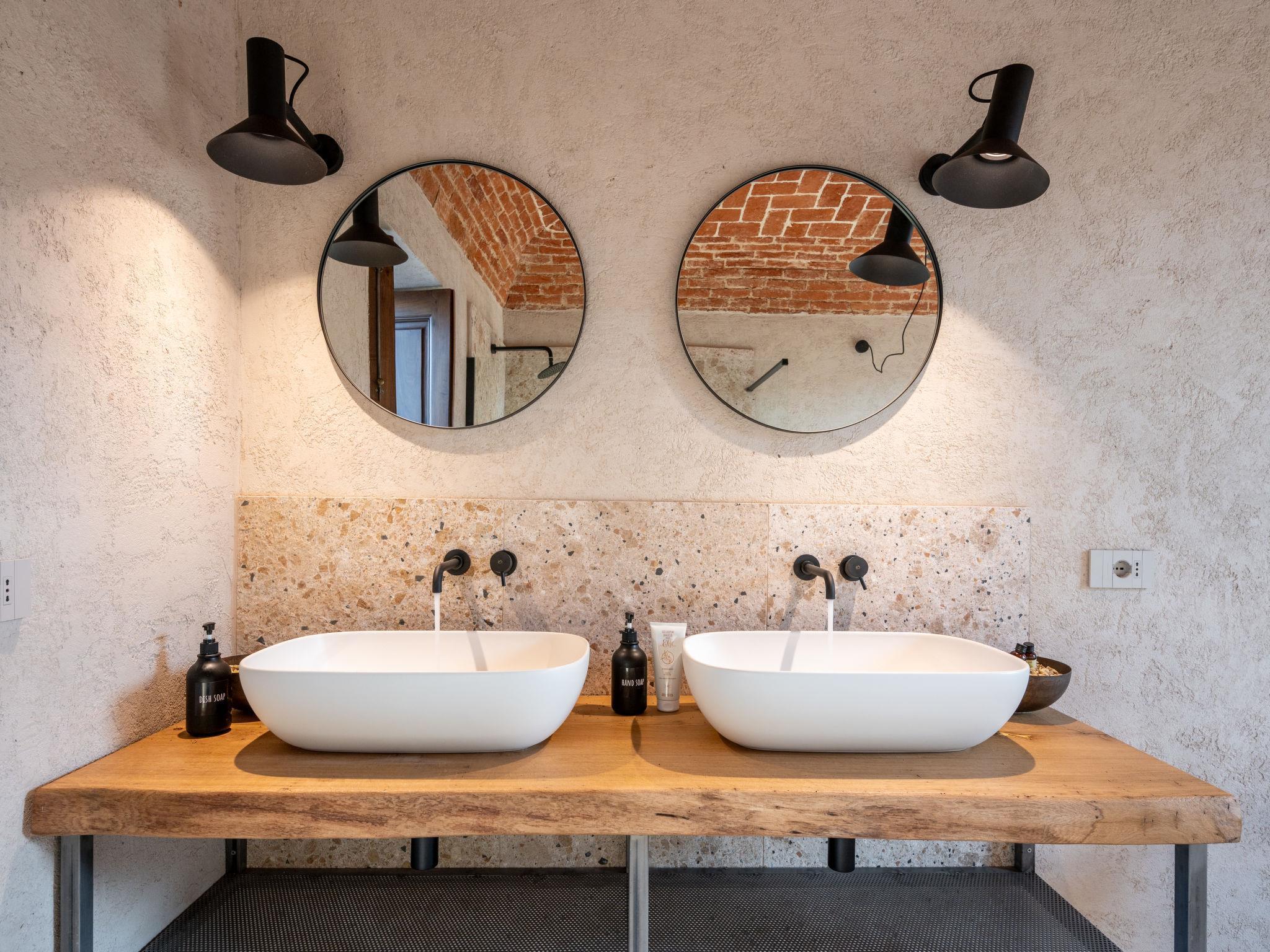 "We Rural", 7-room villa 500 m2 on 2 levels. Modern and stylish furnishings: entrance hall. Open living/dining room with panoramic window with dining table. Exit to the garden. 1 room 35 m2 with 1 double sofabed, 1 double bed, kitchen corner, bath/shower/bidet/WC, double hand-basin and TV. Kitchen (oven, dishwasher, 8 induction hot plates, toaster, kettle, microwave). 2 showers/WC, double hand-basin. Electric heating, air-conditioning. Heating available only from 15.10. to 15.04. Upper floor: (spiral staircase), 1 room 26 m2 with 1 double sofabed, 1 double bed, shower/bidet/WC and TV. 1 double bedroom with shower/bidet/WC and TV. 1 double bedroom with shower/bidet/WC and TV. (exterior staircase), 1 double bedroom with panoramic window with shower/bidet/WC, Hammam-Shower and TV. Deck chairs. Facilities: washing machine, baby cot for up to 2 year olds, hair dryer. Internet (WiFi, free). Please note: non-smoking house. A double bedroom with bathroom is accessible only by external staircase. IT001197B9H2JMCDDL