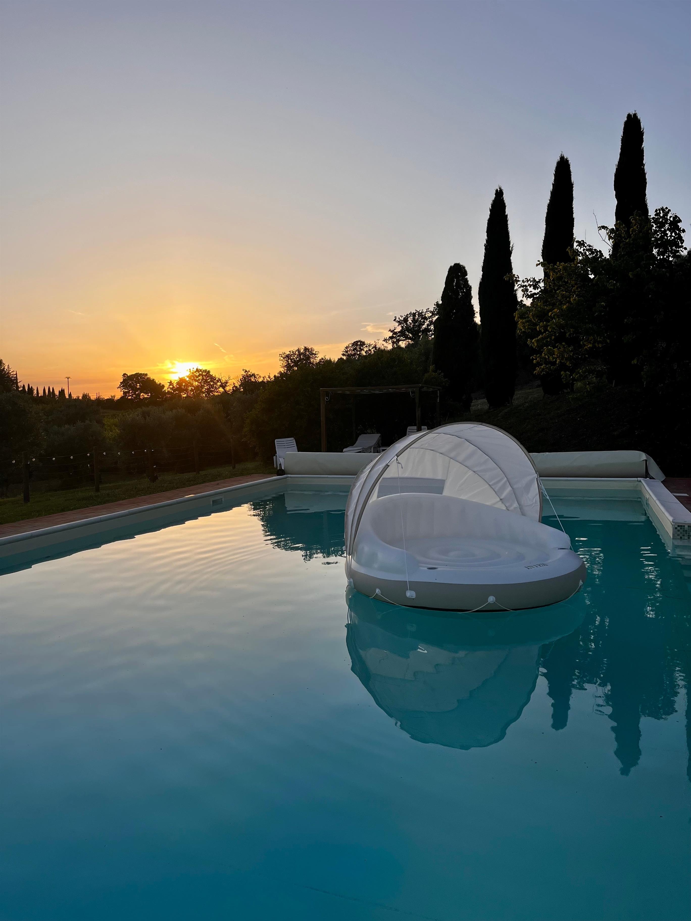 Lassen Sie die Seele baumeln in unserem 15x8 Meter großen, sonnigen und je nach Jahreszeit beheizten* Panoramapool, mit römischer Treppe und geniessen Sie dort oder in den Sonnenliegen den Ausblick auf die traumhafte Hügellandschaft des faszinierenden Val di Cecina.