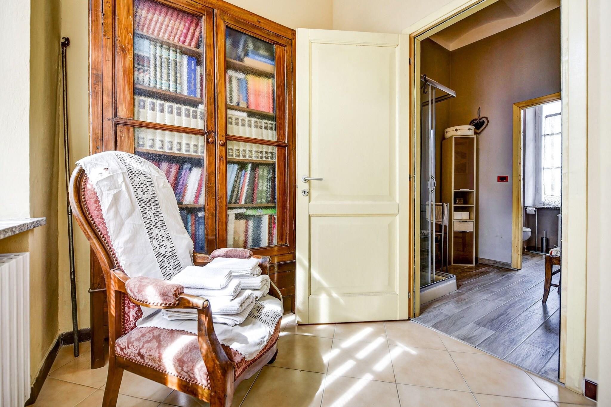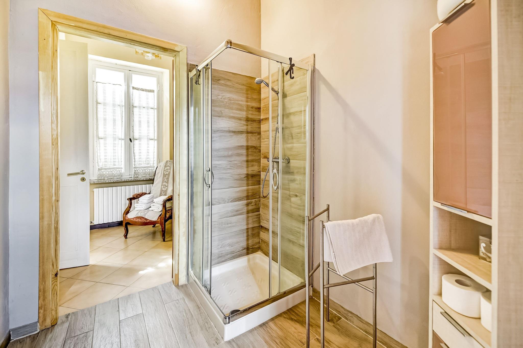 På 1. etage: (gang, Stue(dobbeltsovesofa, spisebord, sofahjørne), åbent køkken(Fjernsyn, kogeplade, elkedel, emhætte, ovn, køle-fryseskab, håndvask), soveværelse(dobbeltseng eller 2 enkeltsenge Senge, Fjernsyn), badeværelse(bruser, håndvask, toilet, bidet), terrasse(privat, indhegnet, 30 m2), havemøbler) vaskerum (vaskemaskine(deles med andre gæster)), sal(deles med andre gæster)(spisebord, pejs, kakkelovn, håndvask), opholdsrum(deles med andre gæster), have(deles med andre gæster), havemøbler, grill(deles med andre gæster), parkering