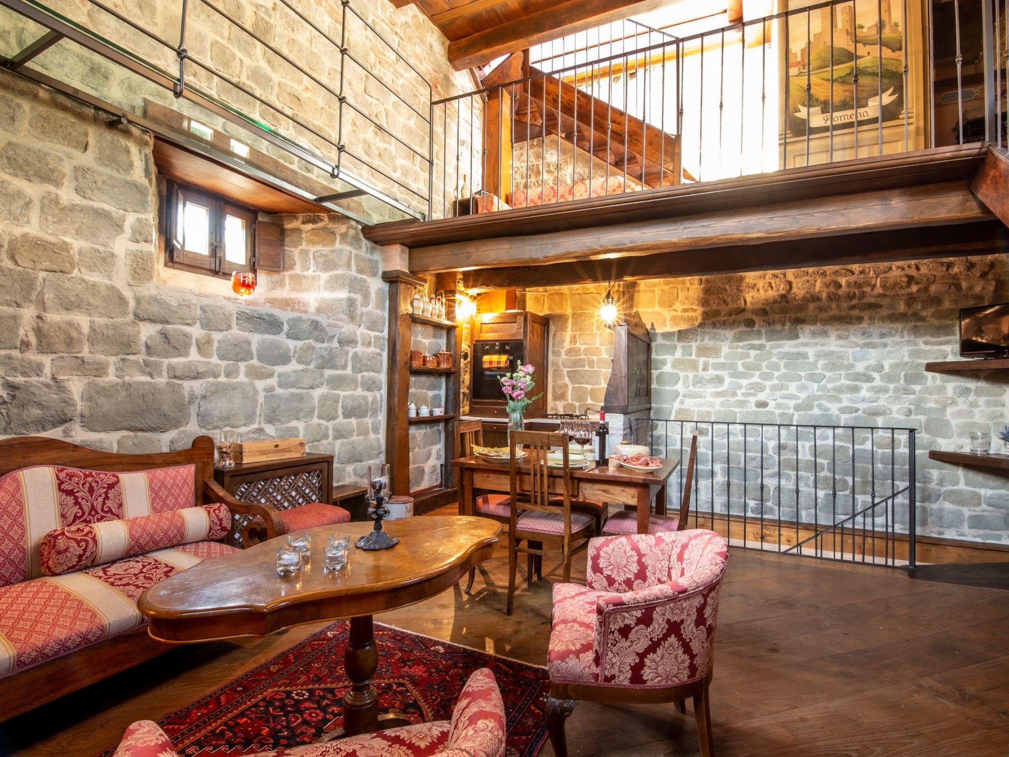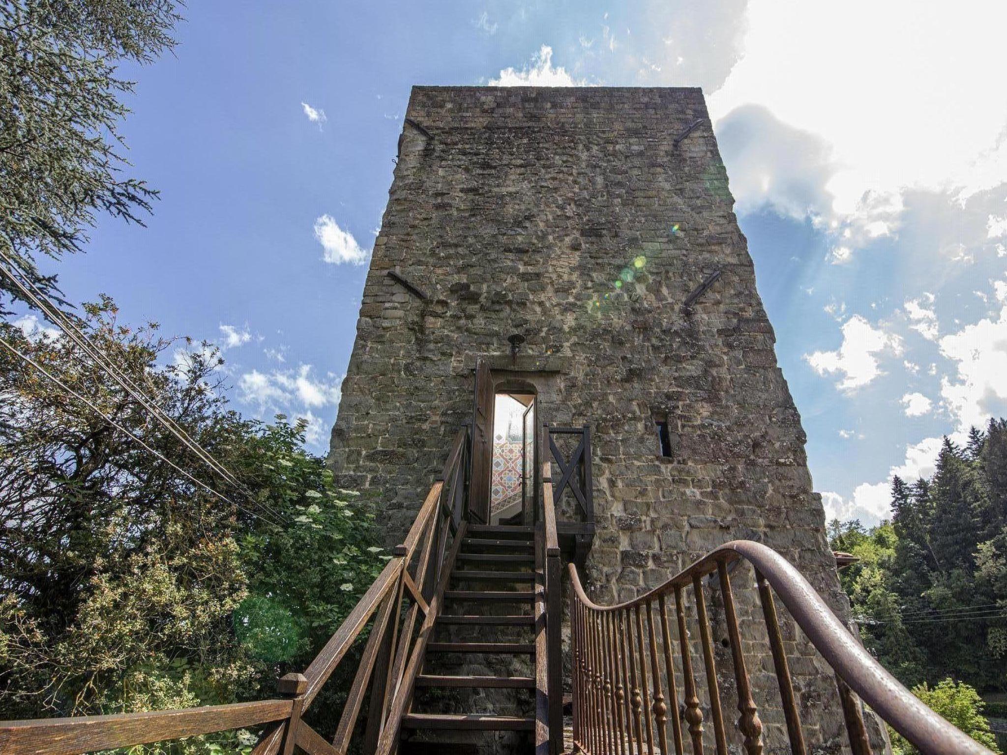 Here, you can spend an enchanting stay and also organise your wedding immersed in history: after careful restoration, a beautiful independent residence with every comfort and air conditioning has been created. The medieval tower is spread over three floors over an area together with the terrace of approximately 100 square metres. Access is on the 1st level via the typical wooden staircase (33 steps) and leads into the hallway equipped with a clothes hanger and entrance to the master bedroom (20 sq m) with majestic walls that have been skilfully built and restored, enriched with decorations reminiscent of the feudal period. In each wall of the cosy room there are typical slits overlooking the Arno river and the garden. Inside the room there is access to the private bathroom (4 sq. m.), created in keeping with the architectural forms of the structure and equipped with WC, bidet, shower and antique marble washbasin. From the hallway a staircase leads to the bright living room (28 sqm) with antique sofa, armchairs, satellite TV, dining table with four chairs, storage room and characteristic wooden kitchen equipped with: fridge-freezer, dishwasher, oven, two burners and antique marble sink. From the living room, a staircase with nine steps leads to the loft (10 sq. m.) with a comfortable single bed and a second bathroom enriched with external decorations showing the various castles of the Valley and equipped with WC, bidet and washbasin. From the loft a few steps lead to the panoramic terrace. Internet access must be booked (for a fee).
