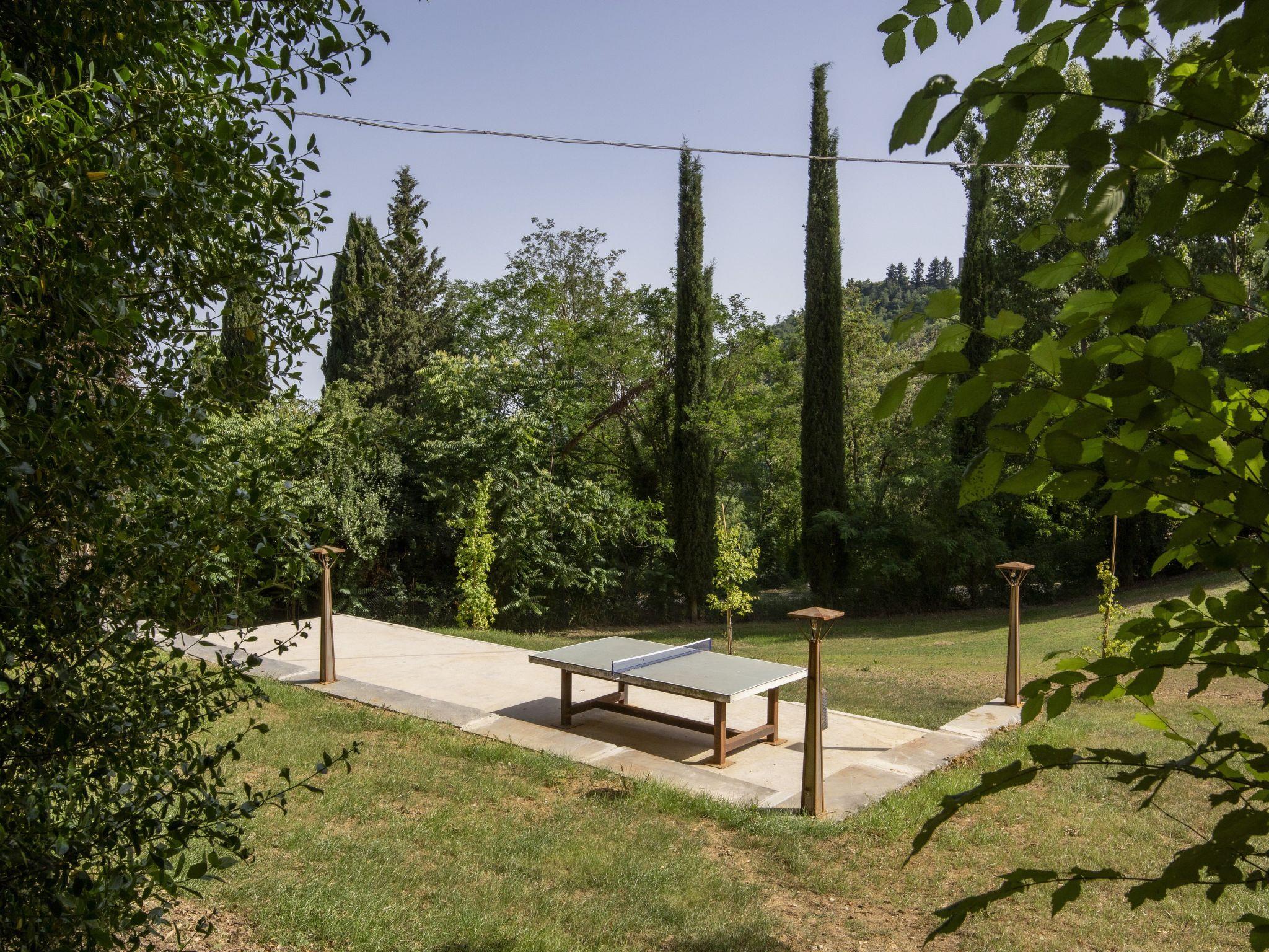 At the back of the house you can enjoy from the terrace with garden furniture and gazebo a beautiful view of the valley and the medieval castles of Poppi, Romena and Porciano. Approximately 40 m from the house is a large circular fenced swimming pool (water surface approx. 180 m², depth: 1.50 m; open in mid- and high season, with indoor jacuzzi) with night lighting, games for children and adults, with sun umbrellas, deck chairs with cushions and outdoor shower with hot water. Next to the pool is a summer kitchen with table, brick barbecue, and worktop.