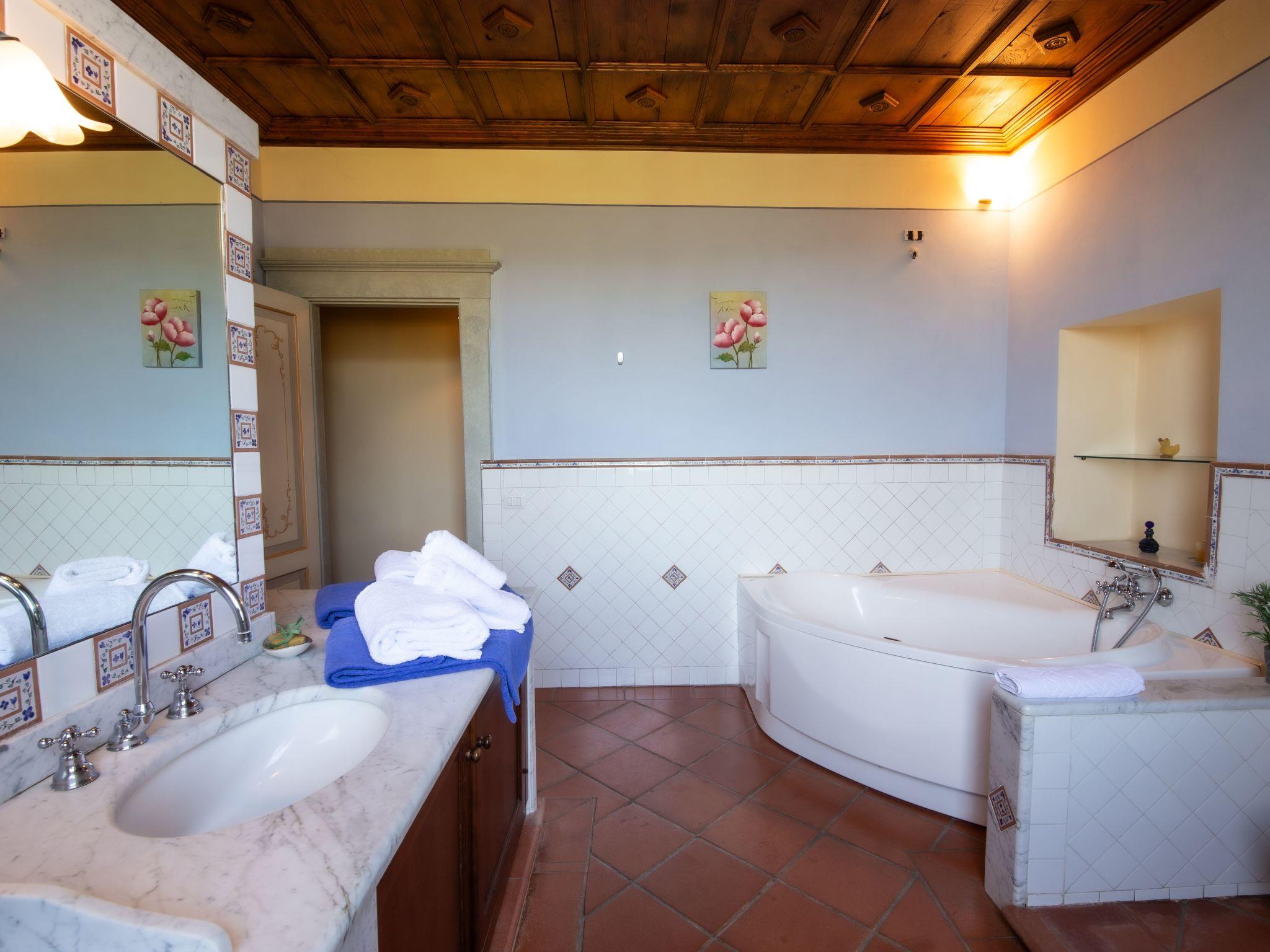 The living area of approximately 300 m² is on two levels. On the ground floor there is an entrance hall; a living room with living room and fireplace; a large dining room, open to the living room with living room and fireplace and with an exit to the outside. On the ground floor there is also a kitchen with access to the outside. The kitchen is equipped with 4 burners, oven, dishwasher, small freezer and a coffee machine. Also on the ground floor is a bedroom with a double bed, with en-suite bathroom with shower and WC, a second bedroom with a double bed, with en-suite bathroom with shower, and WC, also on this floor a service bathroom. The stairs from the hall lead to the first floor. Towards the stairs there is a large open living room with balcony; a corridor; 4 double bedrooms with 4 en-suite bathrooms with shower, WC, sink; 1 double bedroom with large bathroom with bath, shower, 2 sinks and WC. During the restoration of the old architectural style, the architectural details were highlighted. The villa is furnished with some antique furniture, terracotta floors, coffered wooden beamed ceilings. The villa is equipped with satellite TV, receiver/ Cassette/CD player. There is a washing machine in a separate cottage near the house.