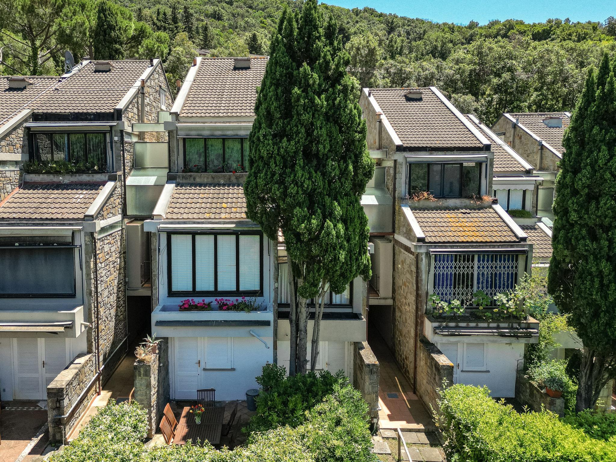 "Le Mandrie", 4-room terraced house 70 m2 on 2 levels. Object suitable for 4 adults + 2 children. Practical and cosy furnishings: living/dining room with dining table. Exit to the terrace. Open kitchen (oven, dishwasher, 4 gas rings, kettle, microwave, electric coffee machine). Exit to the terrace. Shower/bidet/WC. Upper floor: (spiral staircase) small living room with TV. 1 double bedroom with panoramic window, without wardrobe. Walk-through room with 1 bed and 1 pull-out bed. 1 double bedroom with panoramic window. Shower/bidet/WC. Gas heating. Heating available only from 01.11. to 15.04. Terrace. Terrace furniture. Beautiful view of the swimming pool, the forest and the ocean. Facilities: washing machine, mosquito net, baby cot for up to 2 year olds (extra), hair dryer. Internet (WiFi, free). Parking. Please note: maximum 1 pet/ dog allowed. Private entrance. The first floor can also be reached from an external entrance without stairs (the house is built on an embankment and has two entrances at ground level). No mandatory extra charges to be paid on-site except for local tax. Bedlinen, towels, final cleaning and all energy costs are included. IT053006C2TYDFYYES