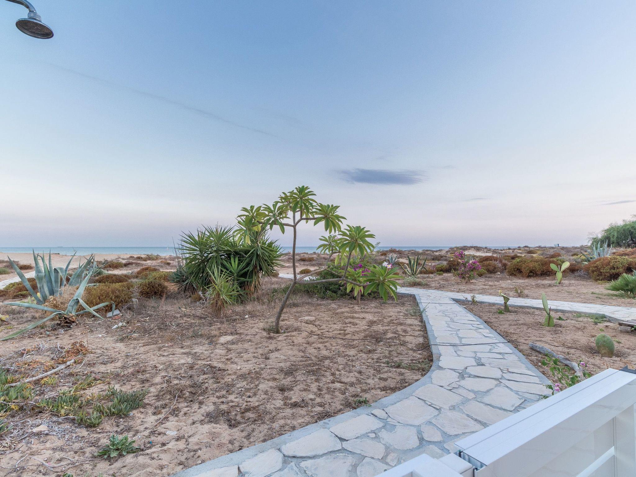 In front of the terrace, on the sand, is a sandy garden of succulent plants and flower beds.