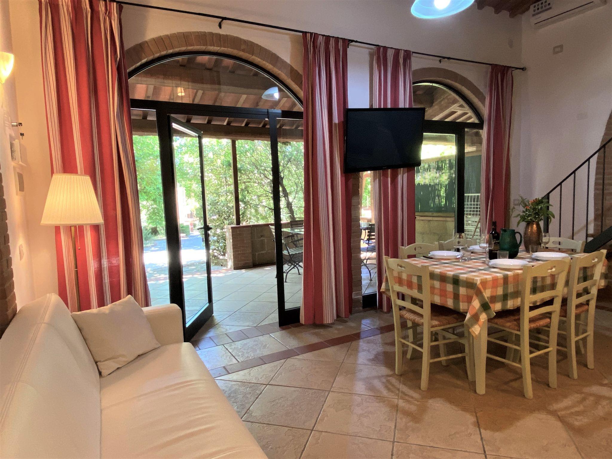 Child friendly, rustic resort, surrounded by trees, meadows and fields. 6 houses in the residence. 40 apartments in the residence. 3 km from the centre of Riparbella, in a secluded position on top of a hill, 15 km from the sea, in the countryside. For shared use: property 2000'000 m2 with plants and trees, meadow, swimming pool kidney-shaped (300 m2, seasonal availability: 11.May. - 21.Sep.). Children's pool, outdoor shower. In the complex: reception, bar, bistro, WiFi, washing machine (extra) (for shared use). Bread roll service. Parking on the premises. Shop 3 km, grocery 3 km, supermarket 13 km, restaurant 1 km, bakery 3 km, bus stop "Apparita 1" 3 km, sandy beach "Cecina Mare, Vada" 15 km. Nearby attractions: Volterra 35 km, Pisa 65 km, Firenze 97 km. The photo is just an example. Obligation to wear bathing caps. WiFi available only in the bar and swimming pool area.