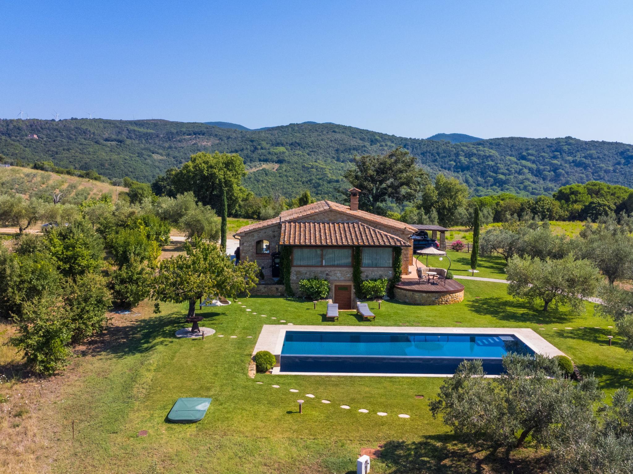 "rustico" cottage "Podere Boscherini", surrounded by trees and meadows. Property composed of main house and outbuilding 3 km from the centre of Riparbella, in a secluded, elevated position, 14 km from the sea, 14 km from the beach. Private: well-kept garden (not fenced), lawn for sunbathing, swimming pool (12 x 6 m, depth 120 - 200 cm, seasonal availability: 01.Apr. - 31.Oct.) with internal staircase. Outdoor shower, garden furniture, barbecue. Linen change (suppl. charge extra). Towel change (suppl. charge extra). Parking at the house. Shop 4 km, grocery 4 km, restaurant 2 km, bus stop "La Melatina" 2 km, thermal baths "Calidario" 45 km. Marina 16 km, golf course (9 hole) 20 km. Nearby attractions: Bolgheri 25 km, Volterra 30 km, Pisa 60 km, Firenze 100 km. The owner does not accept any youth groups.