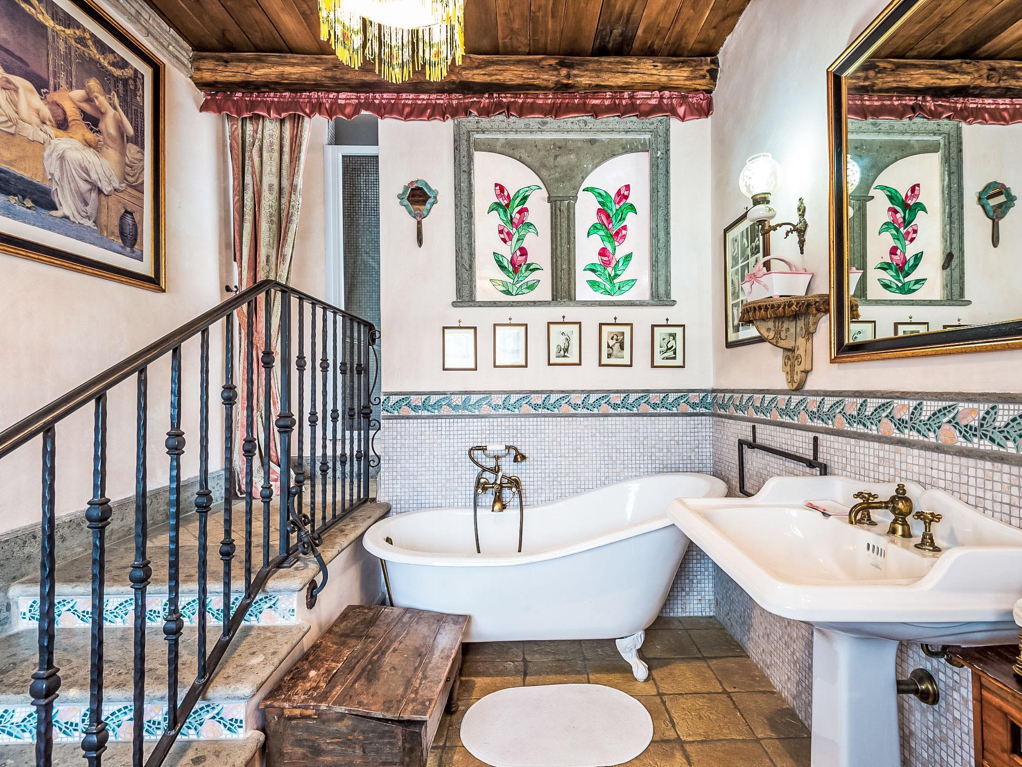 6-room villa 420 m2 on 3 levels. Very comfortable and tasteful furnishings: living room with open-hearth fireplace. Billiard room. 1 room with 1 double sofabed and 1 double bed. Dining room. Large, open kitchen 30 m2 (5 hot plates, oven, dishwasher, toaster, microwave, freezer, electric coffee machine) with open-hearth fireplace, dining table and TV. Shower/bidet/WC, 2 sep. WC's. Upper floor: 1 double bedroom with shower/bidet/WC. Exit to the balcony. 1 large room with 1 double bed and bath/shower/bidet/WC. Exit to the balcony. 1 double bedroom. (open staircase) open gallery with sloping ceilings with 1 bed. Shower/bidet/WC. 2nd upper floor: (spiral staircase), 1 large room with panoramic window with 3 beds and air conditioning. Living room with TV and flat screen. Shower/WC. Heating. Very beautiful panoramic view of the lake and the valley. Facilities: washing machine, iron, hair dryer. Internet (WiFi, free). The ground floor rooml with 1 double bed, 1 double sofa bed, is annex by the pool and it kas also a shower / WC and separate WC. Kitchenette. IT058086C2MA4YS7VB