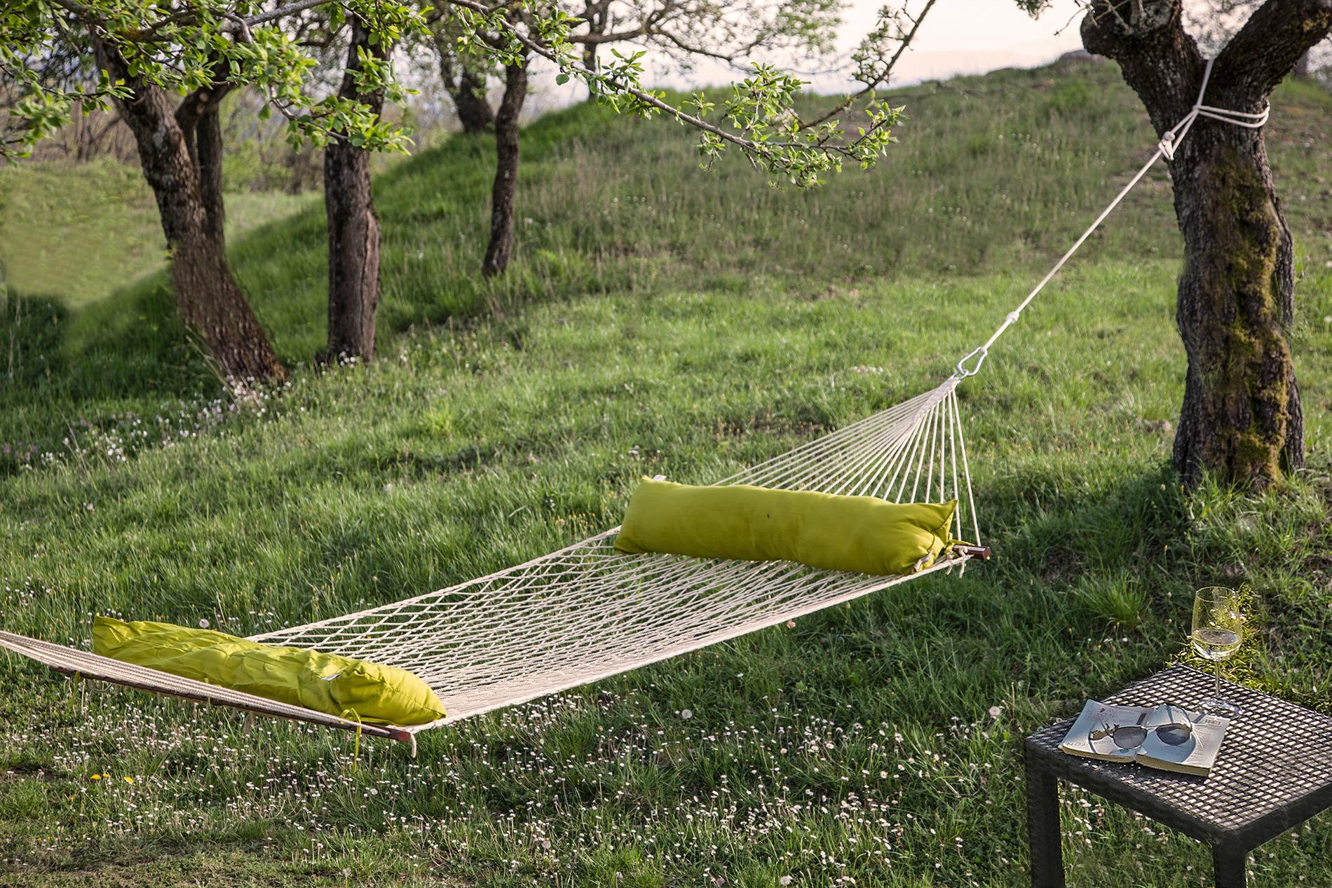 Der Pool erfrischt an den warmen Sommertagen und eine Hängematte verführt bei gleichmäßigen schaukeln zu Träume.