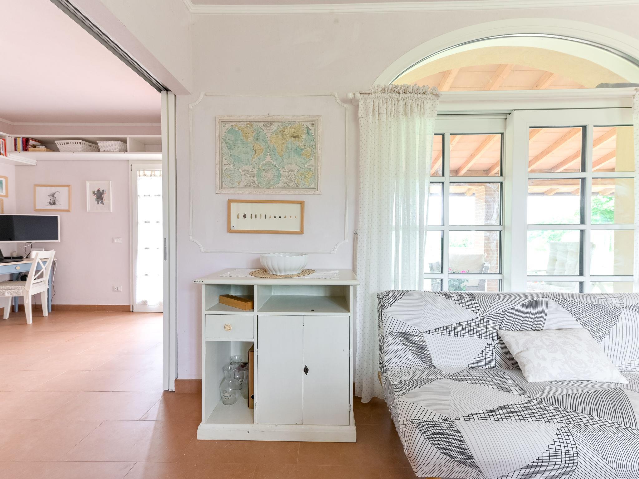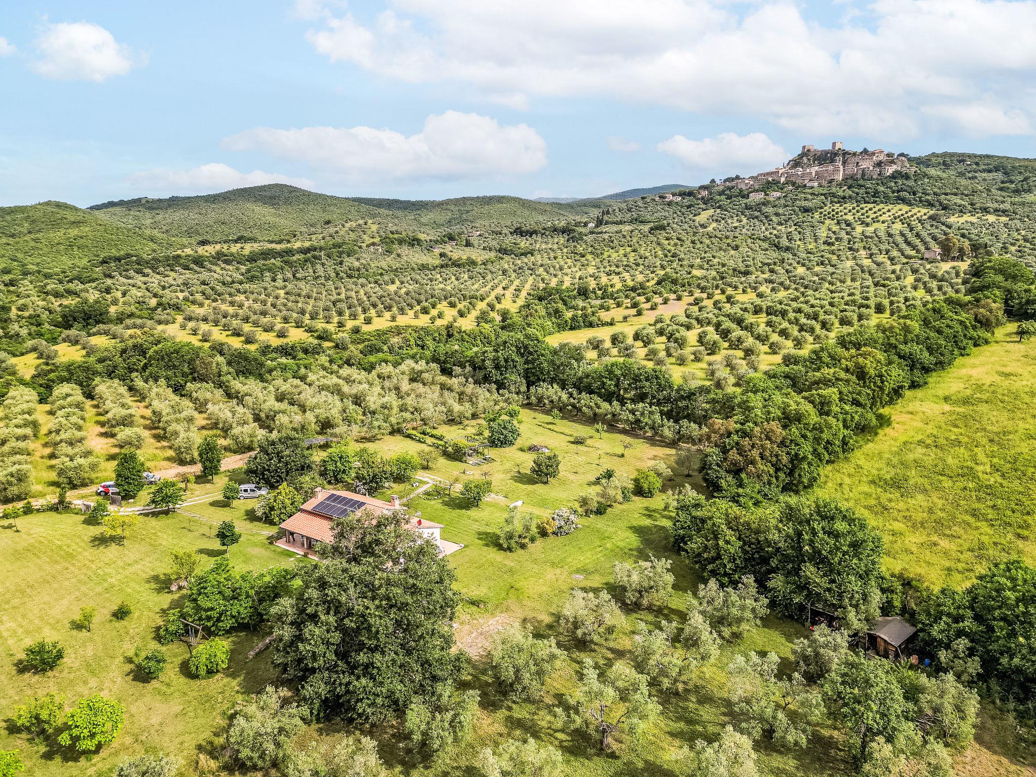 3-room house 120 m2, on the ground floor. Spacious and bright, tasteful furnishings: large living/dining room with 1 double sofabed, open-hearth fireplace, TV and air conditioning. Exit to the garden, to the terrace. 1 room with 1 french bed (140 cm). Exit to the garden. 1 large room with 1 double sofabed and shower/bidet/WC. Exit to the garden. Open kitchen (oven, dishwasher, 4 induction hot plates, toaster, electric coffee machine). Exit to the terrace. Shower/bidet/WC. Wood heating, forced-air heating. Large terrace 50 m2, roofed, patio, porch. Terrace furniture, barbecue. Very beautiful view of the countryside and Montemassi. Facilities: washing machine, hair dryer. Internet (WiFi, free). Parking (roofed). Please note: non-smokers only. Maximum 3 pets/ dogs allowed. Private entrance, smoke alarm, fire extinguisher. IT053021C2XD6DS6YY