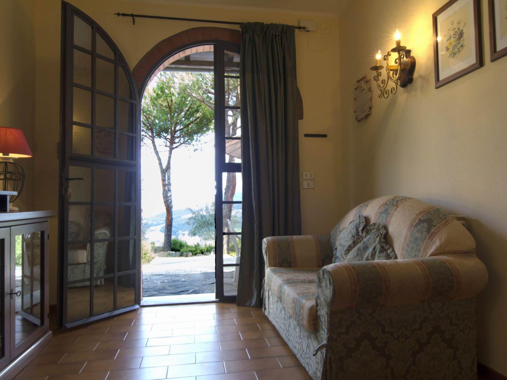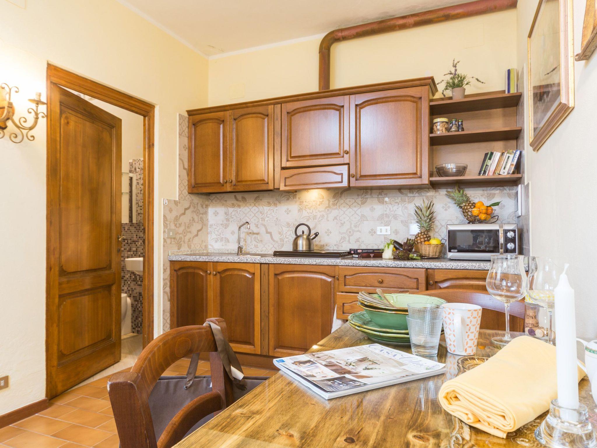 Ground floor, 30 m²; living-dining room with kitchenette (4 hotplates, microwave), bedroom with double bed, shower with WC, private outdoor area, panoramic terrace; for 2 persons. Air-conditioning in the living room, which works well for the entire'appartamento.