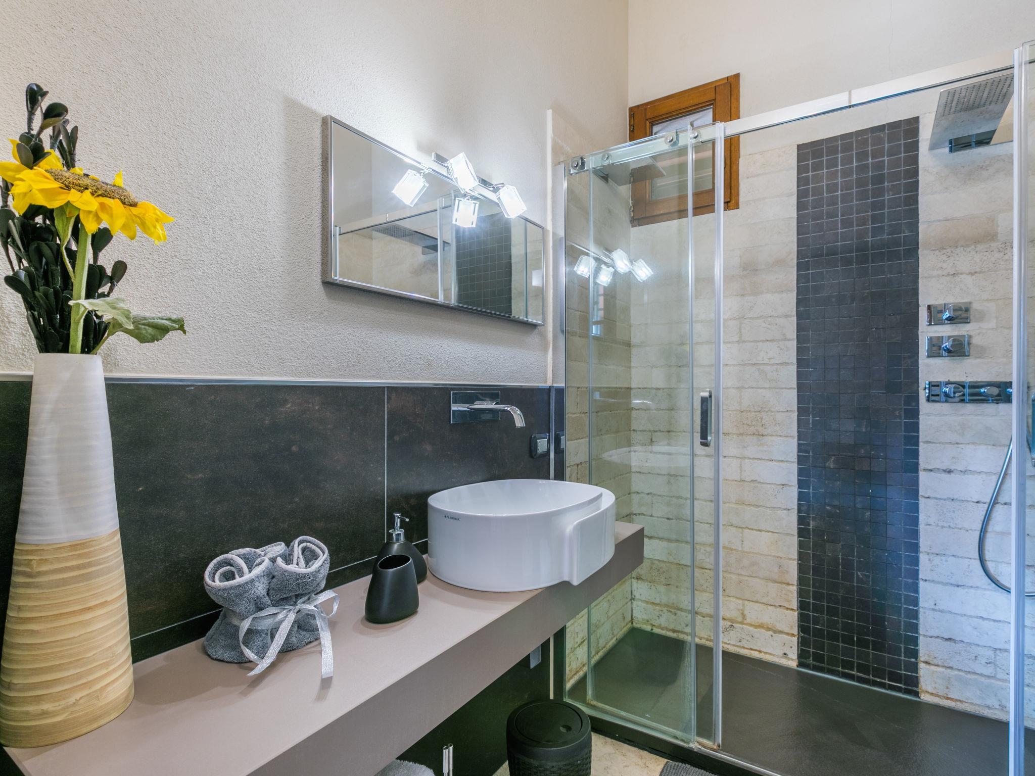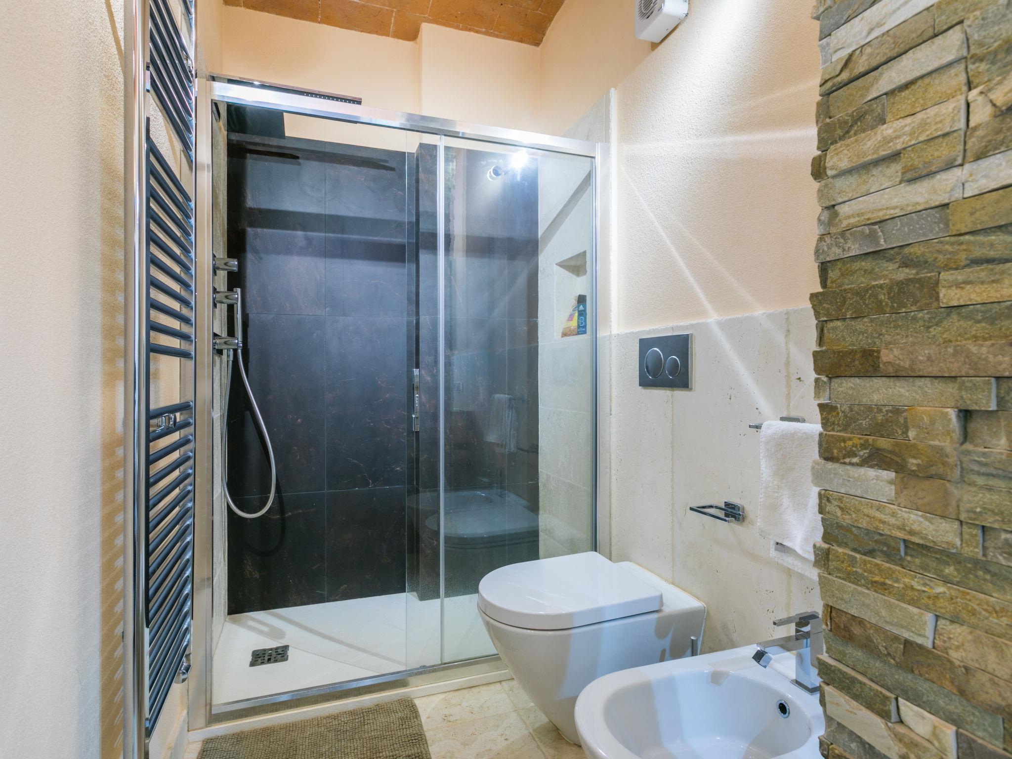 6-room house 160 m2 on 2 levels, on the ground floor. Rustic and tasteful furnishings: living room with open-hearth fireplace, satellite TV and international TV channels. 2 double bedrooms. 1 room with 2 beds. Shower/bidet/WC. On the lower ground floor: 1 room with 1 french bed (140 cm). Living/dining room with open-hearth fireplace and satellite TV. Exit to the garden. Kitchenette (oven, dishwasher, 4 induction hot plates, toaster, freezer, electric coffee machine). Shower/bidet/WC. Electric heating, air-conditioning. Natural stone floors. Terrace 45 m2, roofed terrace 20 m2, roofed. Terrace furniture, barbecue, deck chairs (8). Panoramic view of San Miniato. Facilities: washing machine, dryer, iron, children's high chair, baby cot for up to 2 year olds, hair dryer. Internet (WiFi, free). Parking (roofed, fenced 3 cars) at the house. Please note: suitable for families. Non-smoking house. Private entrance. Both bathrooms have a shower with a relaxing waterfall. On the lower floor there is a laundry room equipped with a sink, washing machine, dryer and an additional refrigerator. IT050032C2785S9K7F