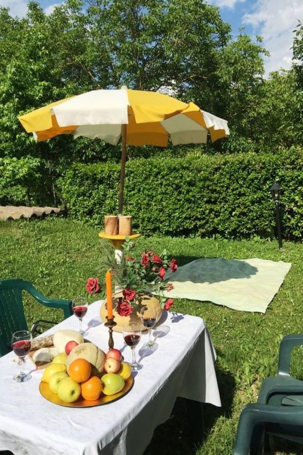 Independent entrance from the private garden furnished with a sun umbrella, table and chairs for eating outside and enjoying the peace and quiet of the place. furnished with a table, chairs and sun umbrella. The flat is about 20 metres from the swimming pool (15x7 - h 1.45) with whirlpool bath surrounded by greenery and you can enjoy a particular view of the surrounding hills. Nearby there are many paths and small bends along the Candigliano river.