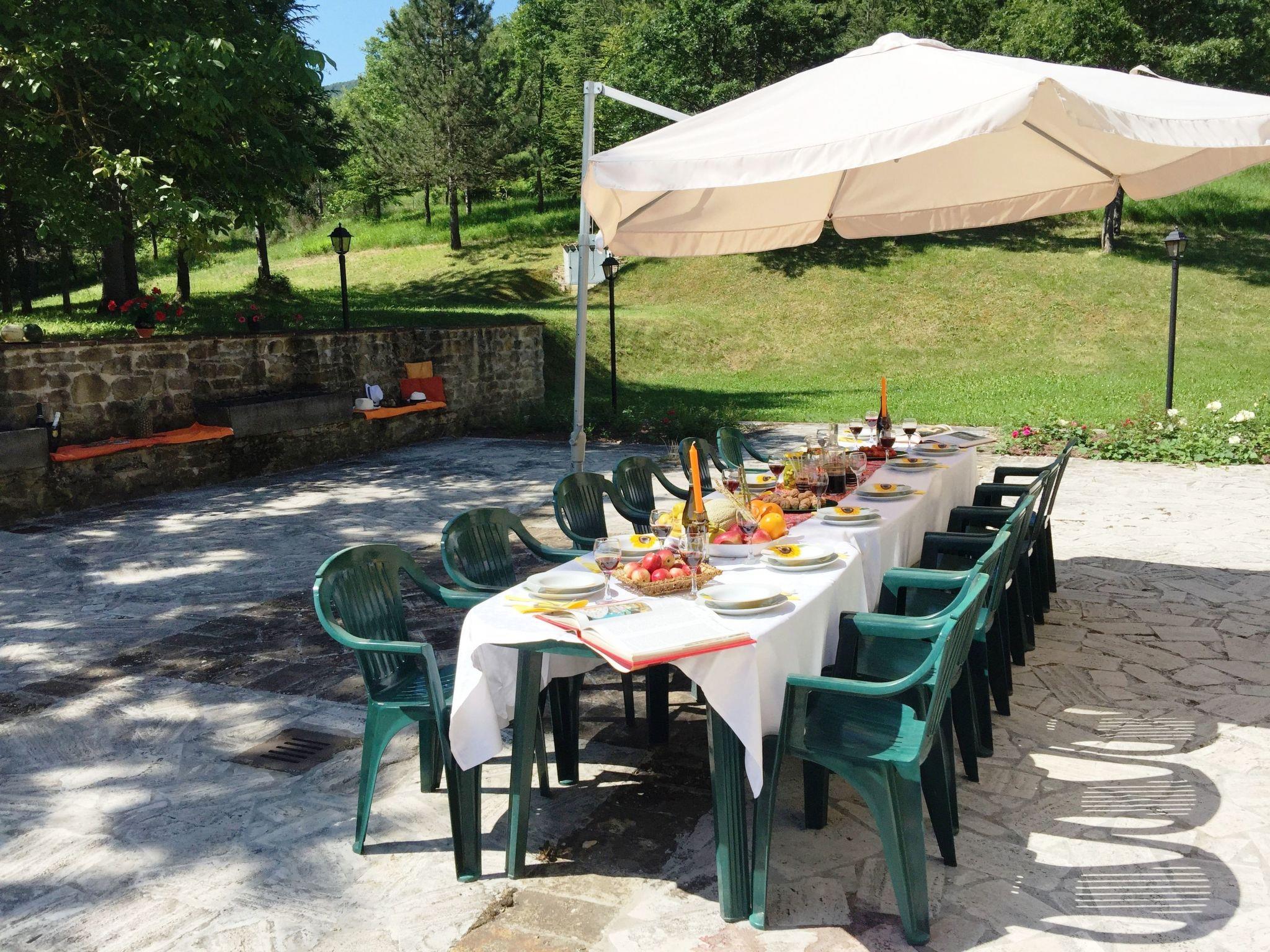 Private square in front of the entrance, furnished with table, chairs and sun umbrella. Large surrounding garden bordered by paths leading to the top of the hill where you can see the Apennines on the border with Umbria.