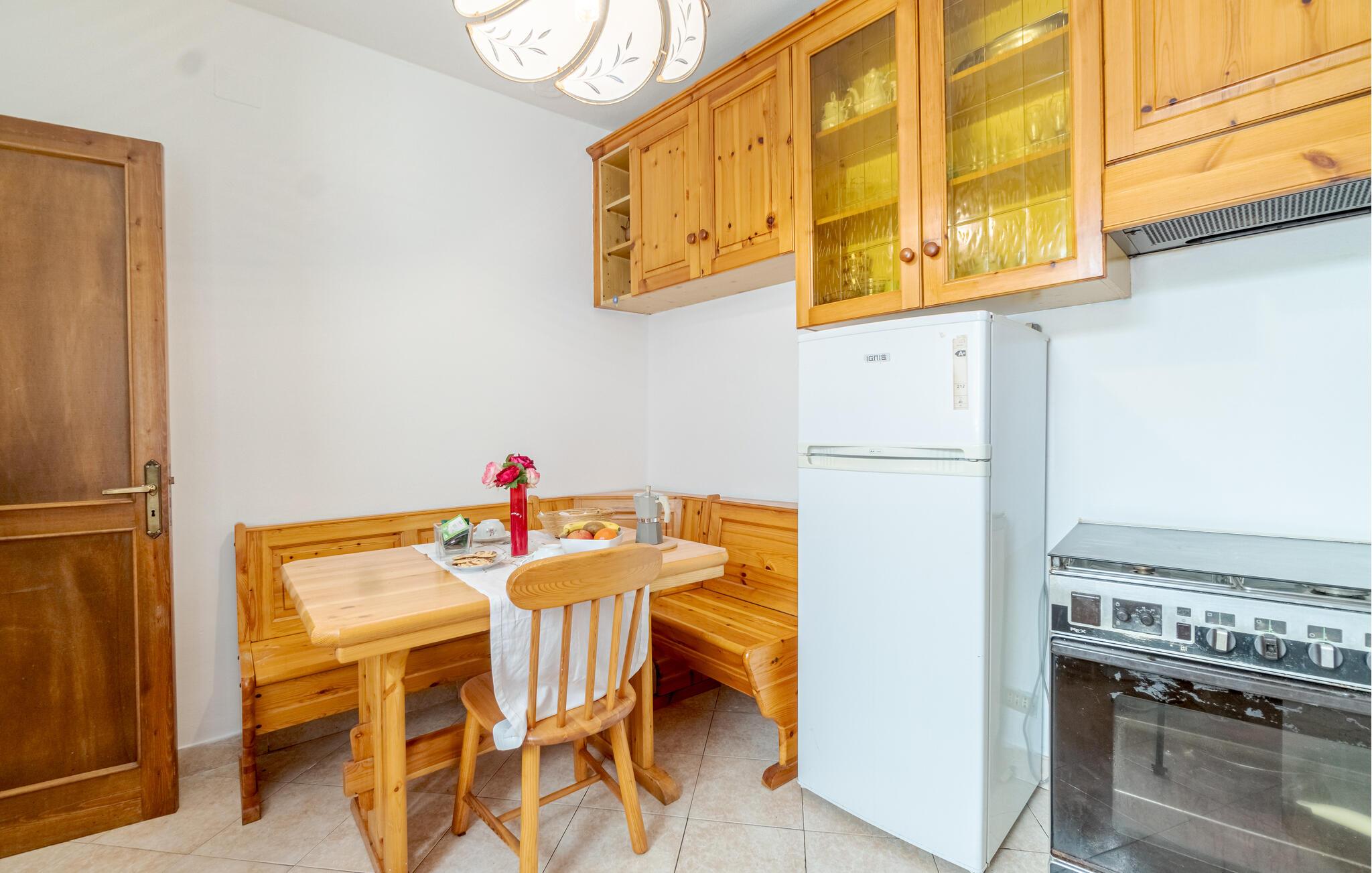Tre ord: Føl jer hjemme! Denne dejlige lejlighed er fordelt over to etager, hvor I kan glæde jer til at slå jer ned i de autentiske træmøbler. Fra de hyggelige lokaler er der udgang til en lille og en større terrasse. Her kan I bade i solen og mødes på den overdækkede terrasse til nogle lækre udendørs måltider.