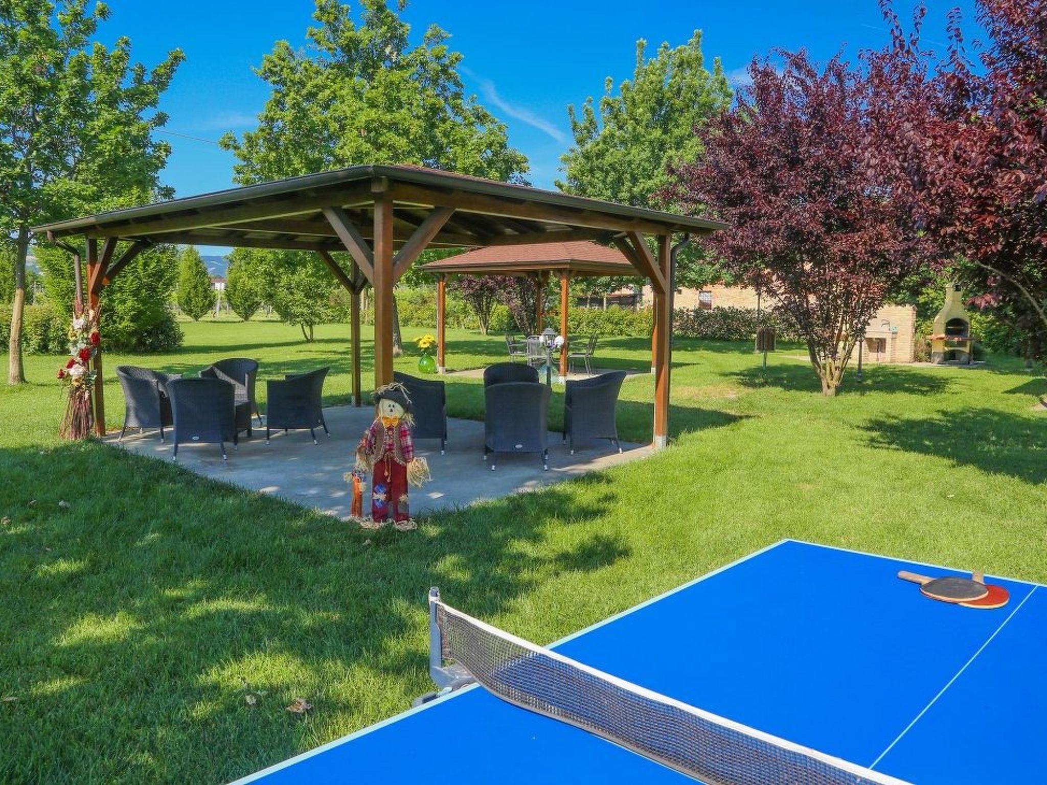 Per quanto riguarda l'outside, the farmhouse is surrounded by a large park where you will find barbecue areas, a gazebo, as well as a ping pong table, table football, and a solarium. For the little ones, there is a playground. Lovers of nature and relaxation can stroll through the vineyards or in the orchard, where, depending on the season, fruit can be picked directly from the trees. In addition, we offer a private, video-monitored car park, communal laundry and a garage with a small workshop for cyclists and motorcyclists.