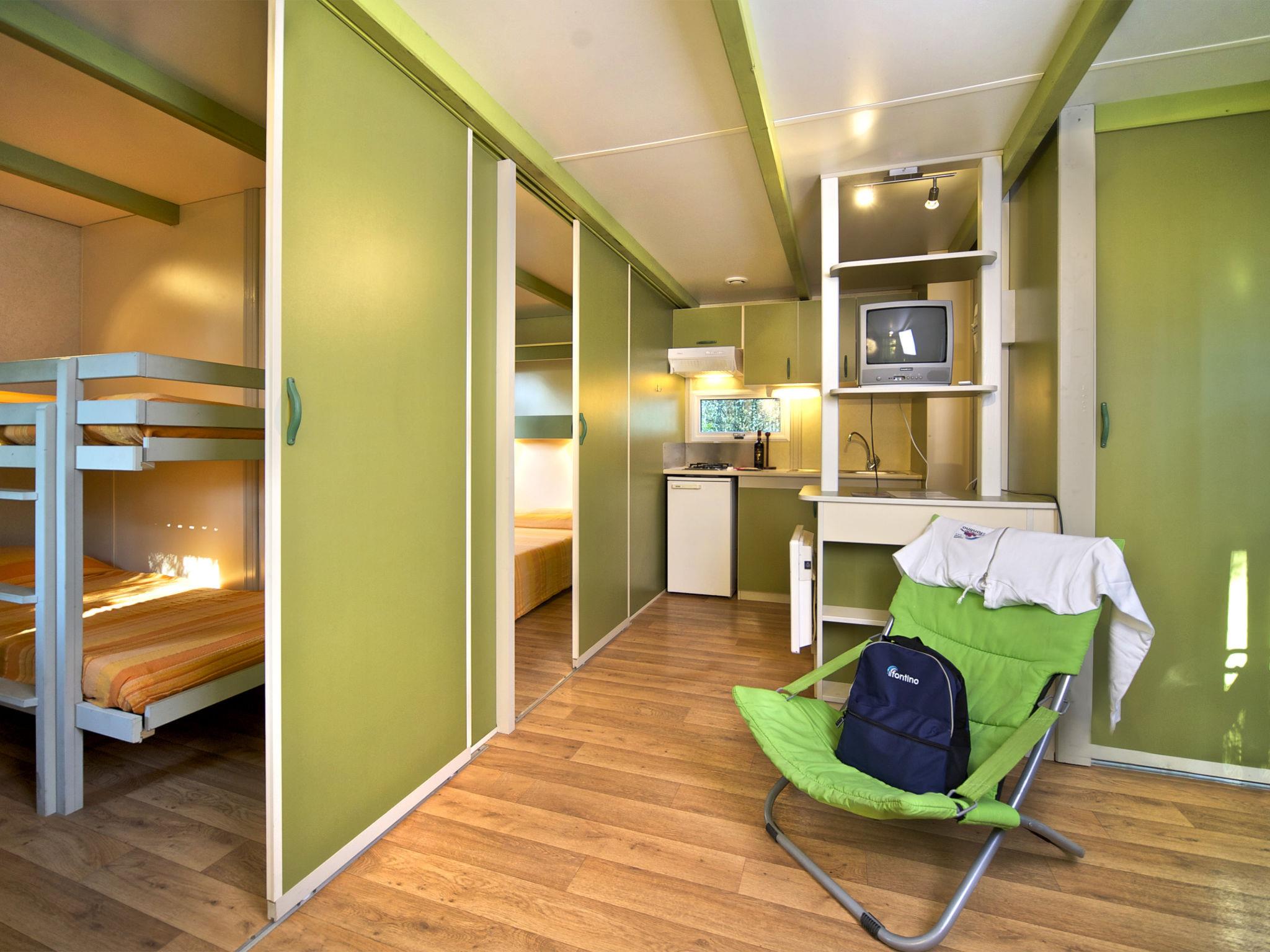 3-room mobile home 30 m2. Comfortable furnishings: 1 room with 1 french bed (140 cm). 1 room with 1 bed (80 cm), 1 x 2 bunk beds (80 cm). Kitchen-/living room (2 gas rings, electric coffee machine, combination microwave) with dining table, TV. Shower, sep. WC. Heating, air-conditioning. Terrace roofed. Terrace furniture, deck chairs (2). Facilities: safe, baby cot. Internet (WiFi, free). Parking (1 car). Please note: non-smokers only. Maximum 1 pet/ dog allowed. IT053024B2CZYDF4XM