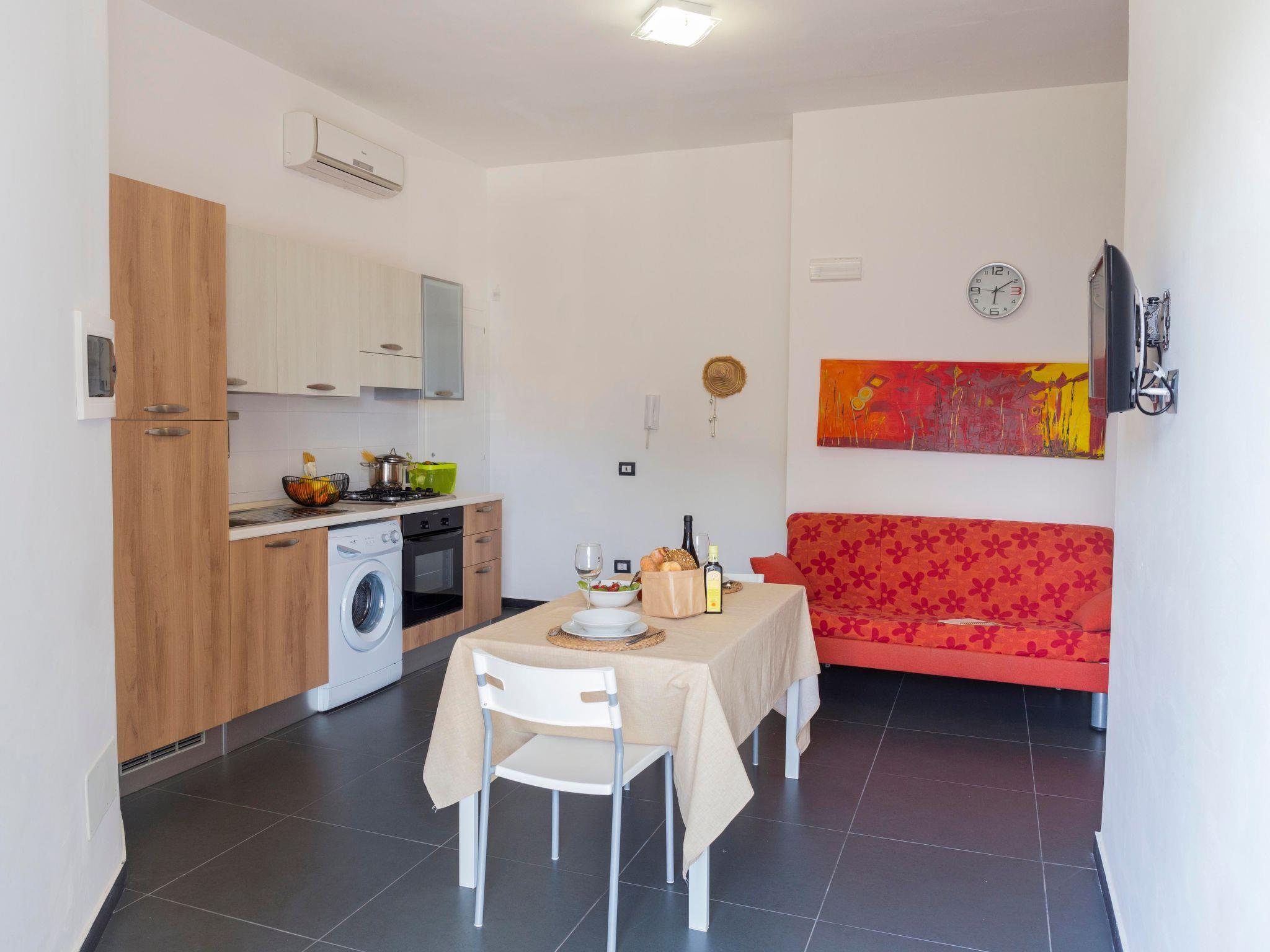 The holiday flat consists of two bedrooms, a kitchen-living room and a bathroom. One of the rooms has a double bed and the other a bunk bed. In the spacious kitchen-dining room, a kitchenette, a dining table with chairs and a double sofa bed offer plenty of space for cooking, eating and relaxing. The bathroom has a shower.