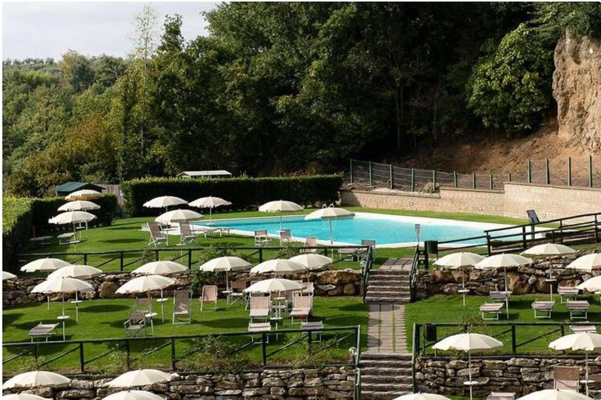 Nyd et afslappende ophold i denne charmerende, kæledyrsvenlige lejlighed til 4 gæster, beliggende i Toscanas bølgende bakker nær Sorano. Med en smukt anlagt privat have og adgang til førsteklasses wellnessfaciliteter er dette hjem perfekt til par eller en lille familie, der søger ro og komfort. Lejligheden ligger i stueetagen og har en hyggelig stue med en dobbelt sovesofa, tv og spisebord. Det store køkken er fuldt udstyret med kogeplader, ovn, køleskab og håndvask, ideelt til hjemmelavede måltider. Der er to komfortable soveværelser, hver med en dobbeltseng, og to moderne badeværelser med brusere, håndvaske, toiletter og bidet. Udenfor kan gæsterne slappe af i det fælles wellness-område, der omfatter sauna, tyrkisk bad, boblebad og to opvarmede swimmingpools. Der er også tennisbaner til rådighed for aktive gæster. Lejligheden tilbyder også en privat terrasse, liggestole, havemøbler og en parasol, så man kan nyde det fredelige udendørsområde. Der er varme, aircondition og parkering, samt WiFi overalt. Uanset om du nyder de termiske bade, udforsker de nærliggende toscanske landsbyer eller blot slapper af ved poolen, tilbyder denne lejlighed et perfekt tilflugtssted i hjertet af naturen.