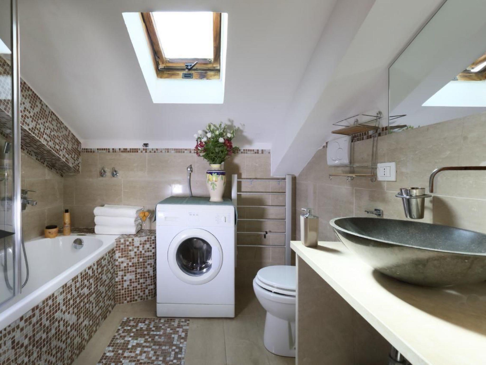 - 1 x small bathroom with washbasin, bathtub with shower, WC, washing machine, skylight