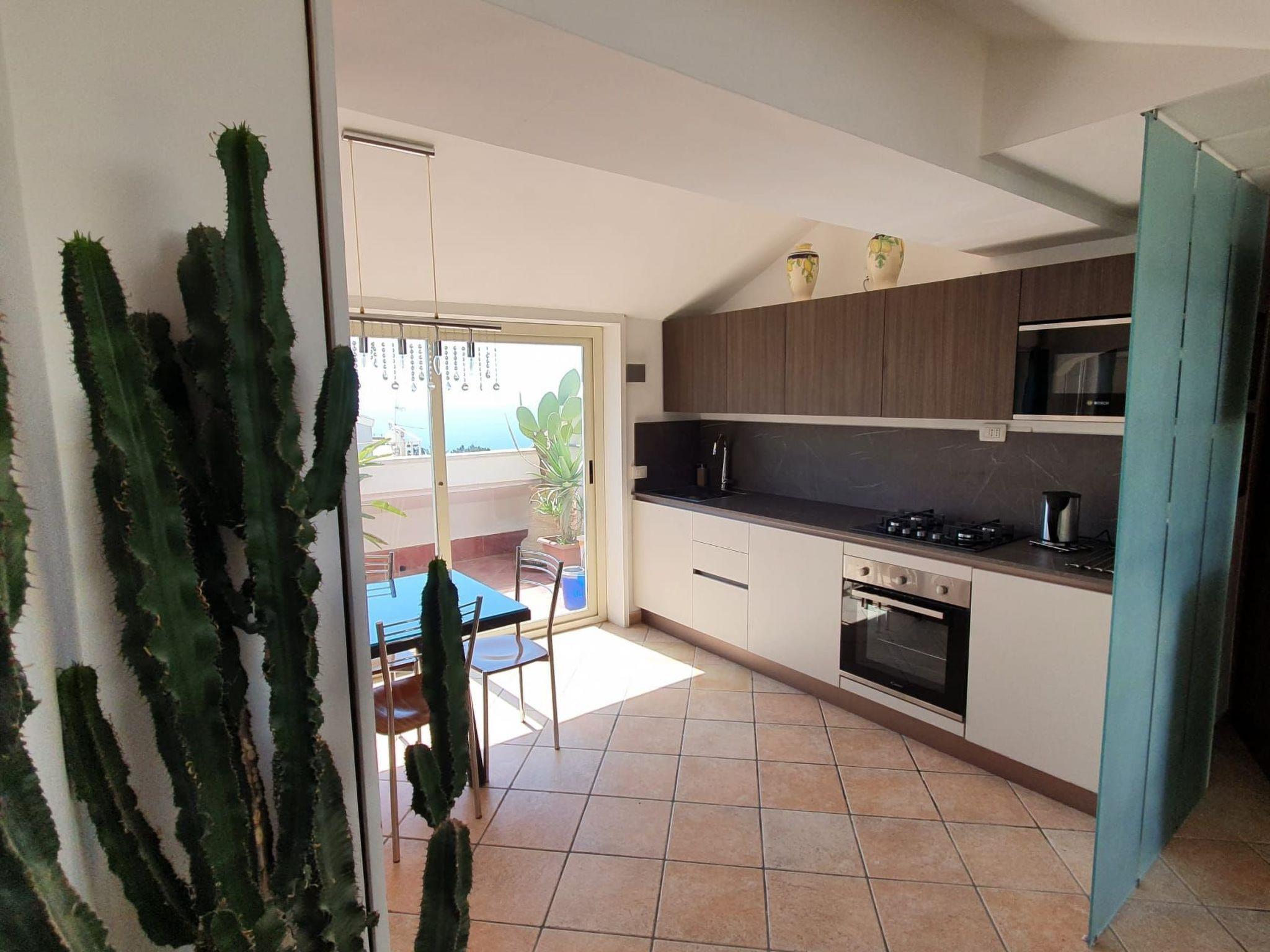 - 1 x large living/dining room with terrace and 2 balconies, open-plan kitchen and dining table (air conditioning). From the living room you have impressive views of the sea, Taormina and the volcano Etna.
