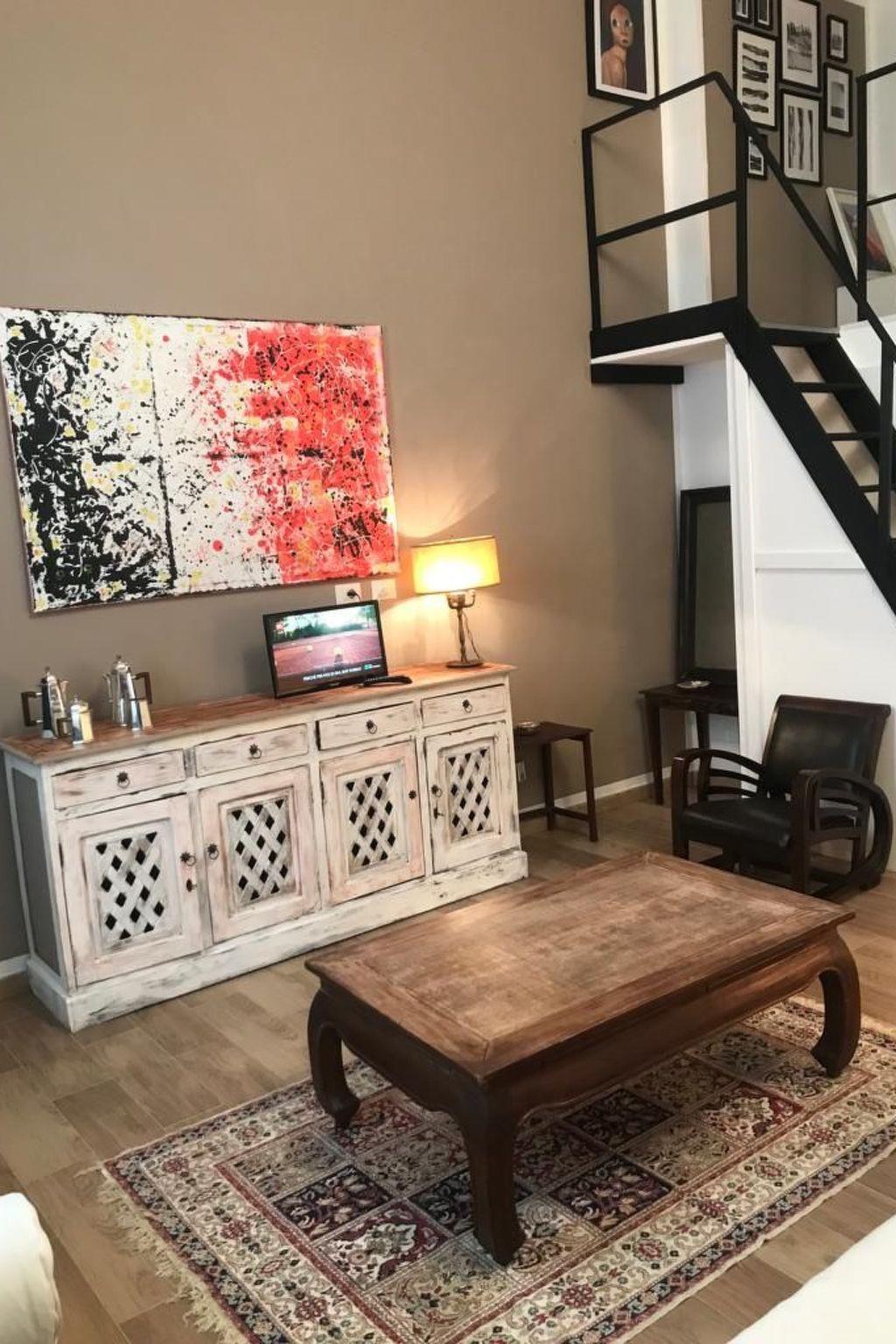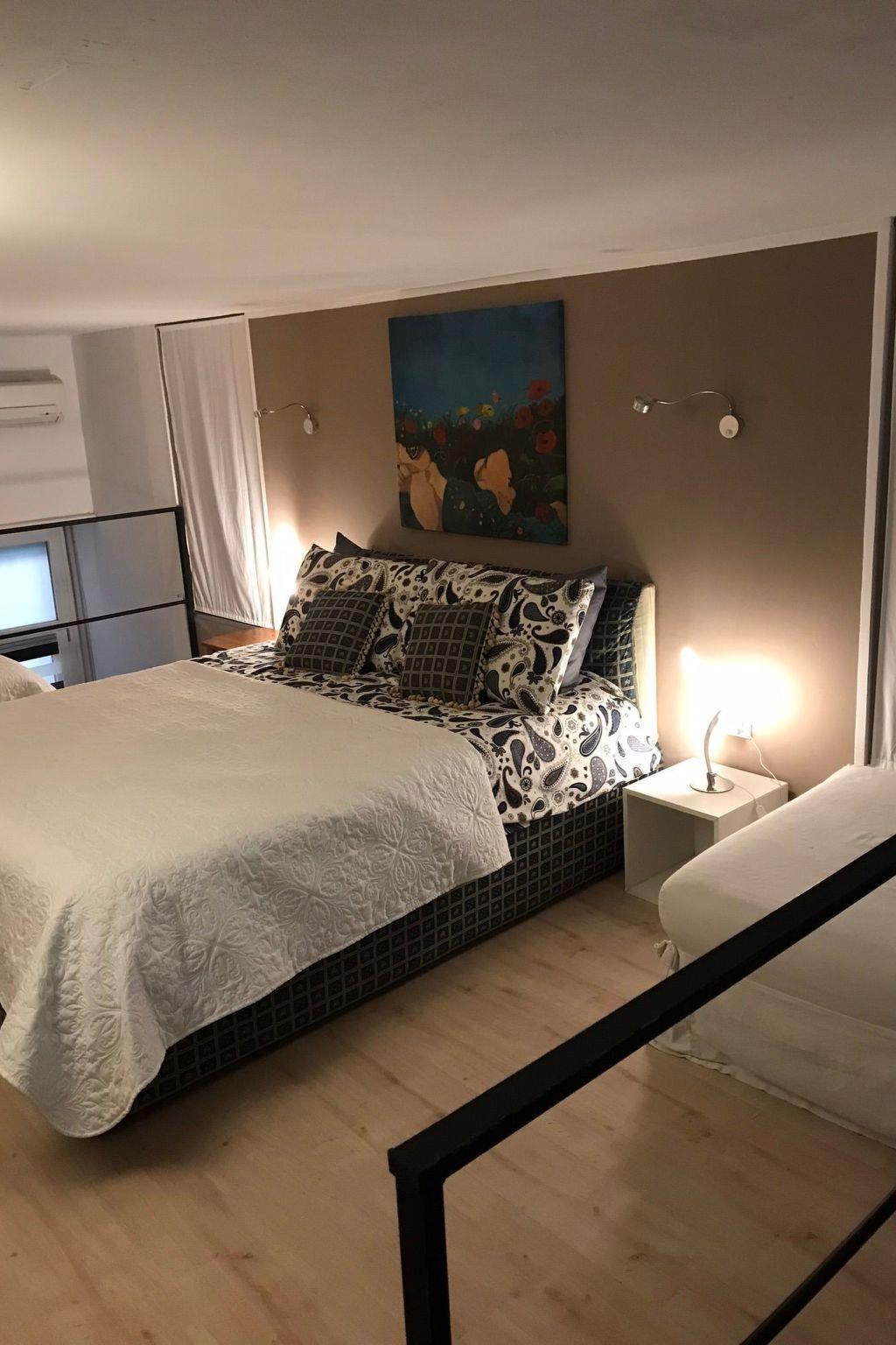 Inside, the flat has a large living room with well-defined seating areas, taking advantage of a mezzanine structure that accommodates the sleeping area. The latter is equipped with a double bed, a single bed, and an additional single pouf bed solution, guaranteeing a comfortable night's rest for all guests. The living room offers two sofas, including a comfortable double sofa bed option, ensuring space and intimacy. Equipped with air conditioning, to ensure a pleasant environment in all seasons, the flat is also equipped with a fan, induction cooker, capsule coffee machine and a handy mini oven, perfect for starting the day with a homemade breakfast.