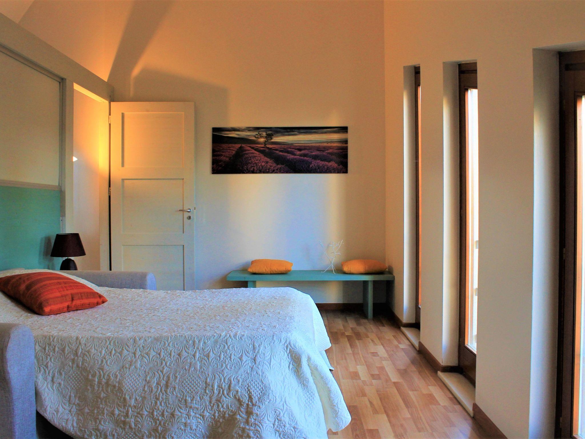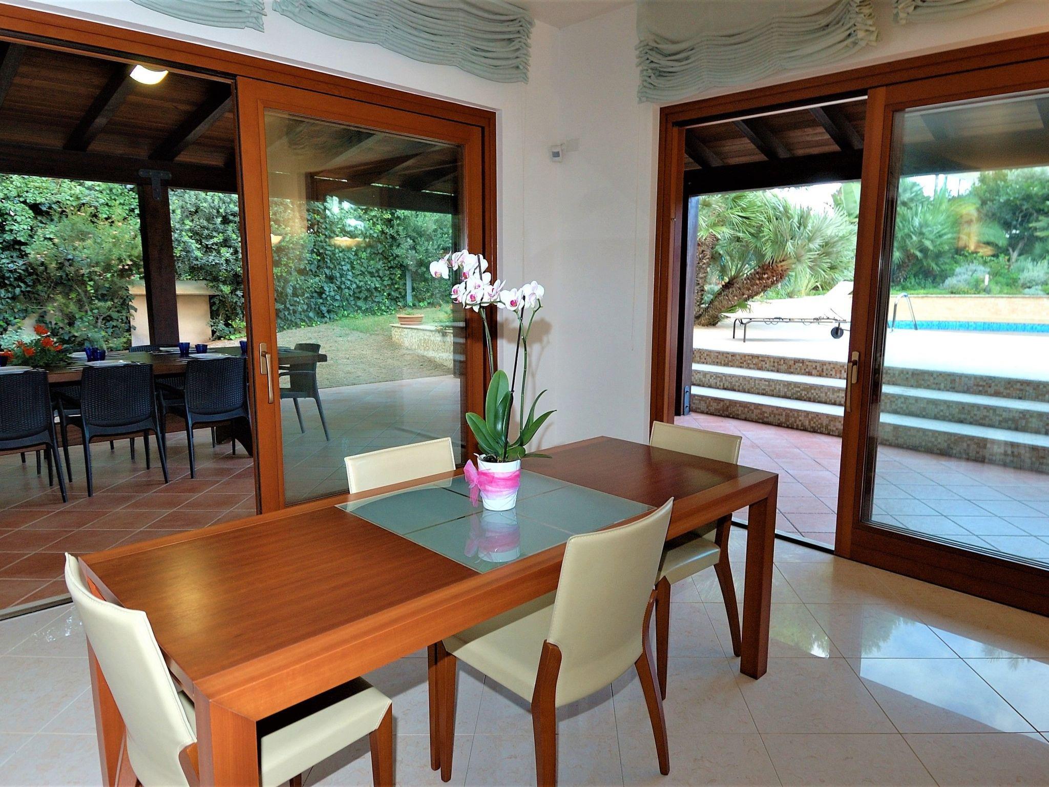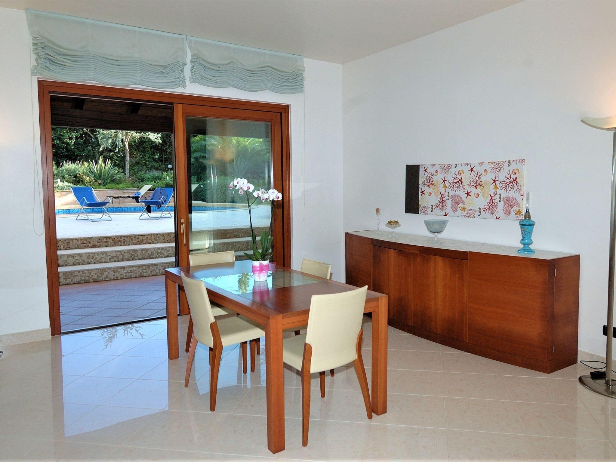 The villa, recently built, has a simple, modern style. It extends over two levels with direct access from the large and bright living-room with different spaces: dining area, relaxation area and corner office. It is characterized by large windows overlooking the garden, the pool and the open veranda, where you can lunch or stay enjoying the surrounding view.