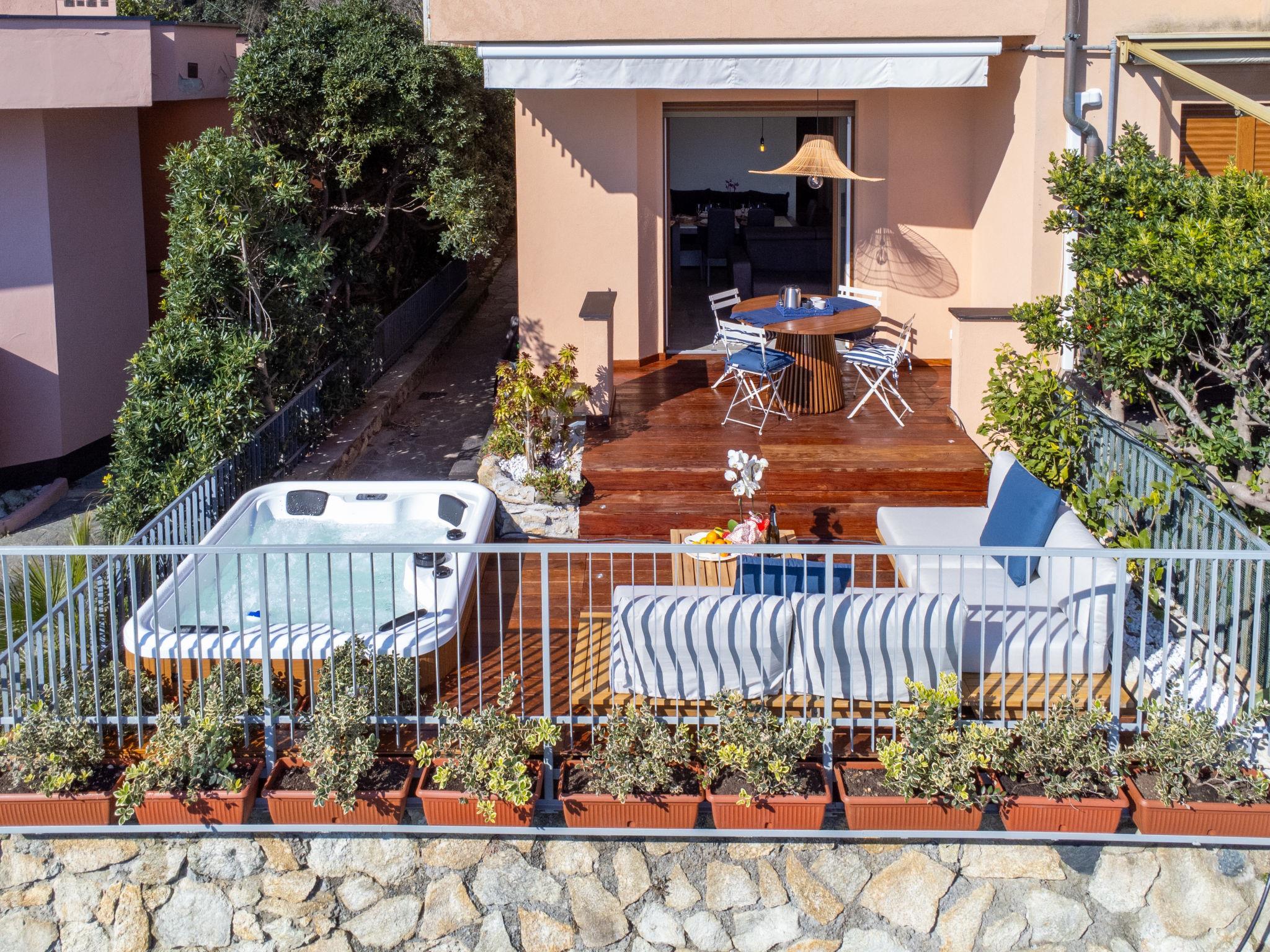 Piani d'Invrea 2 km from Varazze: Beautiful apartment block "Casa dei Gerani", 3 storeys, surrounded by trees. 6 apartments in the residence. 2 km from the centre of Varazze, 15 km from the centre of Genova, in a quiet, sunny, elevated position on a slope, 400 m from the sea. Private: hot tub. Supermarket 2 km, shopping centre 2 km, restaurant 2 km, bar 400 m, bakery 2 km, bicycle rental 2 km, bus stop 200 m, rocky beach 400 m. Tennis 800 m, cycle lane 400 m. Please note: car recommended.