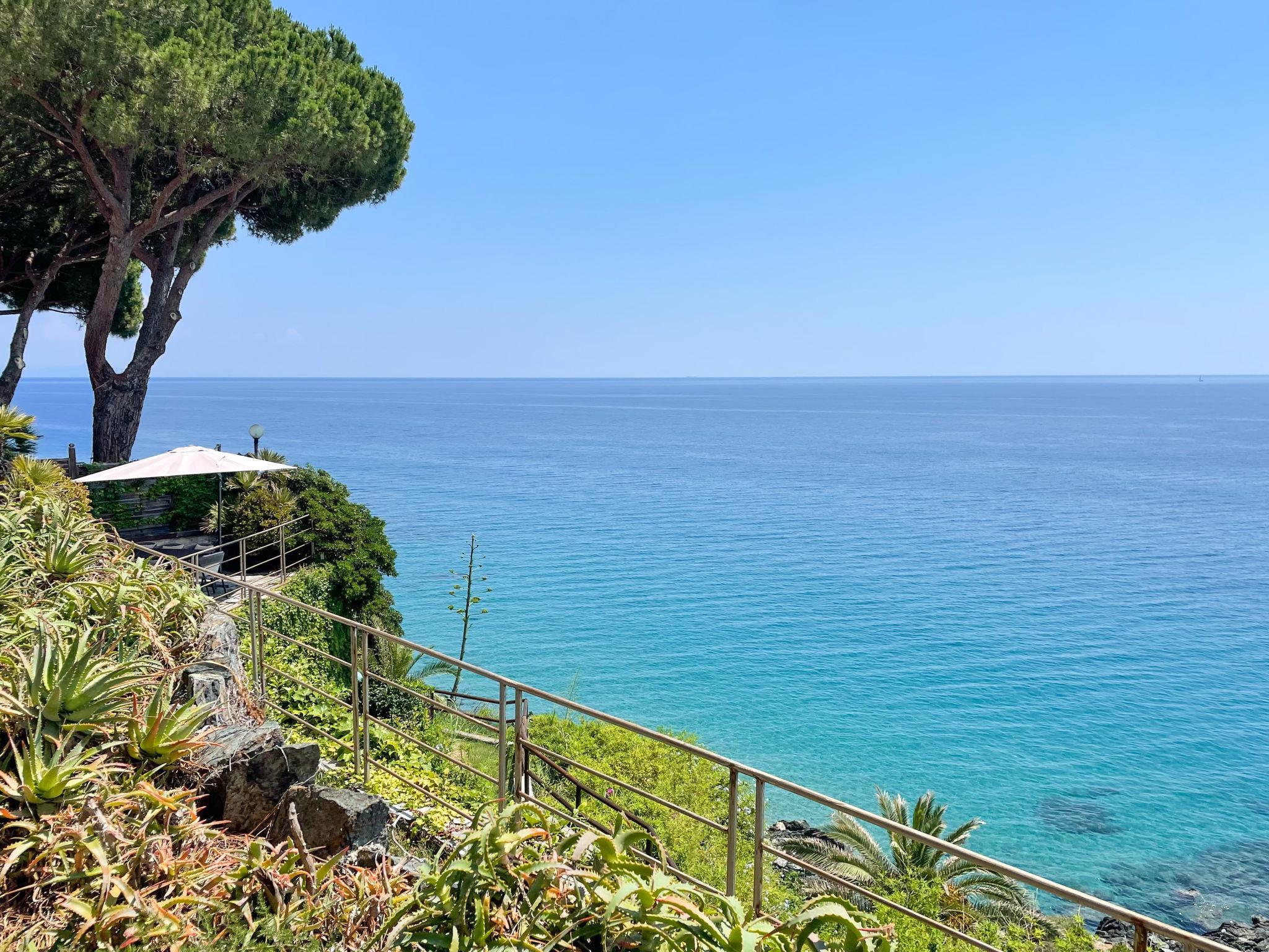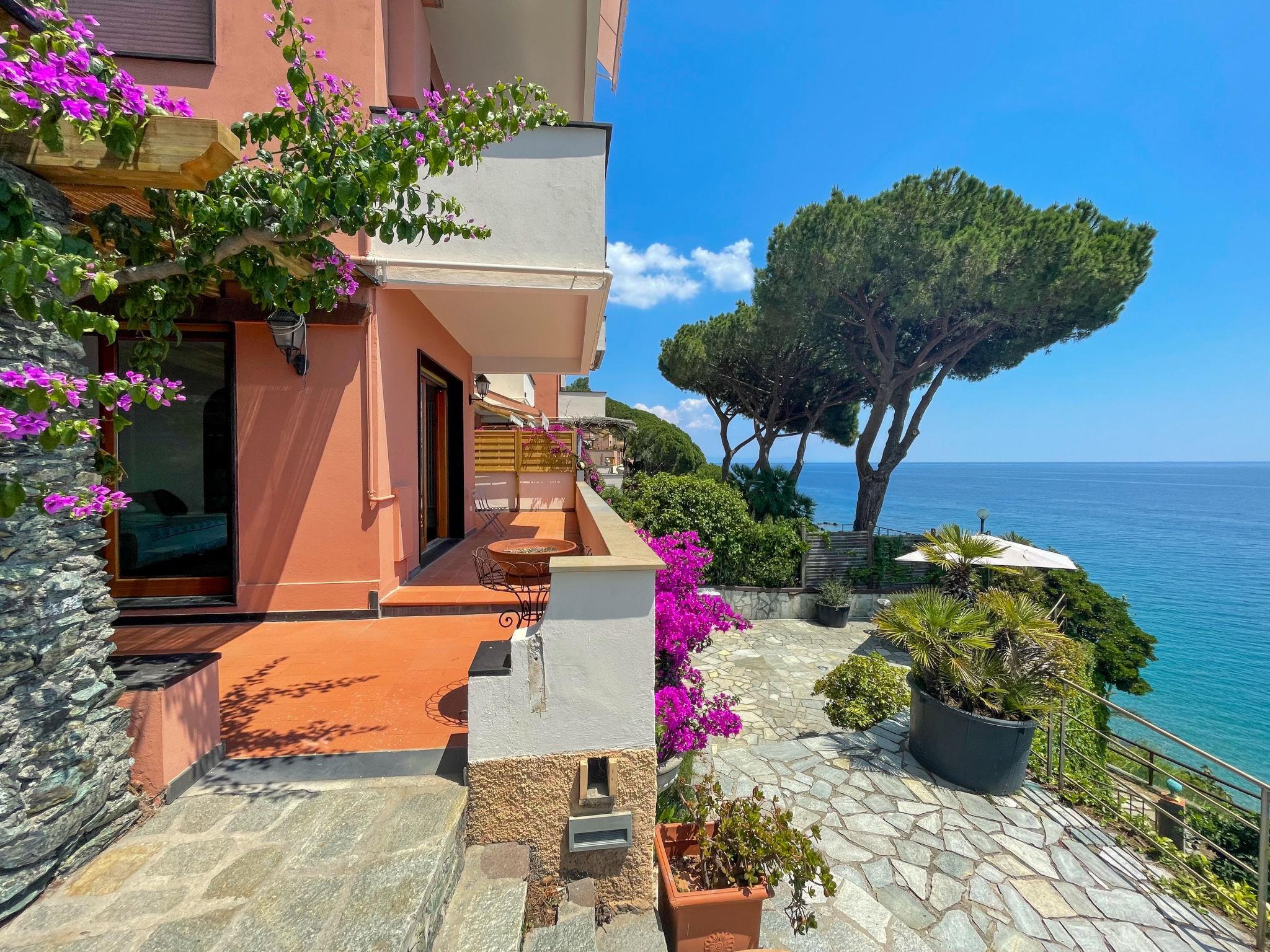 Piani d'Invrea 2 km from Varazze: Large, beautiful apartment block, 3 storeys. 12 apartments in the residence. 2 km from the centre of Varazze, 15 km from the centre of Genova, in a quiet, sunny, elevated position on a slope, 20 m from the sea, direct access to the beach. Private: well-kept terraced garden. Supermarket 2 km, shopping centre 2 km, restaurant 2 km, bar 50 m, bakery 2 km, café 50 m, bus stop 400 m, pebble beach, rocky beach 100 m. Tennis 800 m, cycle lane 50 m. Please note: car recommended.