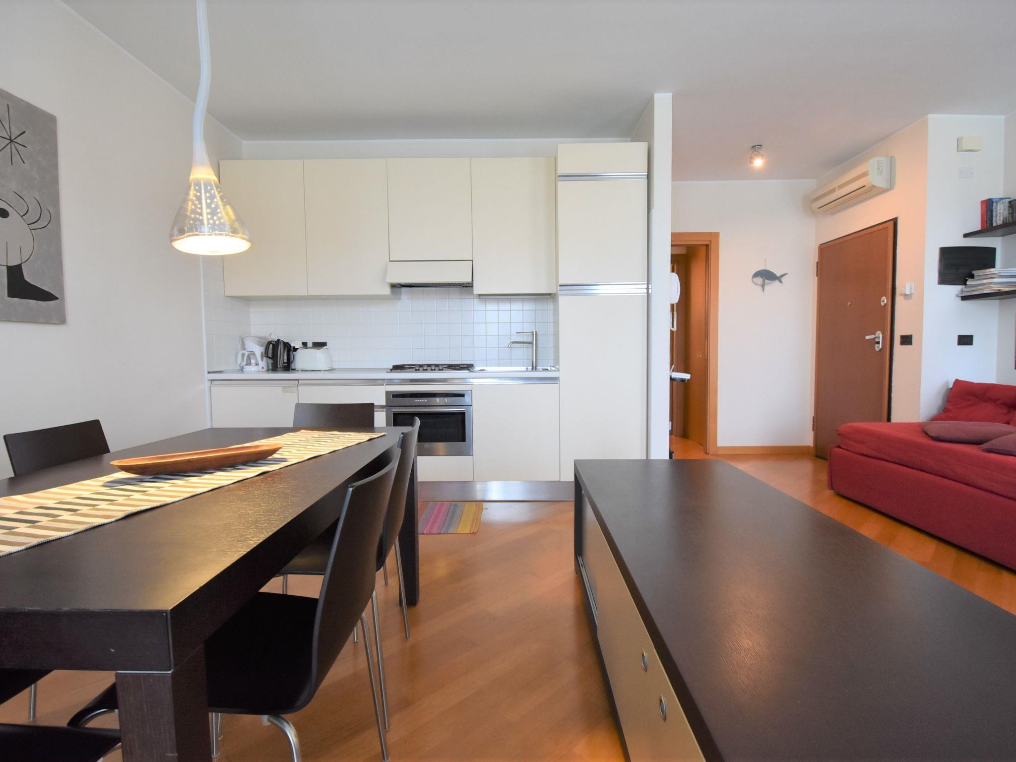 "Judeca Nova", 2-room apartment 60 m2, on the upper ground floor. Spacious and bright, comfortable and modern furnishings: living/sleeping room with panoramic window east facing position with 1 sofabed and TV. 1 room with 1 double bed. Kitchenette (4 hot plates, oven). Shower/bidet/WC. Heating, air-conditioning. Parquet floors. Panoramic view of the sea, the canal and lagoon. Facilities: iron, hair dryer. Internet (WiFi, free). Please note: non-smokers only. IT027042B4UKGKVH4W