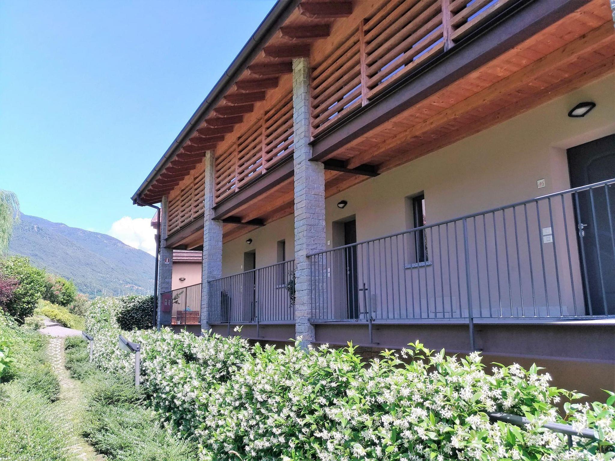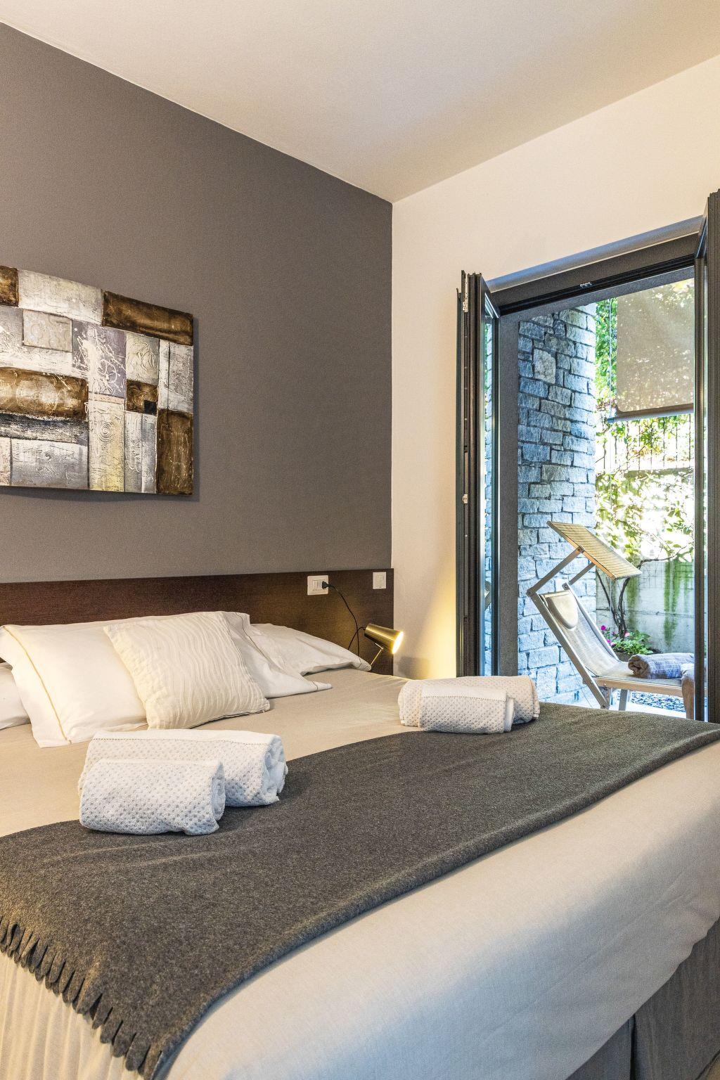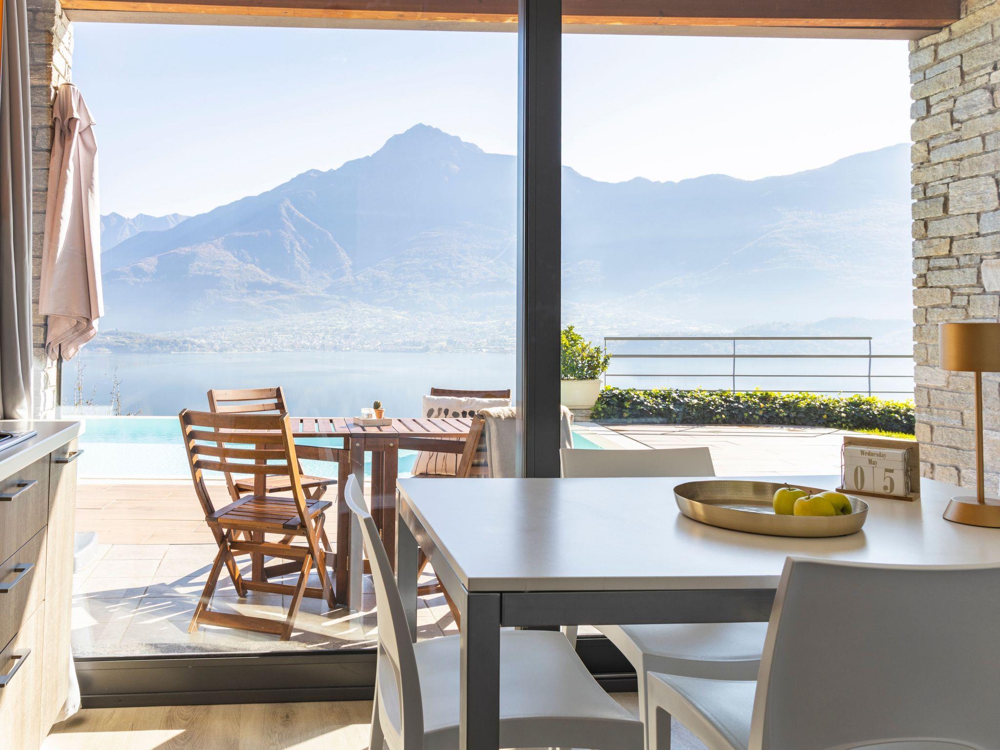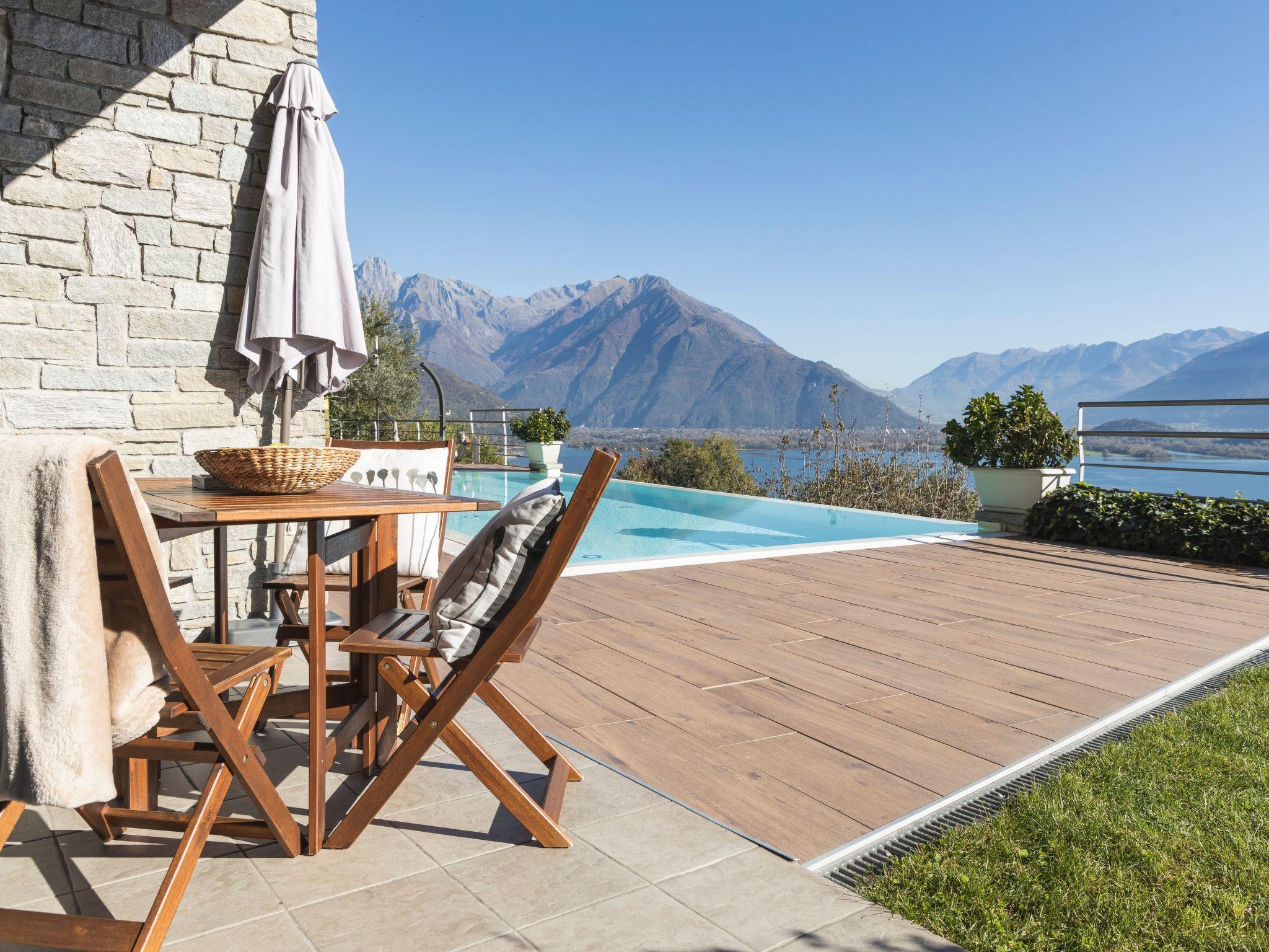 The flat is situated on the ground floor, with direct access to the garden and swimming pool. The large living room with kitchenette opens onto the porch equipped with table and chairs; behind it is the sleeping area consisting of a bedroom with double bed, wardrobe and bathroom with shower. It is possible to accommodate up to three adults, taking advantage of the comfortable sofa bed in the living room.