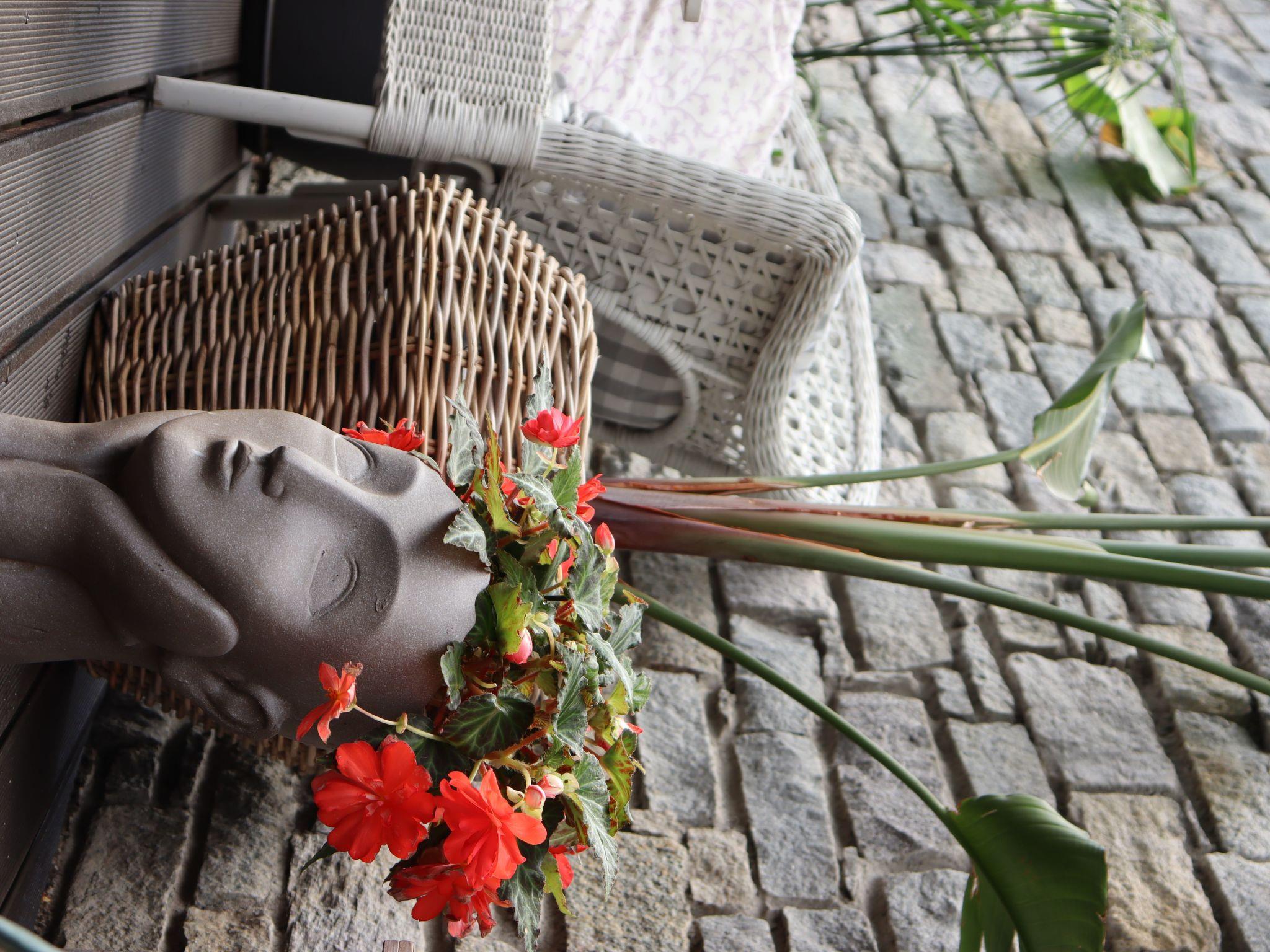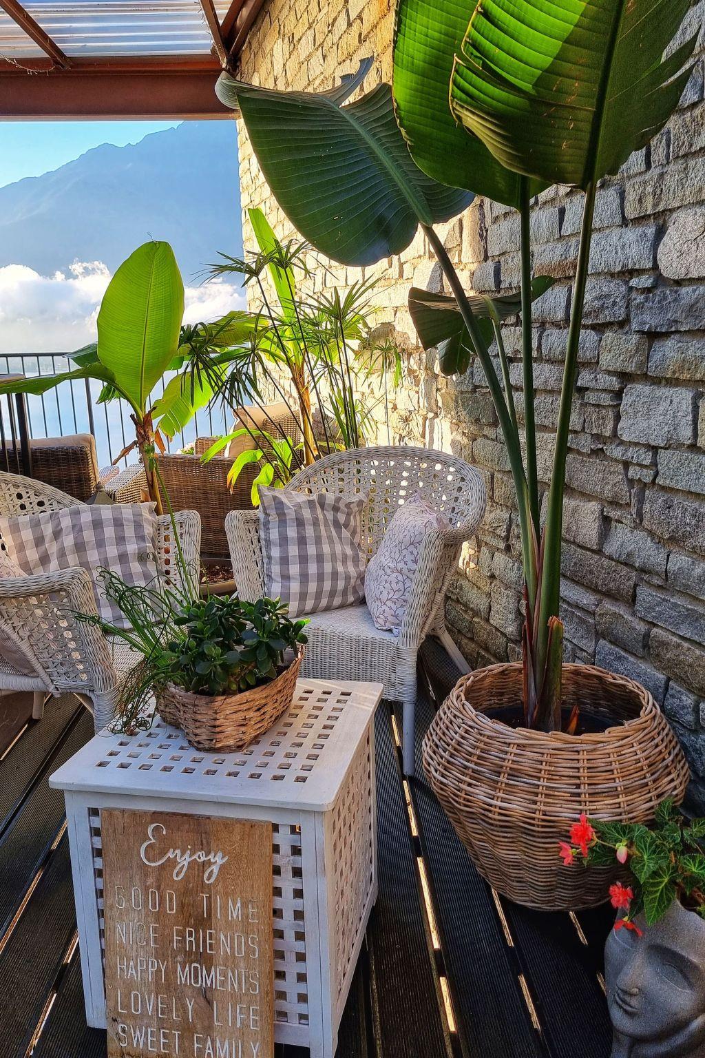 The apartment has a sunny terrace overlooking the garden and the pool.