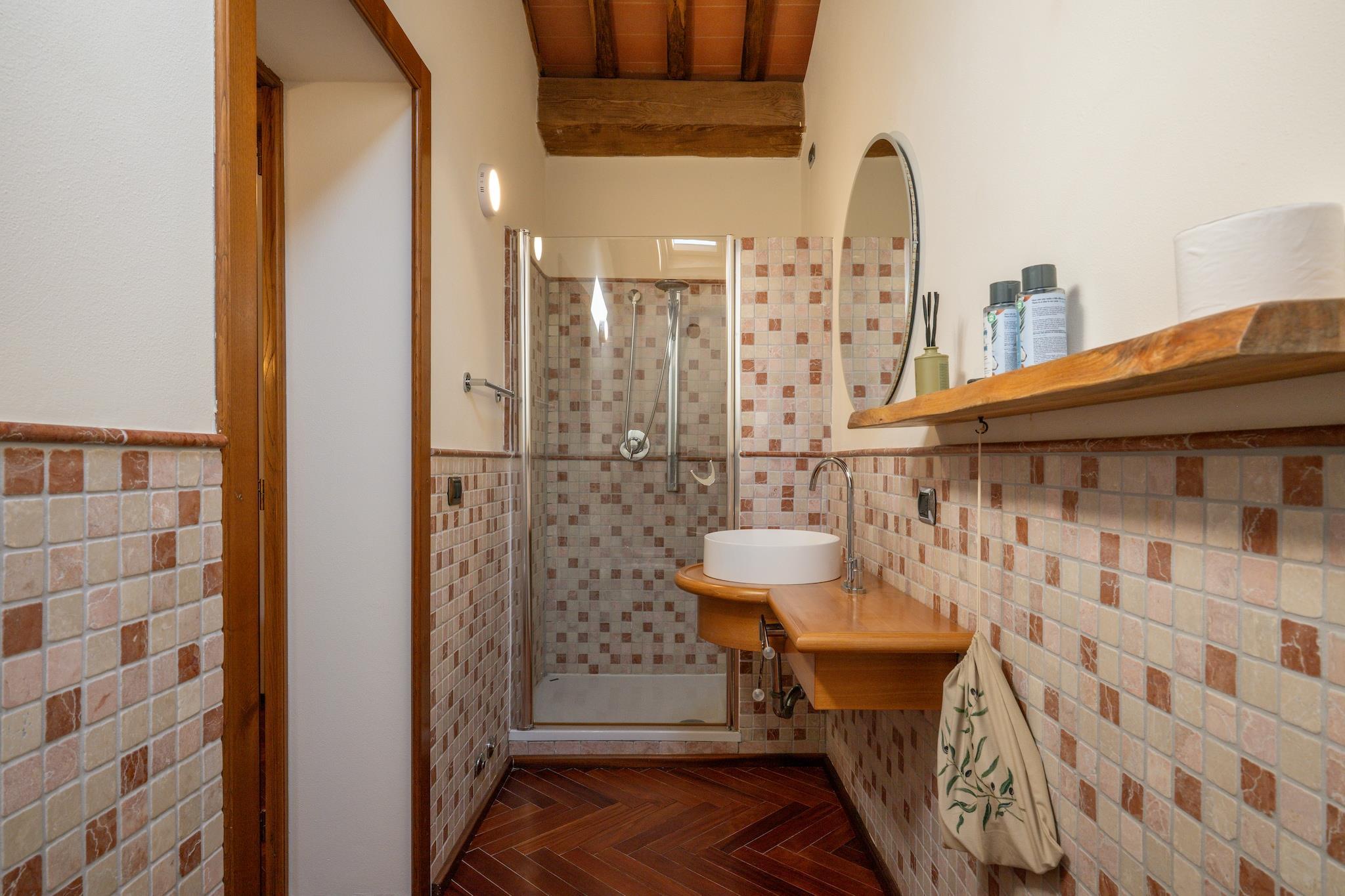 Tenuta del Serra - Luksuriøs toscansk villa midt i olivenlunde Oplev freden og skønheden i det toscanske landskab. Tenuta del Serra er en smuk, nyrenoveret ferievilla beliggende i hjertet af Toscana, midt i frodige olivenlunde. Her vil du opleve det ægte Italien: stilfuldt, smagfuldt og i fuldstændig harmoni med naturen. Villaen har plads til 8 gæster (en 9. seng er tilgængelig efter anmodning) og kombinerer traditionel toscansk arkitektur med moderne bekvemmeligheder. Et nyindrettet hjem med karakter, kærligt vedligeholdt ned til mindste detalje. Indenfor finder du en indbydende spisestue, en hyggelig stue og en autentisk "cantina" (vinrum), hvor du kan opdage og købe lokale vine. Det rummelige køkken er fuldt udstyret - med ovn, komfur, mikrobølgeovn, køleskab, opvaskemaskine og kaffemaskine - og inviterer dig til at lave mad, drikke og nyde sammen. Fra køkkenet træder du direkte ud på den udendørs terrasse, hvor en betagende udsigt venter. Alle soveværelser er rummelige, stilfuldt møblerede og har aircondition. Hvert værelse har sit eget moderne badeværelse med bruser, håndvask, toilet og bidet - privatliv og komfort garanteret. Udenfor venter den private pool med soldæk på dig. Omgivet af græs, komfortable liggestole og skyggen fra gamle oliventræer er det det perfekte sted at slappe af. Pergolaen og loungeområdet tilbyder kølende skygge på varme dage, og grillen og lysthuset er perfekte til lange sommeraftener under stjernerne. Den store olivenlund inviterer dig til at slentre rundt på grunden, og forskellige vandre- og mountainbike-stier omgiver villaen. Den maleriske by Vicopisano med sine snoede gader og middelalderlige tårne ligger kun en kort afstand væk. Firenze, Lucca, Pisa og Siena er også let tilgængelige. Tenuta del Serra er mere end bare et feriehus: det er et sted at slappe af, være sammen og opleve Toscana, når det er bedst.