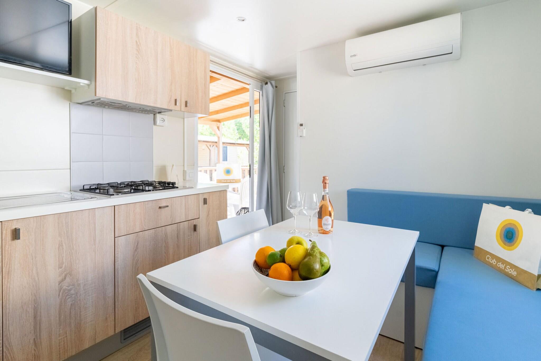 Stueetage: (Stue(enkeltsovesofa, Fjernsyn), tekøkken(kogeplade(gas), mikrobølgeovn, køle-fryseskab), soveværelse(dobbeltseng), soveværelse(enkeltseng, enkeltseng, enkelthøjseng), badeværelse(bruser, toilet), veranda(Havemøbler), klimaanlæg) Reception, Vaske faciliteter, Parkering, Animation team, Supermarked, Cykeludlejning, Sportsbaner, Bordtennis, Restaurant, Bar, Børneklub, Legeområde, Bubble bath, solstole, Parasol, swimmingpool(deles med andre gæster, udendørs, herunder en del for børn (maks. dybde 50 cm), opened from 1/2 May upto and including 1/2 Sep), padelbane