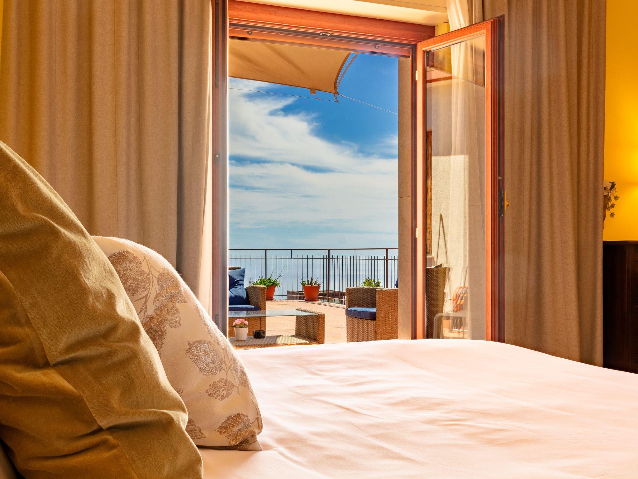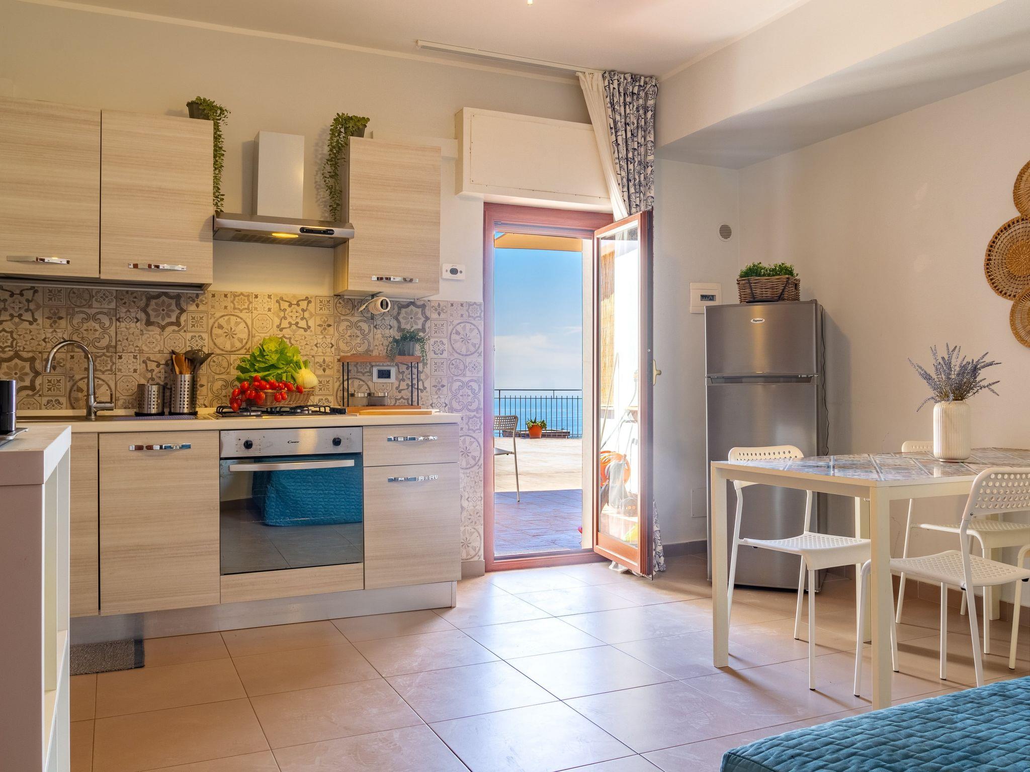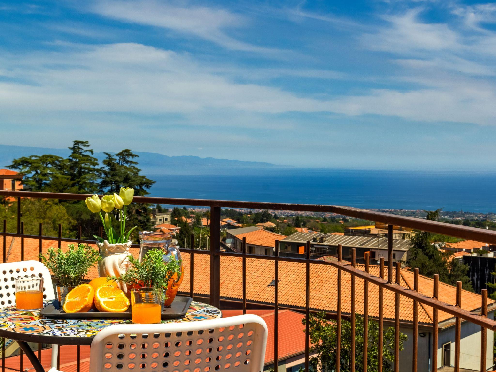 The exterior of the apartment boasts a spectacular roof terrace for exclusive use, where guests can relax and absorb the beauty of the surrounding landscape. This outdoor area, complemented by an additional terrace and balcony, provides the perfect backdrop for al fresco dining or simply enjoying moments of relaxation while admiring the panorama that embraces the sea and mountains. The view from the flat provides unique thrills, especially the view of the summit of Mount Etna from the side balcony.