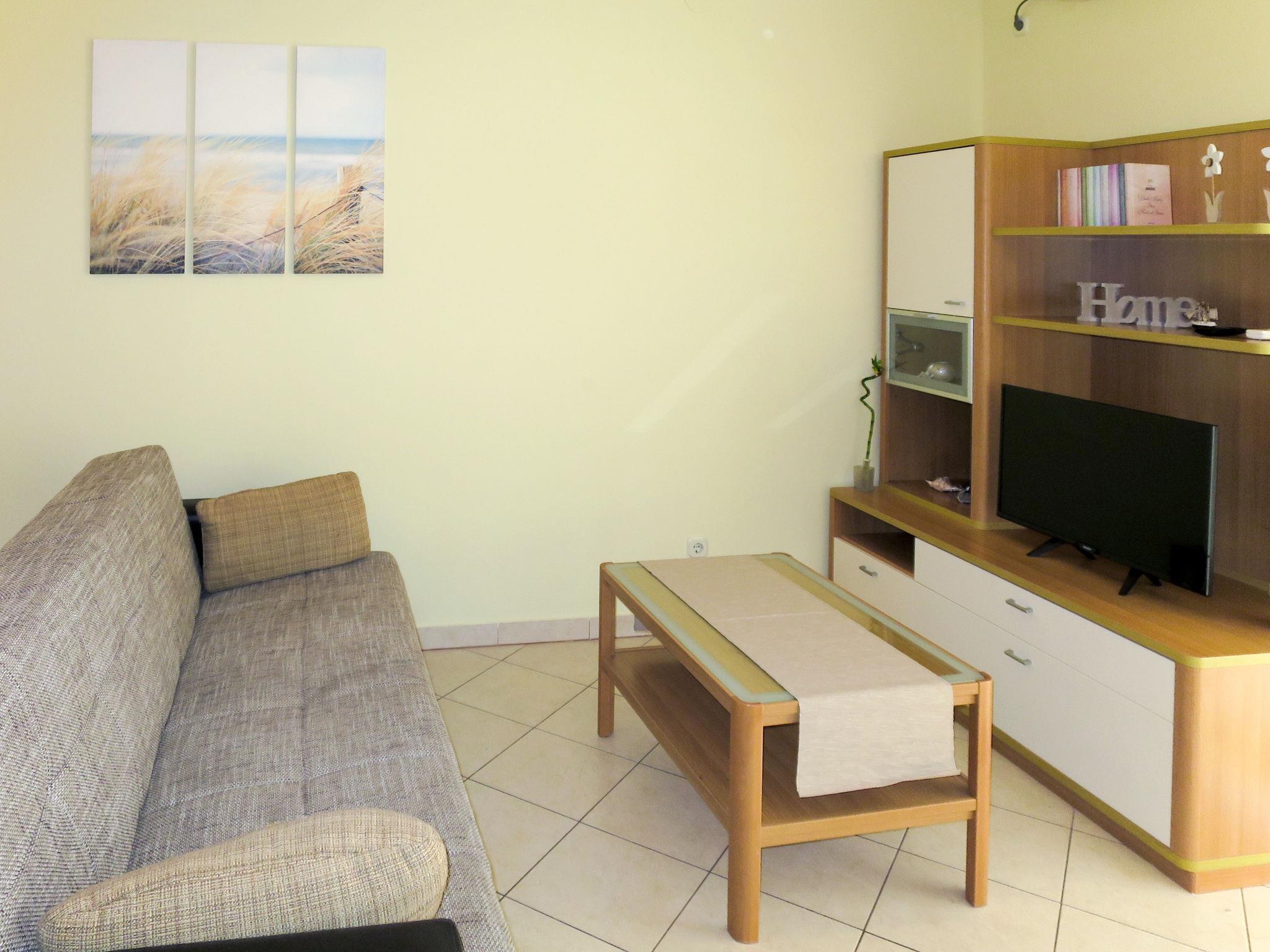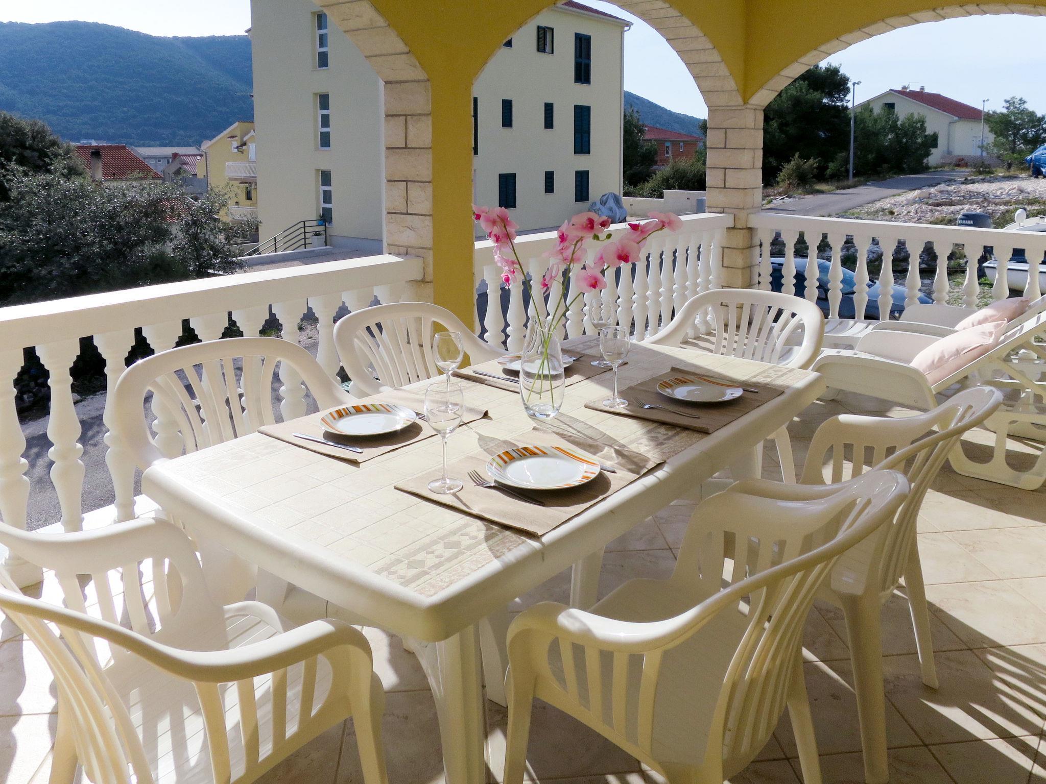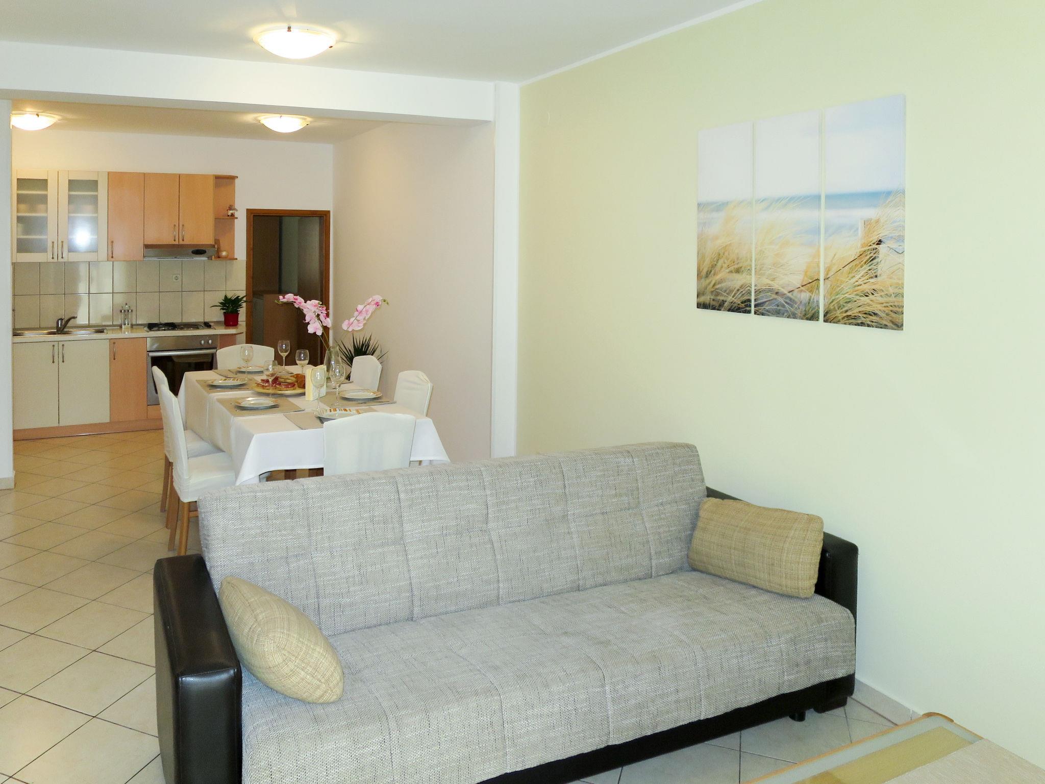 "Toni", 3-room apartment 60 m2 on 1st floor. Living/dining room with 1 sofabed, satellite TV and air conditioning. Exit to the balcony. 1 room with 1 double bed. Exit to the balcony. 1 room with 1 double bed. Open kitchen (2 hot plates, oven, dishwasher, 2 gas rings, toaster, kettle, freezer, electric coffee machine). Shower/WC. No heating option. Balcony 18 m2. Balcony furniture, deck chairs (2). Partial view of the sea. Facilities: washing machine. Internet (WiFi, free).