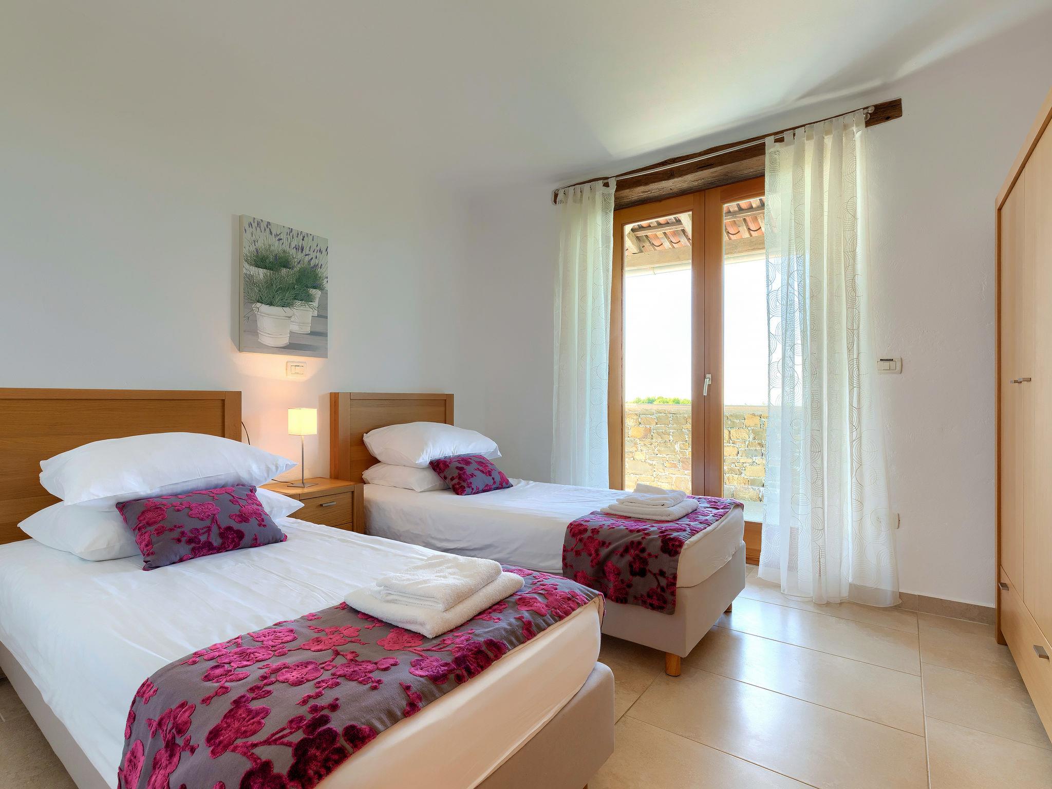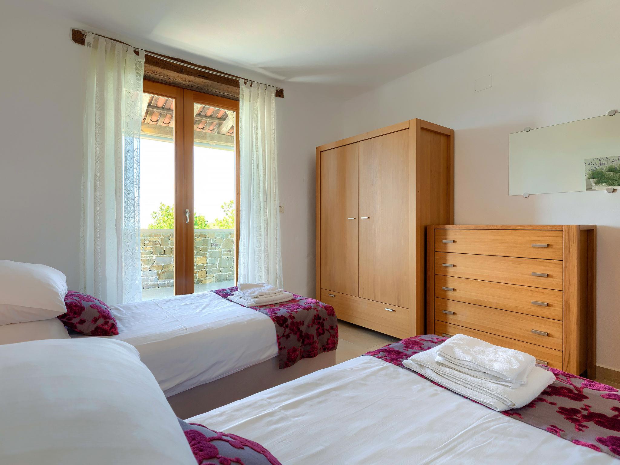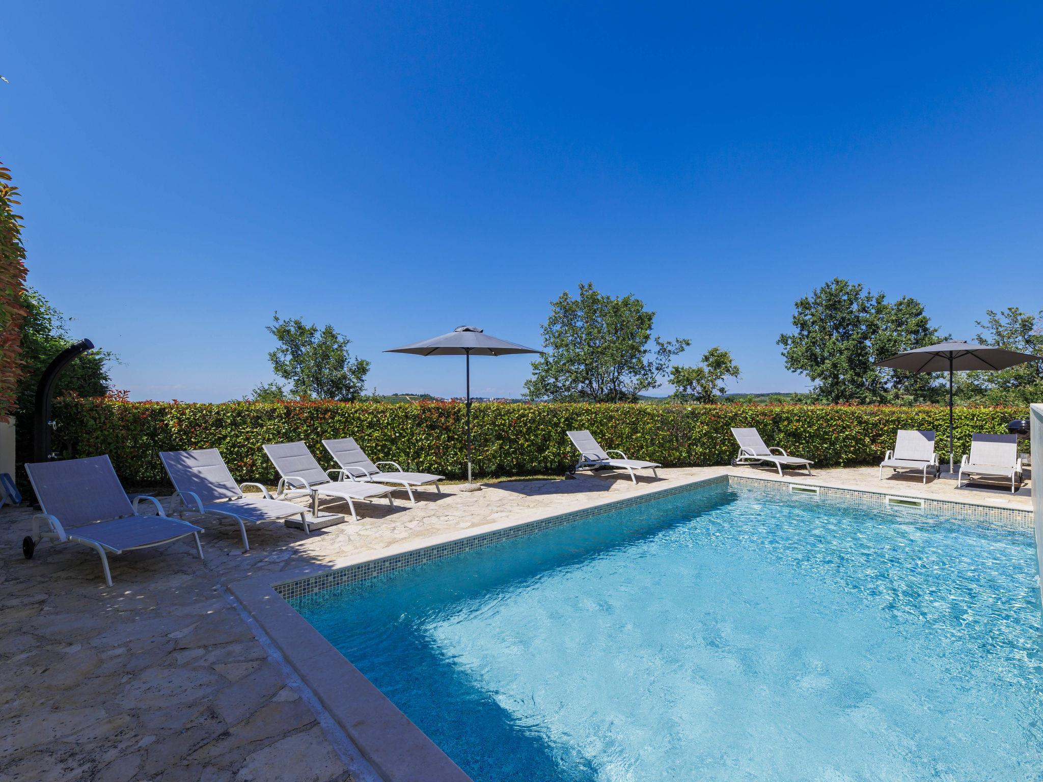 Beautiful villa "Morgan", 2 storeys. In the hamlet Baredine 4 km from the centre of Buje, in a quiet, sunny, elevated position, 17 km from the sea. Private: property 300 m2, small garden with lawn, swimming pool angular, heated (8 x 4 m, depth 140 cm, seasonal availability: 15.Apr. - 15.Oct.) with internal staircase. Outdoor shower. In the house: internet access, washing machine, tumble dryer. Parking at the house on the premises. Shop 4 km, restaurant 1 km, bus stop 4 km, railway station 33 km, pebble beach 17 km. Tennis 16 km, sports centre 16 km, walking paths from the house 1 km, cycle lane 1 km. Nearby attractions: Aquapark 19 km.