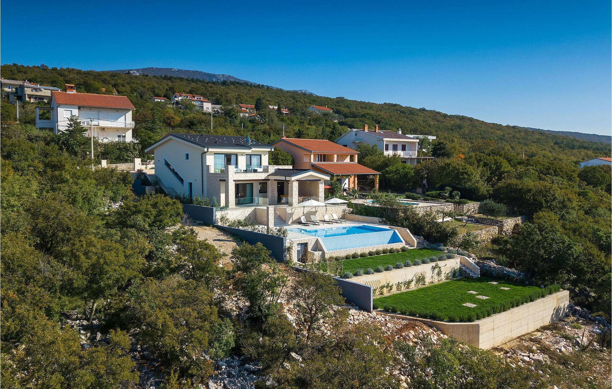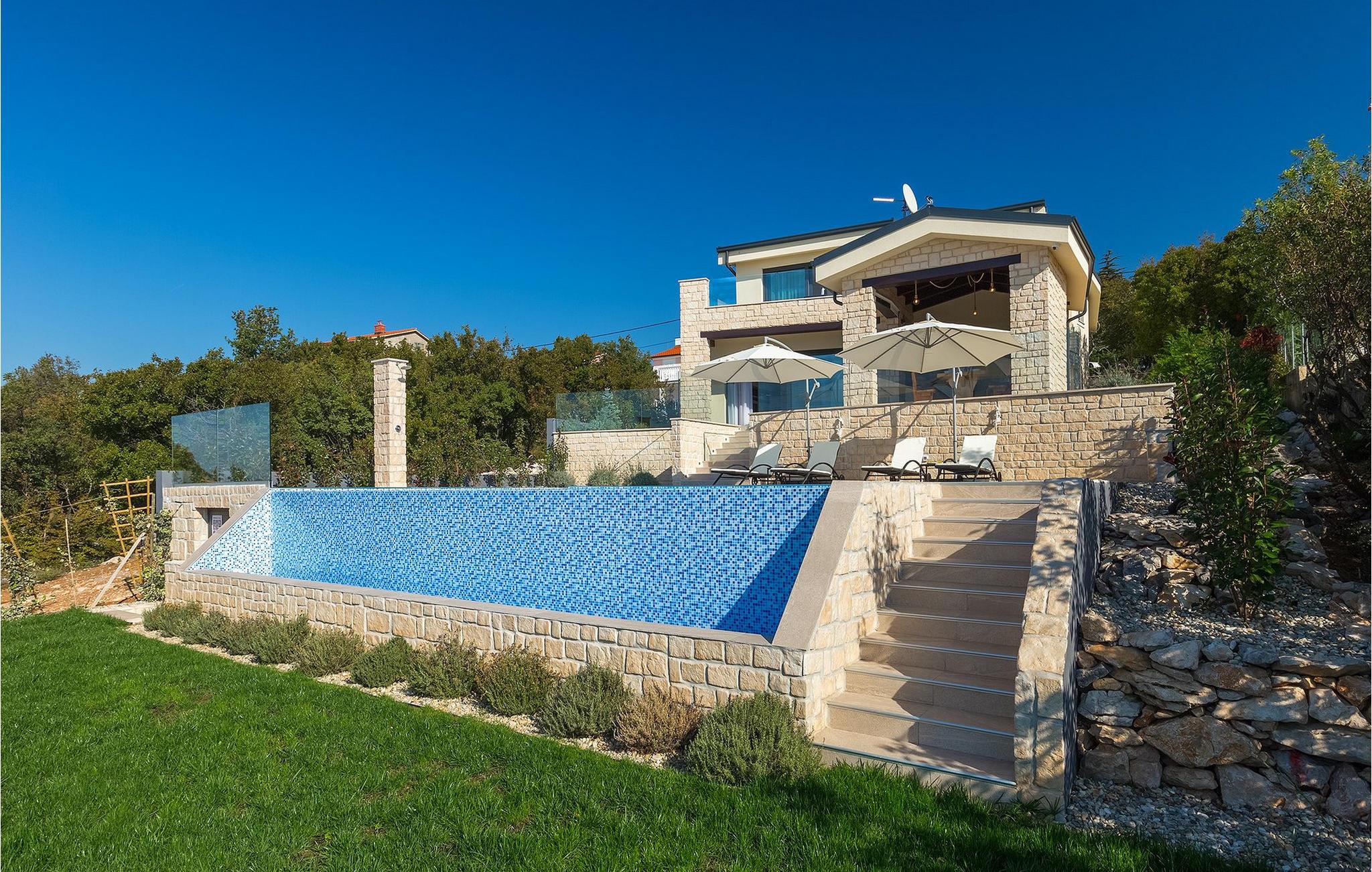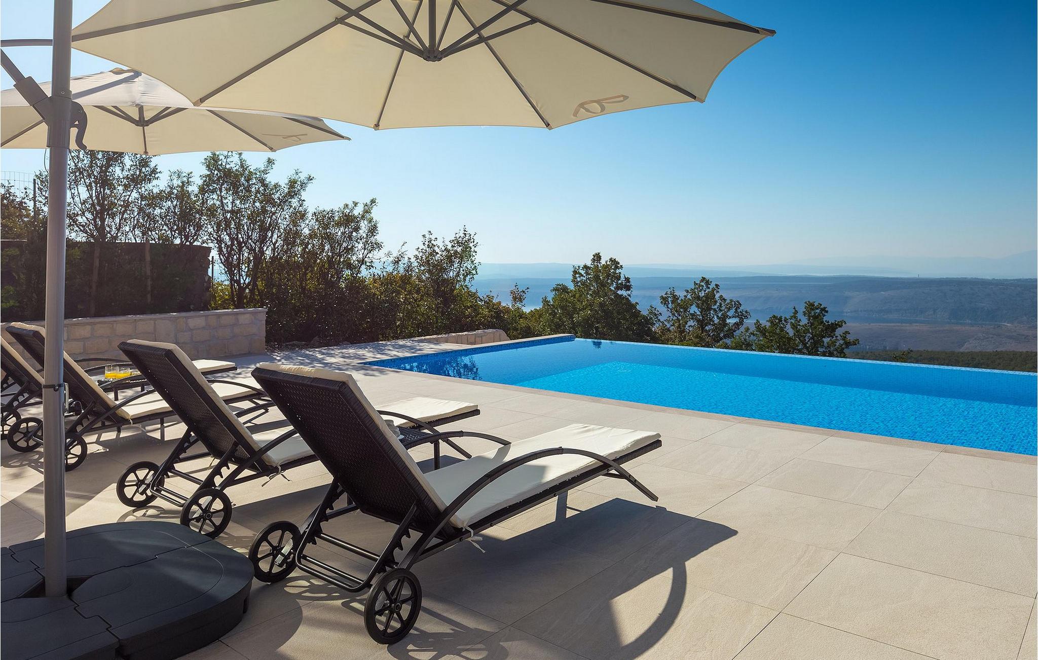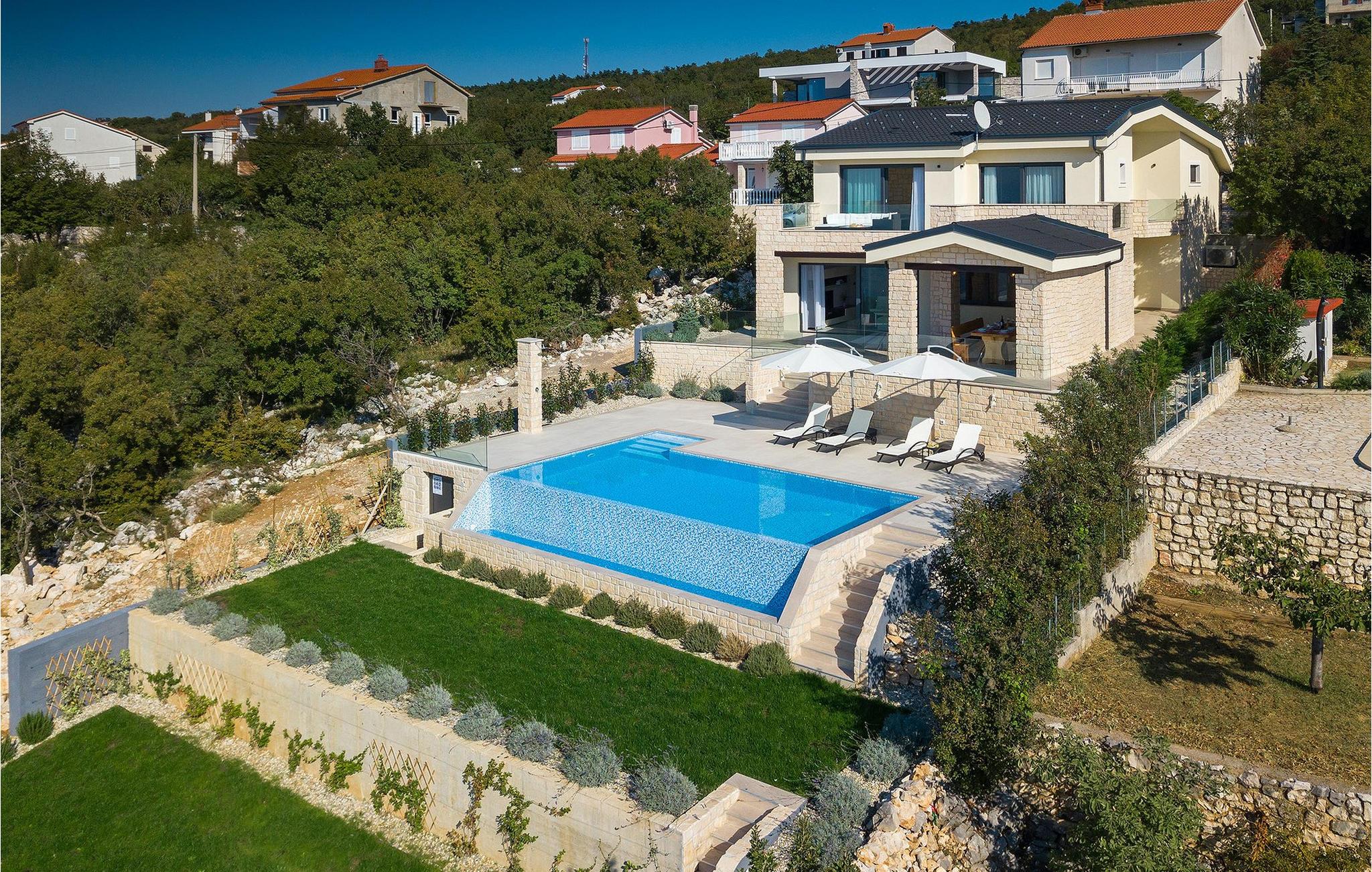 Fra nederste etage har du direkte adgang til den smukke have, også opdelt i etager, med privat pool og rummelig græsplæne. Ved siden af poolen kan du slappe af på en af liggestolene og nyde panoramaudsigten over havet og de omkringliggende øer, eller tilbringe tid med dine venner ved den udendørs spiseplads.