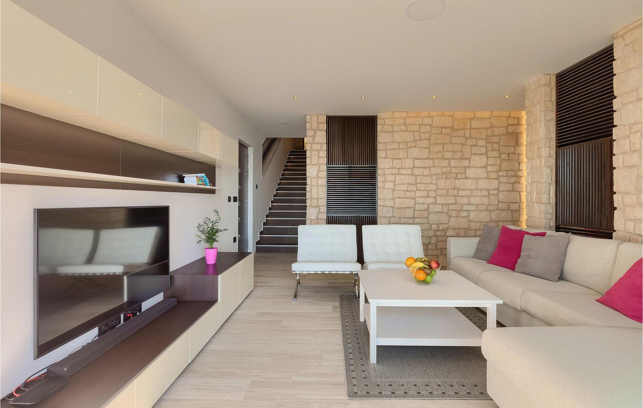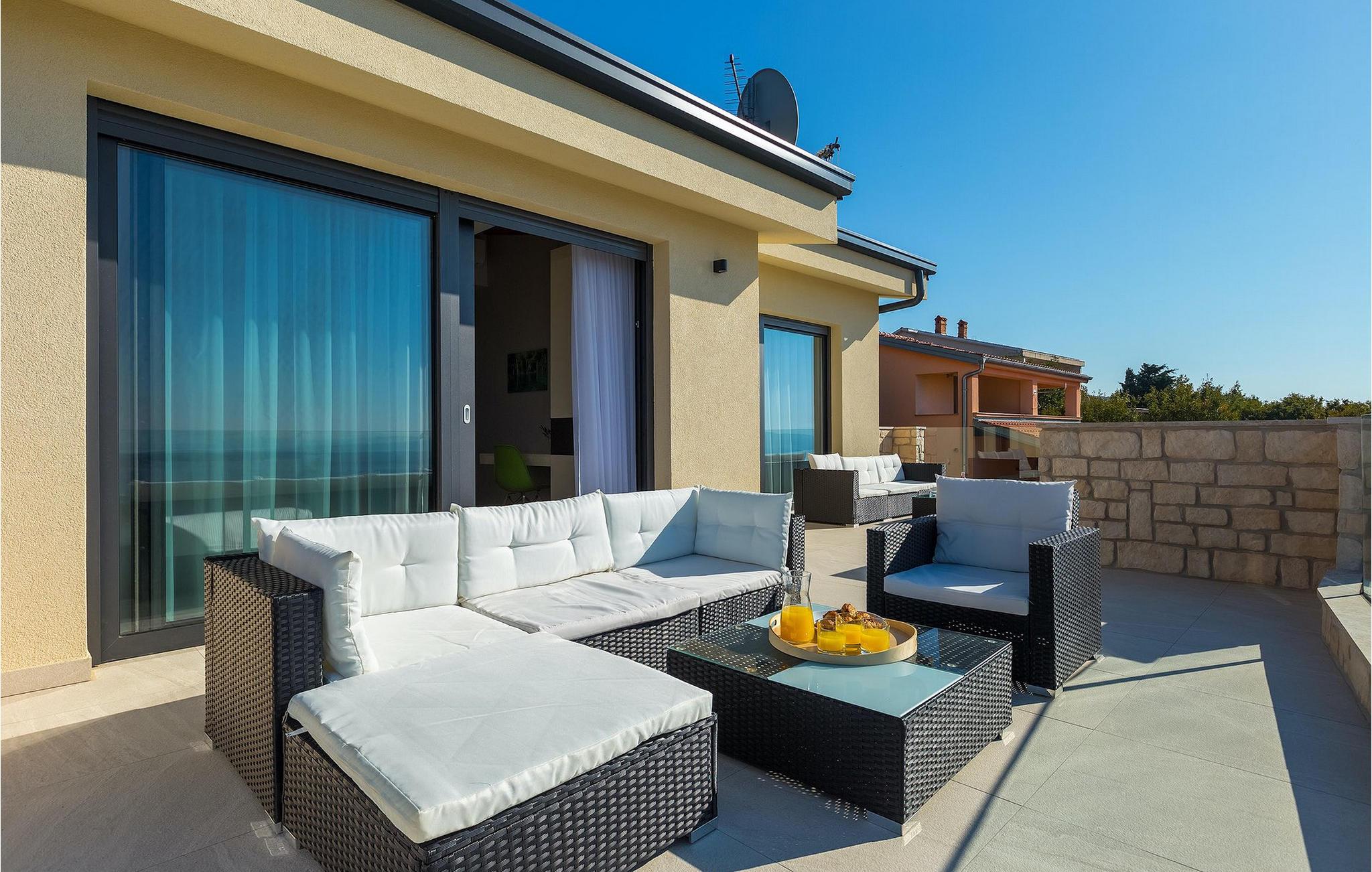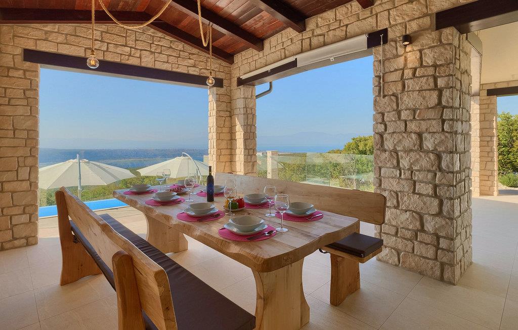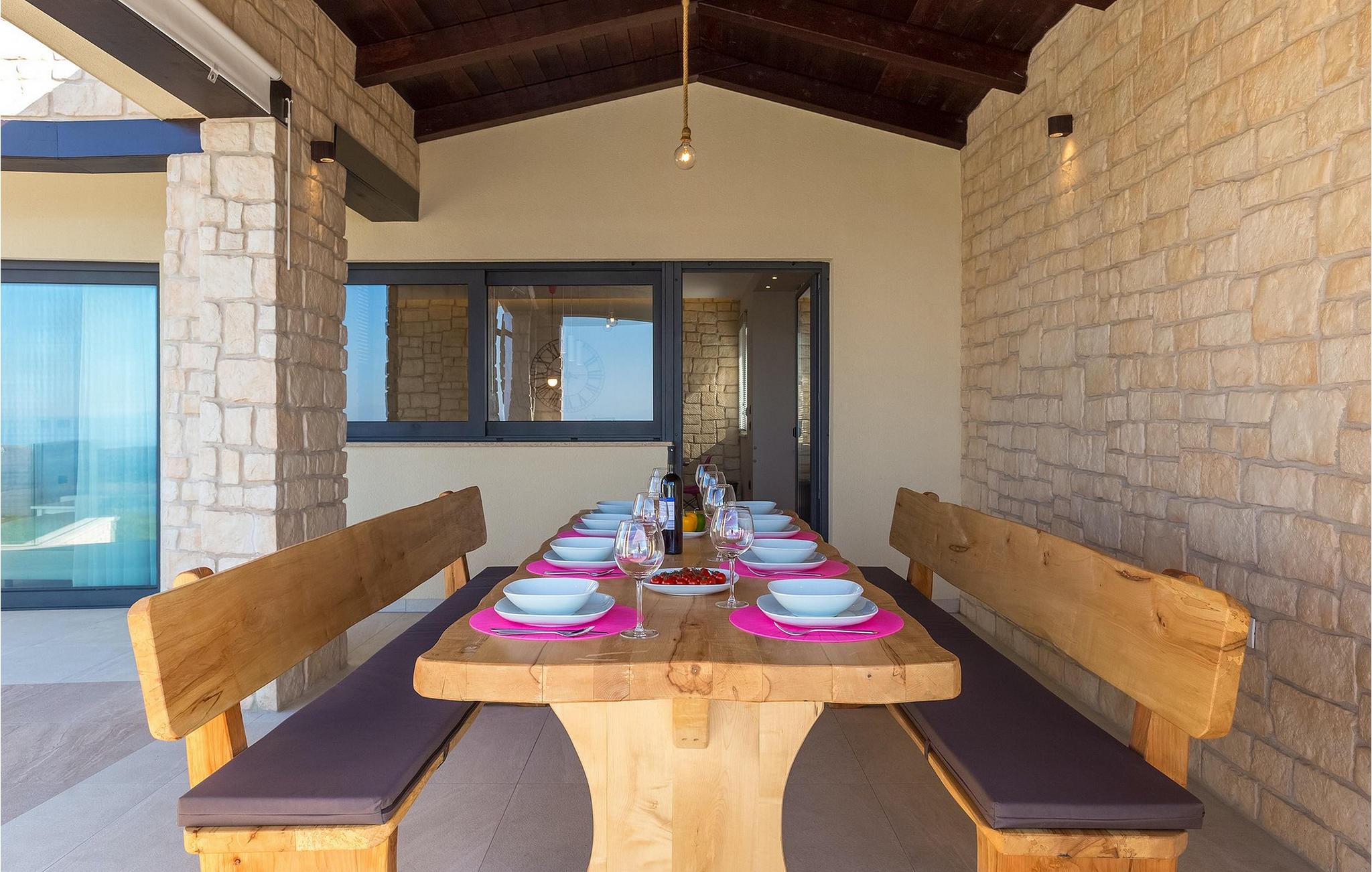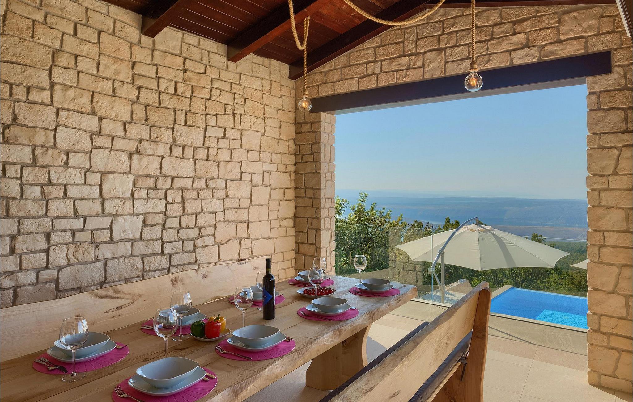 Fra nederste etage har du direkte adgang til den smukke have, også opdelt i etager, med privat pool og rummelig græsplæne. Ved siden af poolen kan du slappe af på en af liggestolene og nyde panoramaudsigten over havet og de omkringliggende øer, eller tilbringe tid med dine venner ved den udendørs spiseplads.