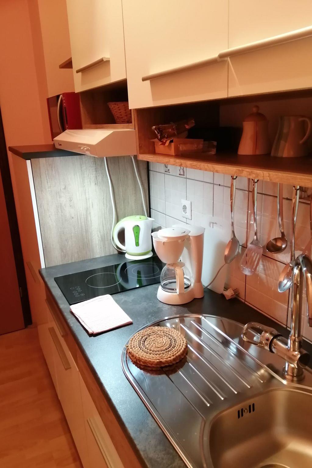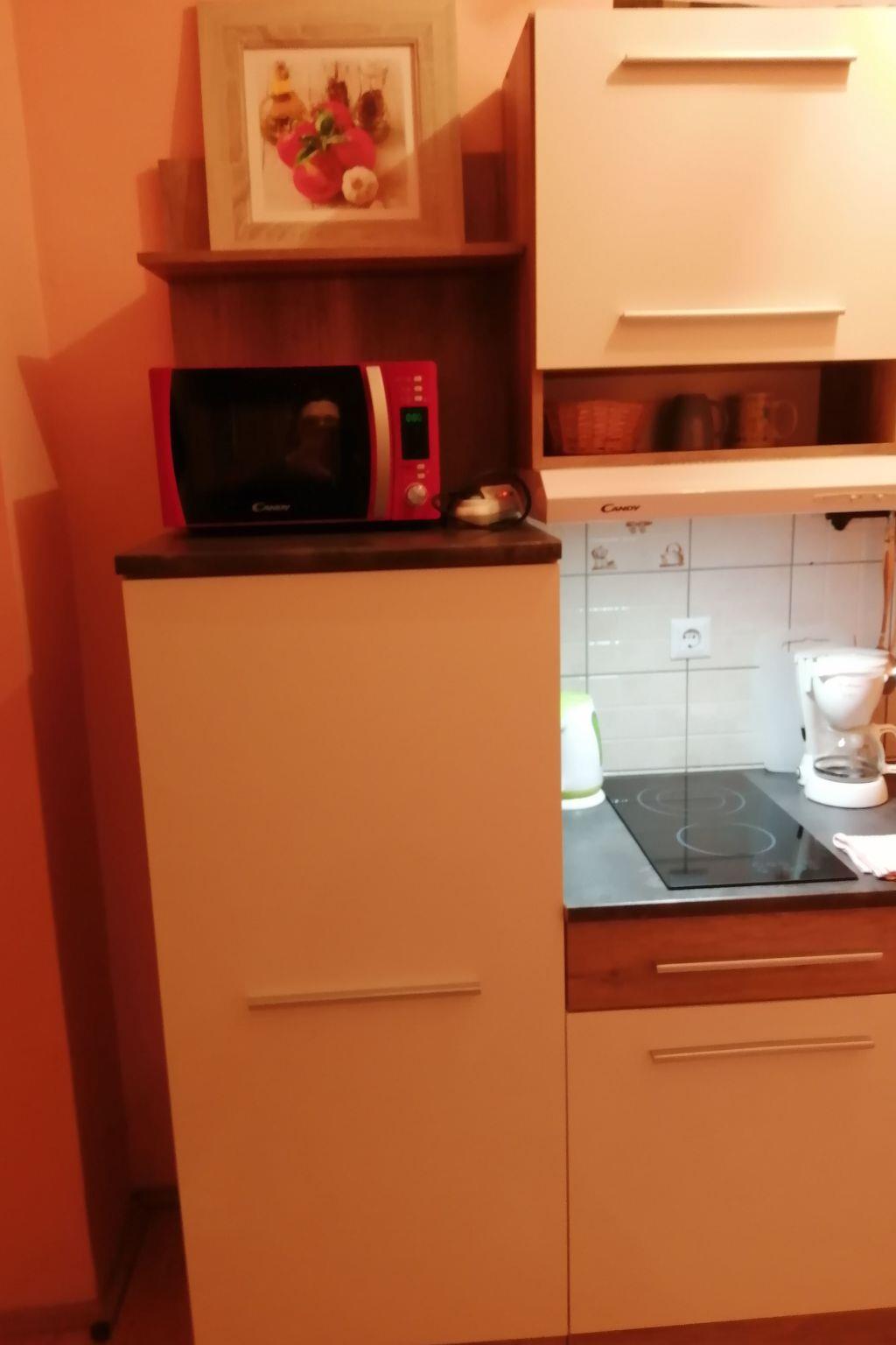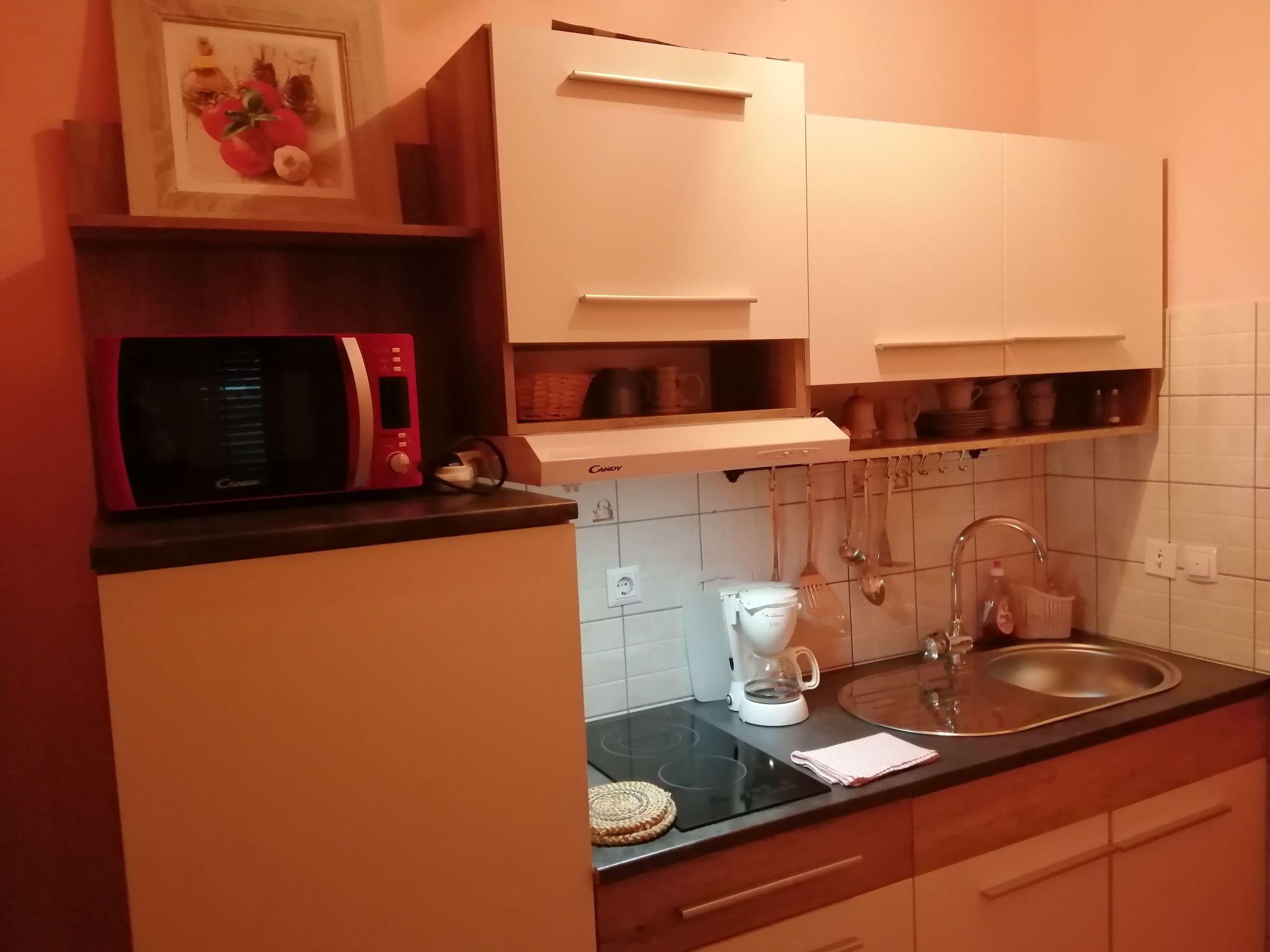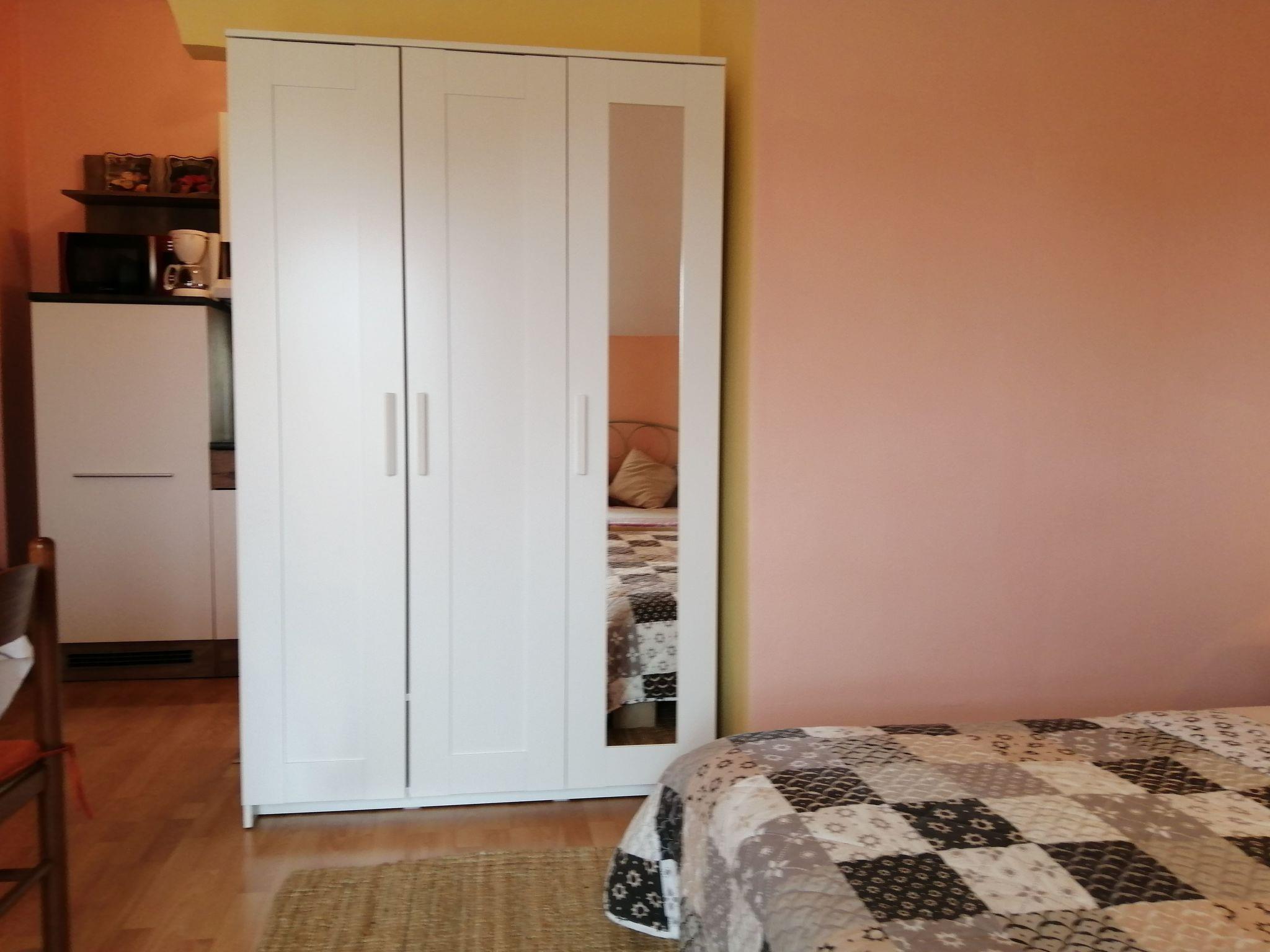 This fully furnished and equipped studio has a combined living and sleeping room with a double bed, a single bed, a sofa (armchair bed), and air conditioning. It is especially suitable for a family with two small children. The kitchen is small, providing two hotplates and a fridge. The bathroom has a shower. Internet access is available.