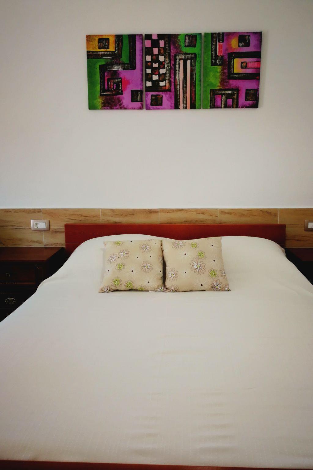 The kitchen is equipped with stove, oven, kettle, fridge and coffee machine. Dining table has 3 chairs. Living area is also sleeping space. There is a sofa that can be transformed into bed (1,40 x 2m). There is also a double bed (1,6 x 2m), two cabinets and a closet. The bathroom has a toilet, basin, shower and washing machine. On request, we can offer you a baby cot. All in all, you have your peace and quietness.