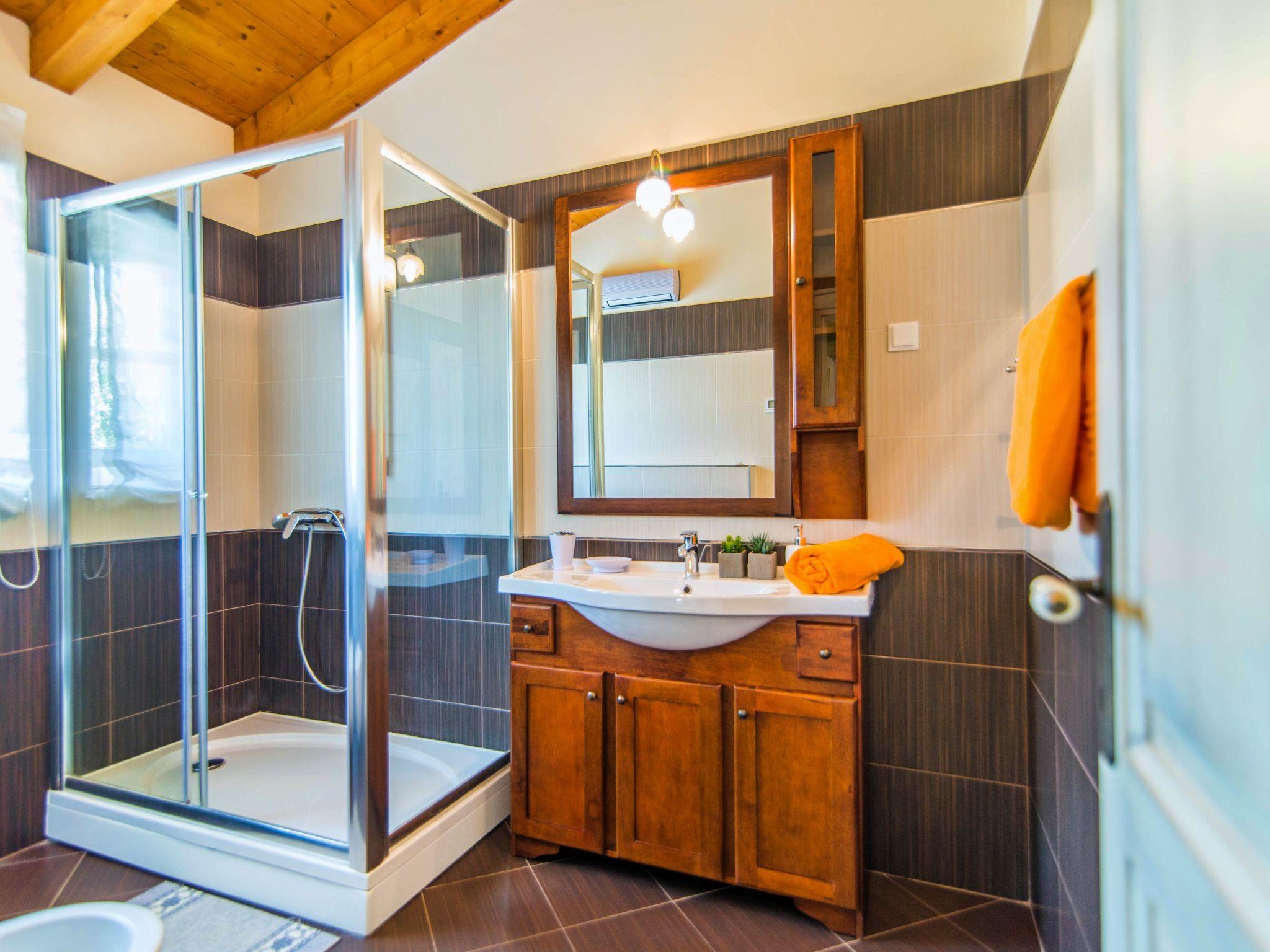Inside, the villa boasts a spacious and elegantly designed ground floor, where wooden beams and a charming fireplace create a warm and inviting atmosphere. The open-plan layout includes a stylish living room, dining area, and a modern, fully equipped kitchen. This level also features a guest toilet, two double bedrooms, and two bathrooms.