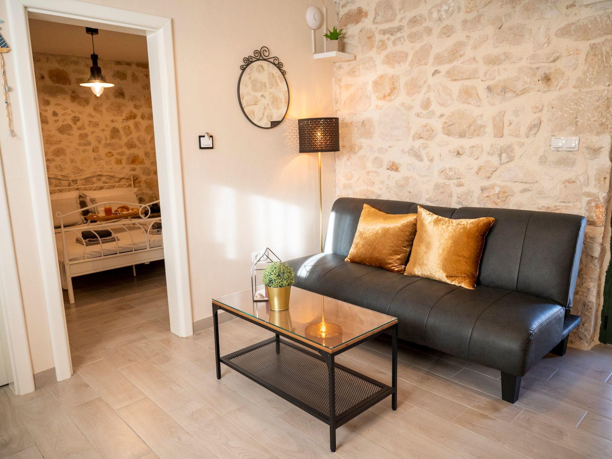 The ground floor has stone walls and details that emphasize the authenticity of the apartment. The ground floor is about 33 m² in size and comprises of the following rooms: A living room, a flatscreen TV and a sofa bed. There is also a bedroom next to it, which includes a double bed. Plus there is a fully-equipped kitchen with microwave, electric kettle and a dining area, as well as an bathroom with a toilet and shower.