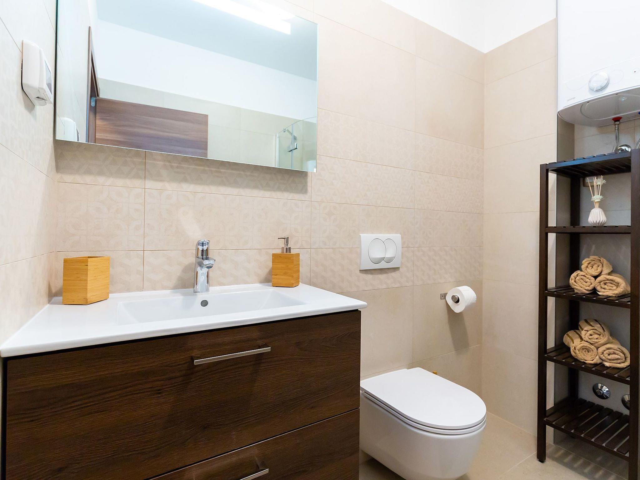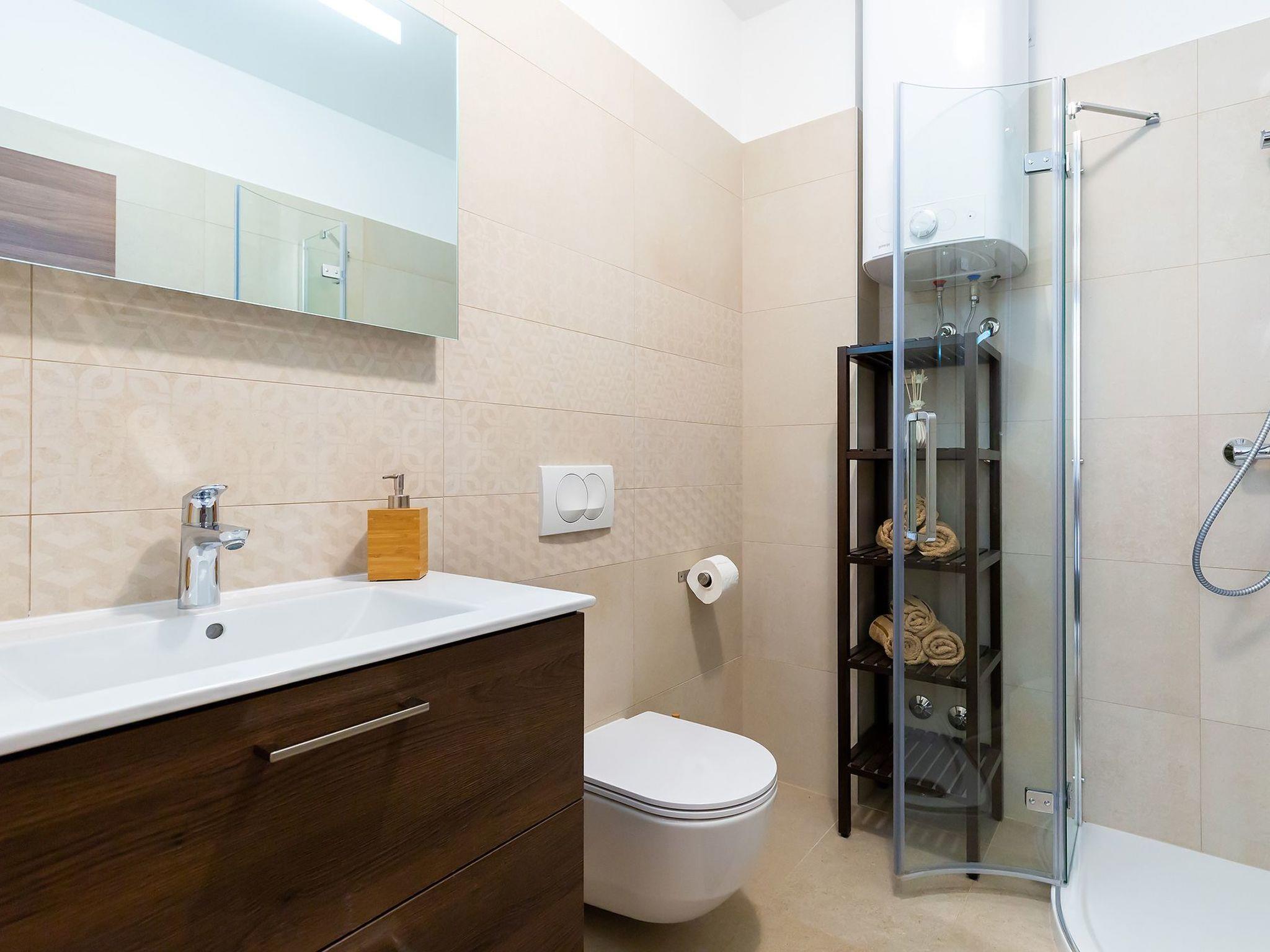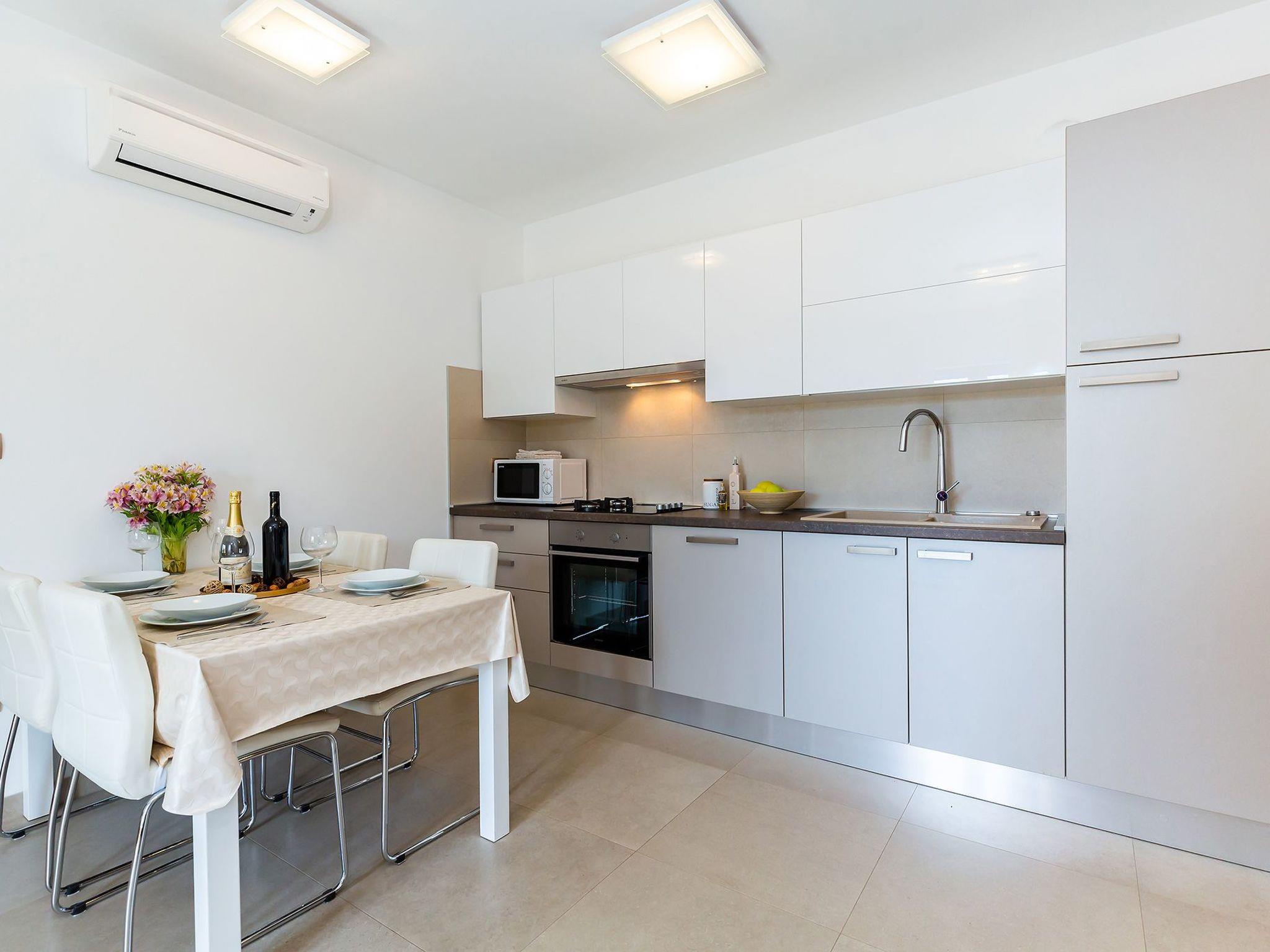 The air-conditioned apartment is on the first floor and can accommodate four people. The living and dining room with the kitchen provides a sofa, a flatscreen TV and a dining table with four chairs. The kitchen unit is fully-equipped. The two bedrooms are each furnished with a kingsize double bed and a wardrobe. The bathroom comprises a shower, washbasin and toilet. Wi-Fi Internet is available.