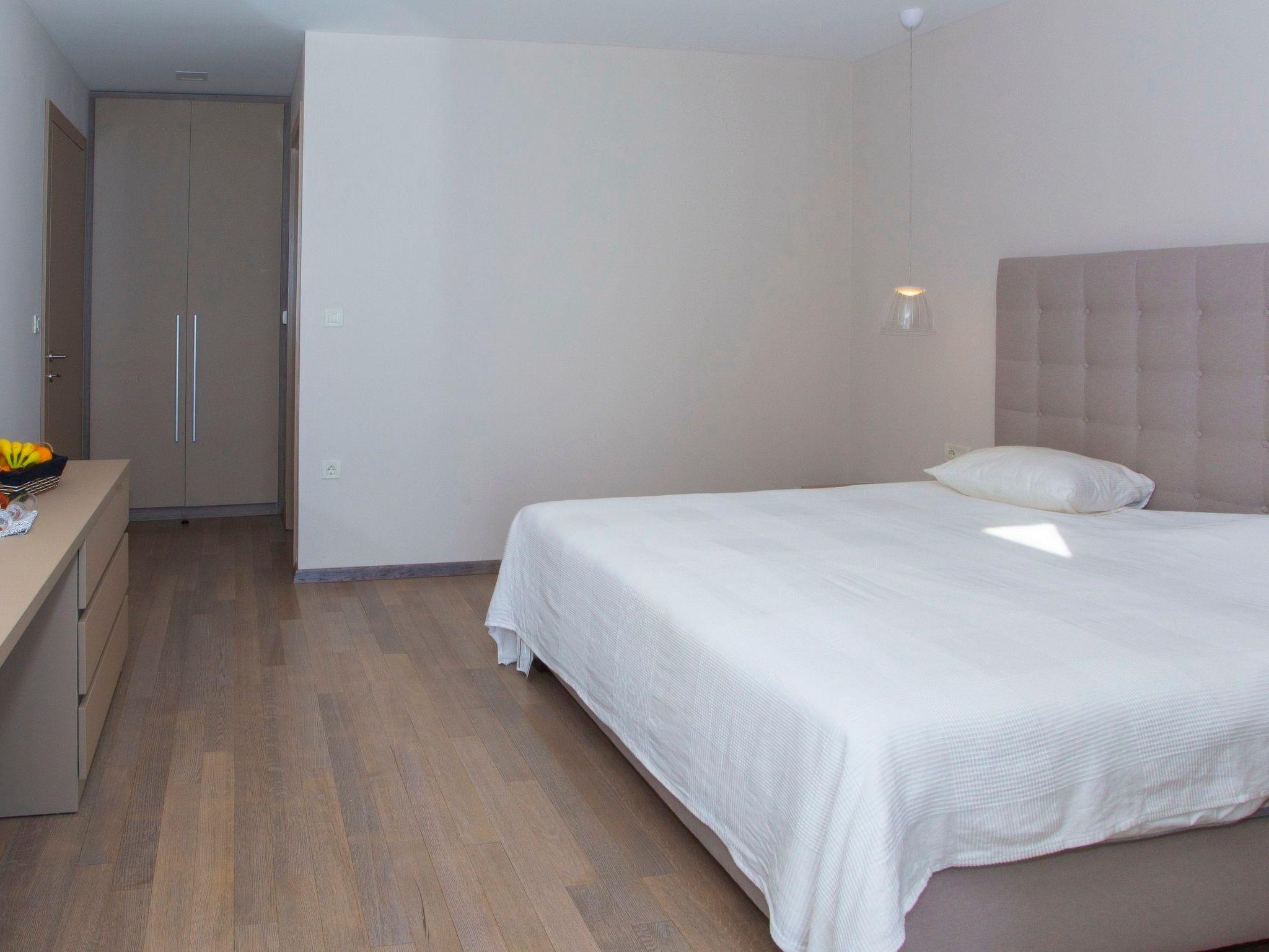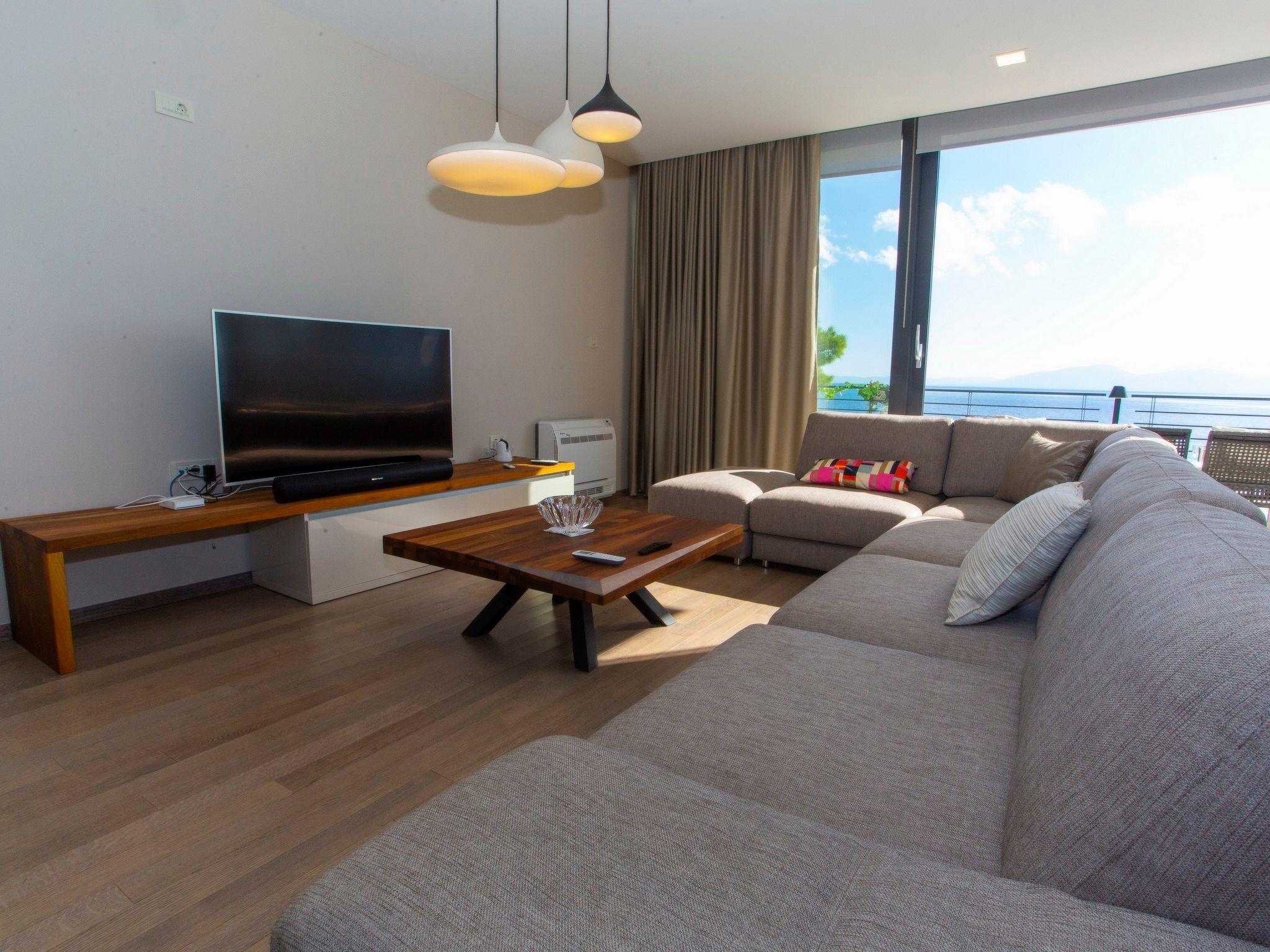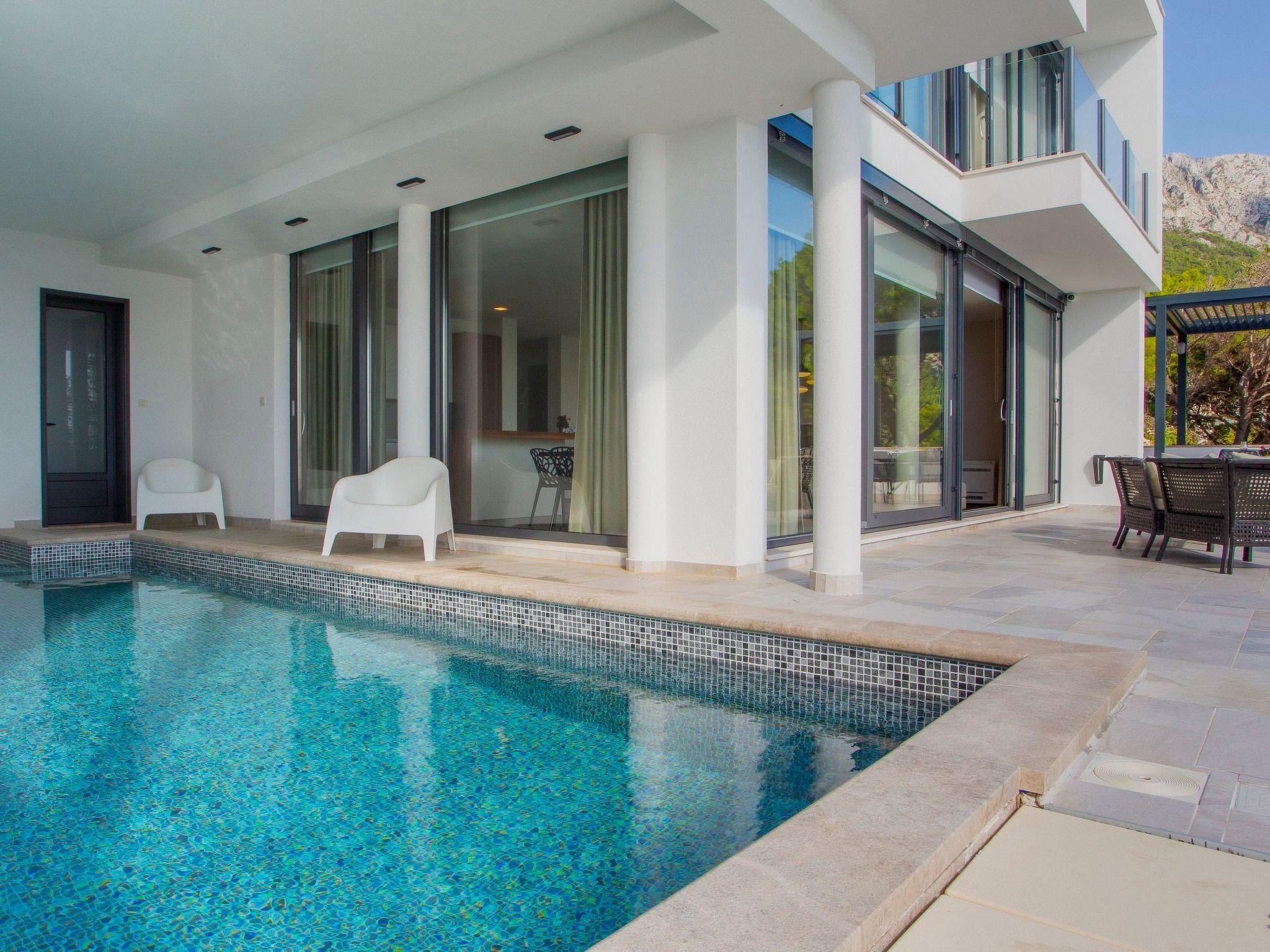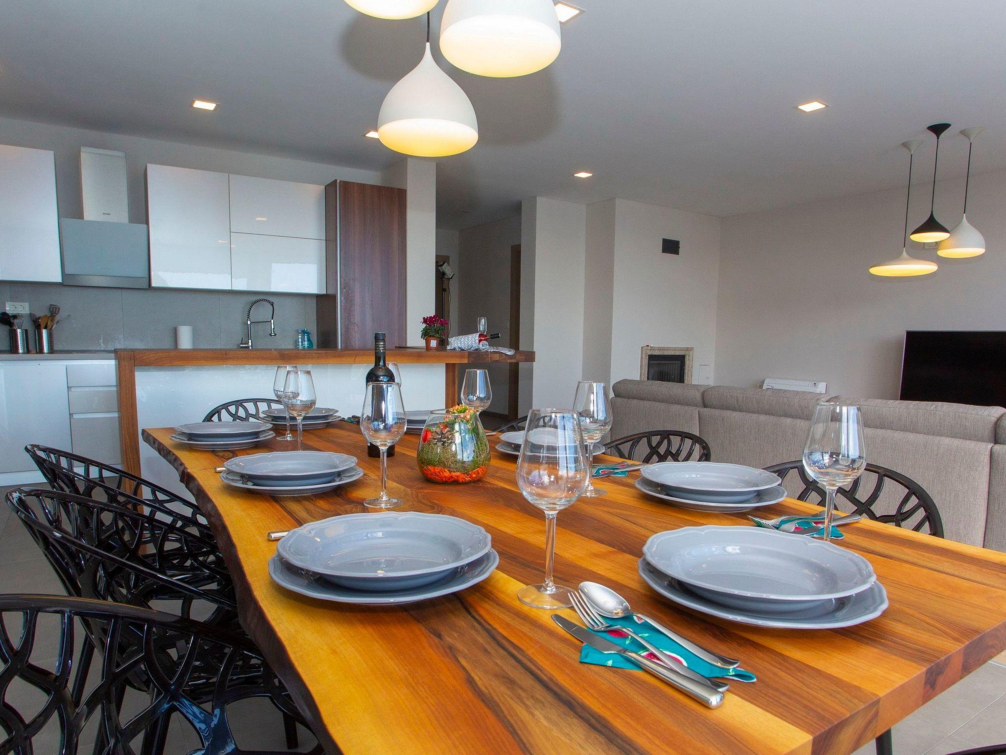 The villa’s exterior is nothing short of a paradise, offering panoramic sea views from its balcony and a private pool that serves as the centerpiece of relaxation. Surrounding the pool is a spacious terrace equipped with sun loungers, an outdoor dining table, and a grill, perfect for entertaining, whether it’s a family barbecue or a serene sunset dinner. The allure of dining under the stars or sunbathing with the backdrop of the Adriatic’s soothing hues is an experience in itself.